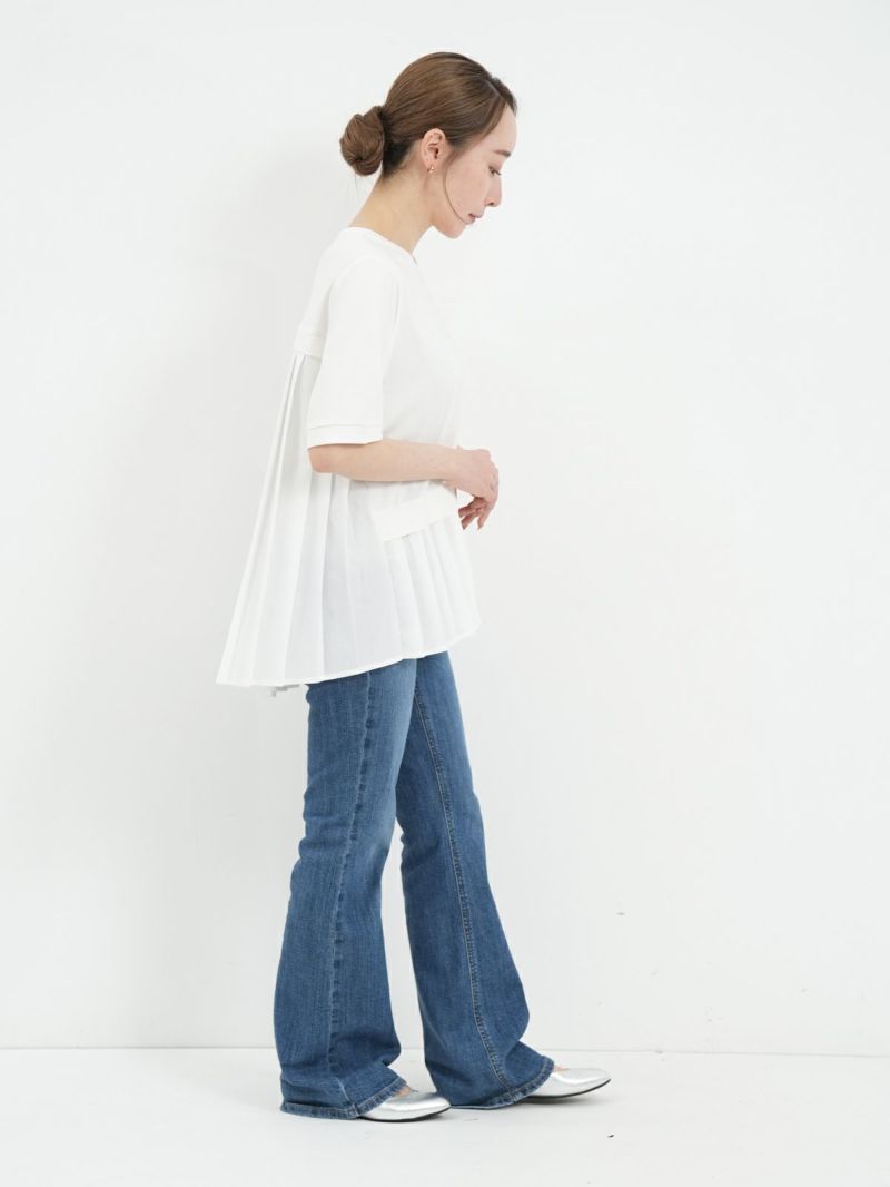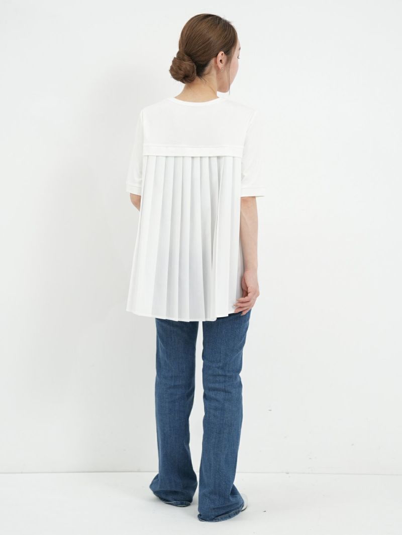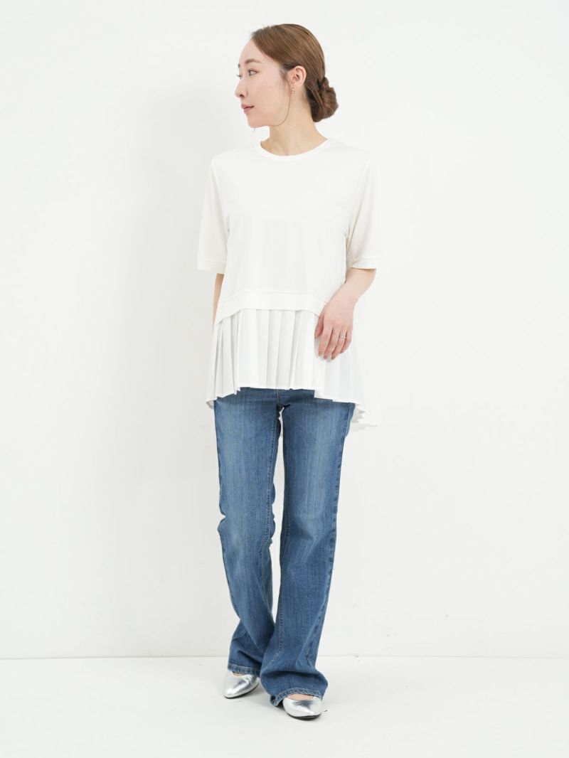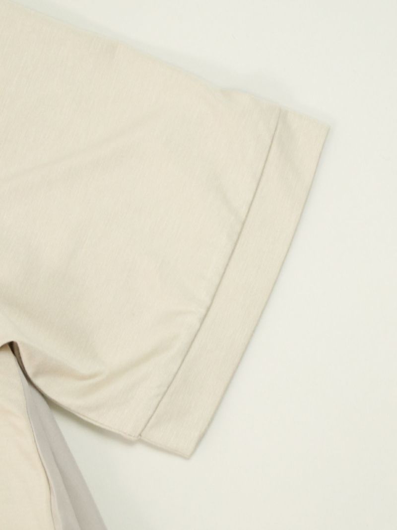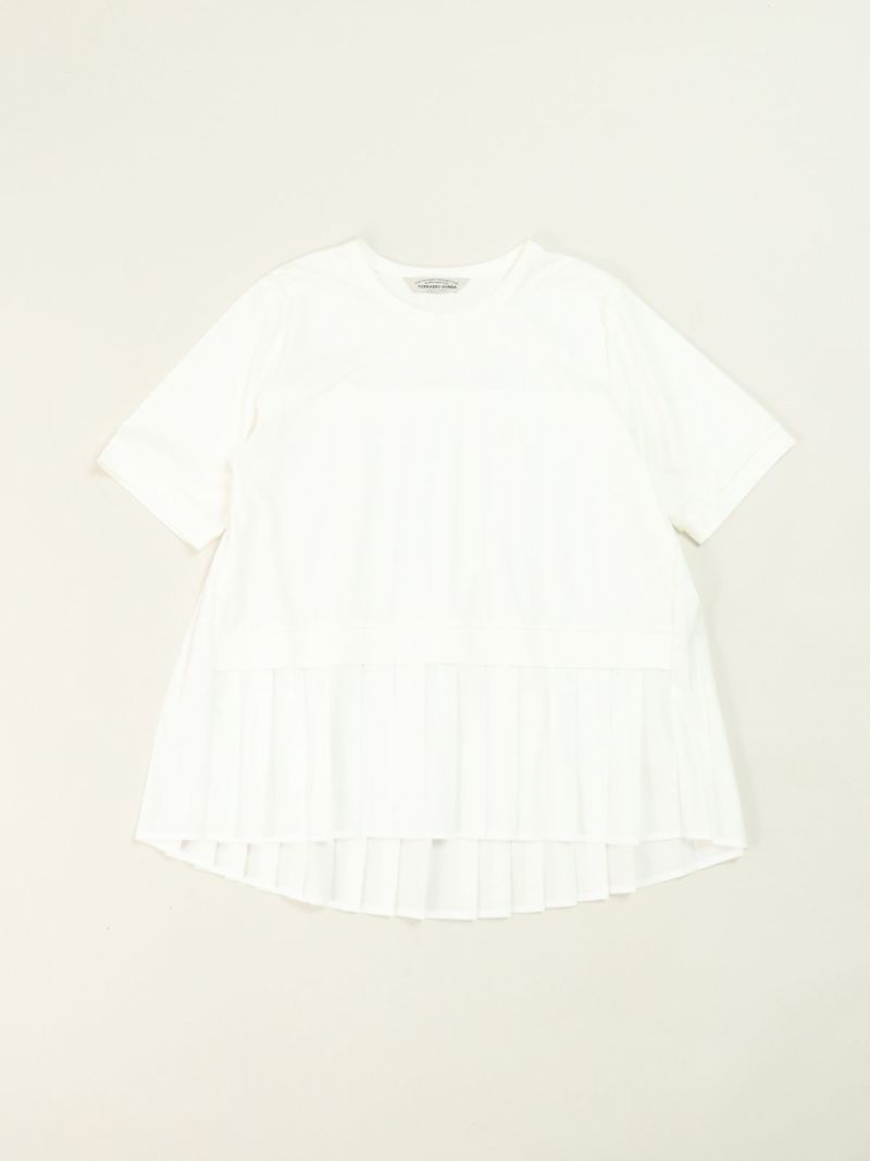 カットソーにプリーツ加工したシャツ生地をハイブリッドしたTシャツ。 プリーツ部分がシャツ生地なのでカジュアル過ぎず、スラックスなどと合わせていただければ、セミフォーマルにも着用可能です。