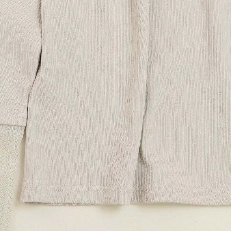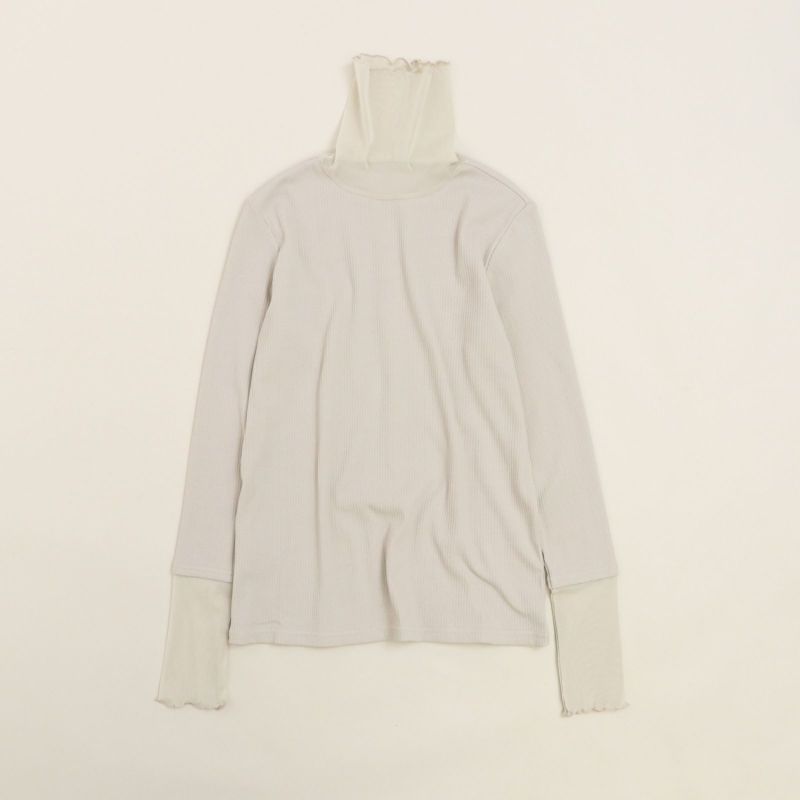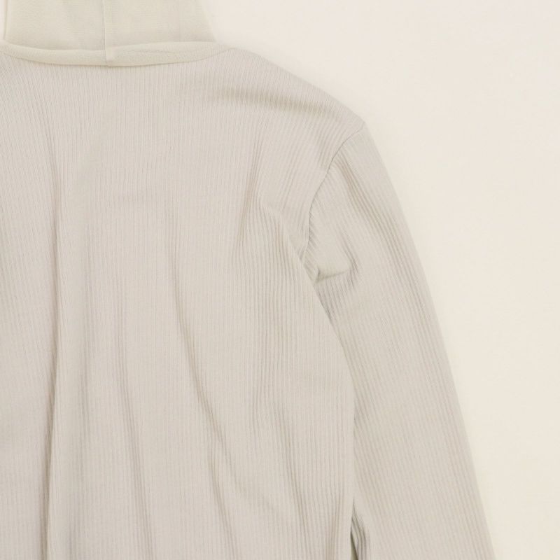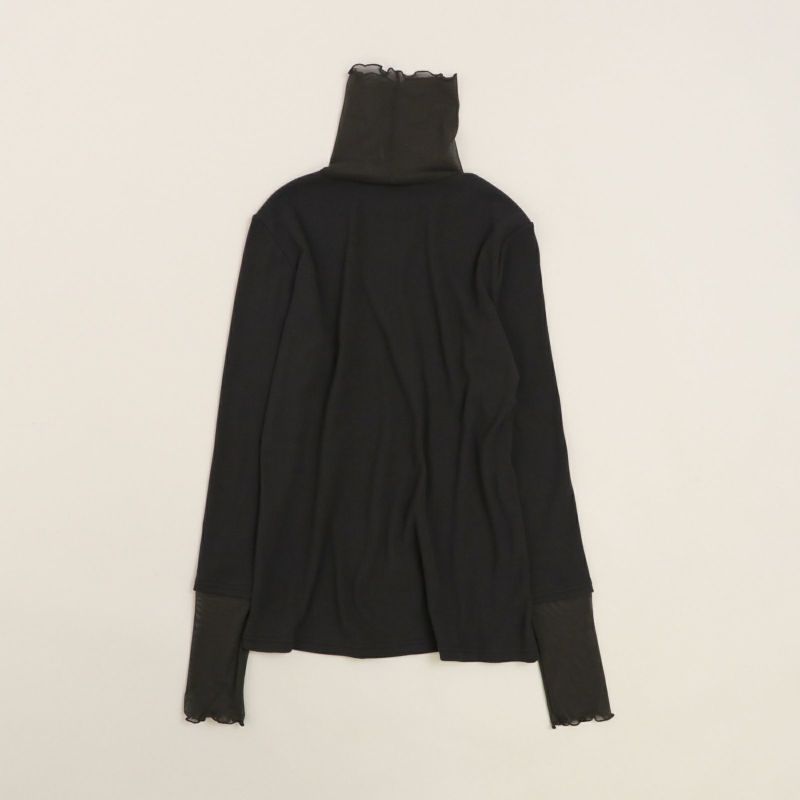 タートル部分と袖口にチュールを施したリブタートル。 身頃にはドライタッチな強撚ランダムベアテレコを使用し、透け感を気にすることなく着用していただけます。(Whiteのみやや透け感あり)