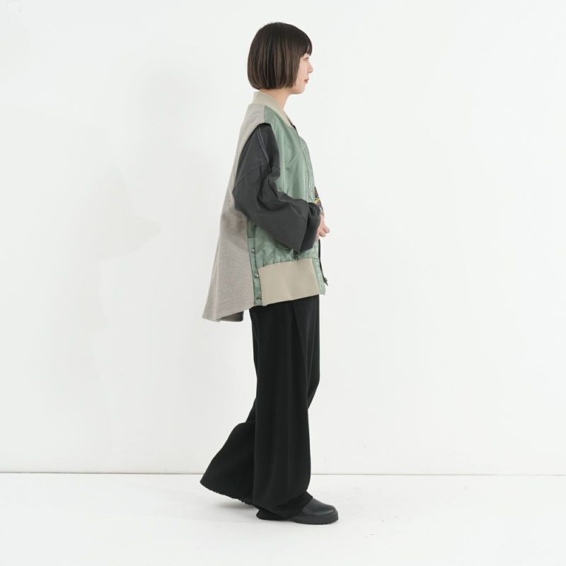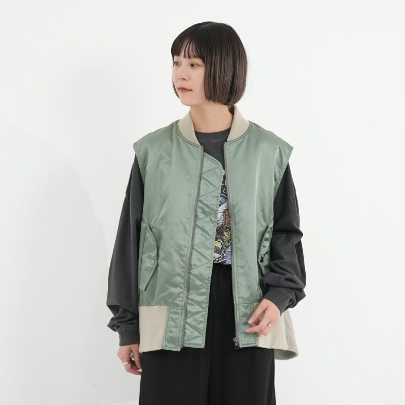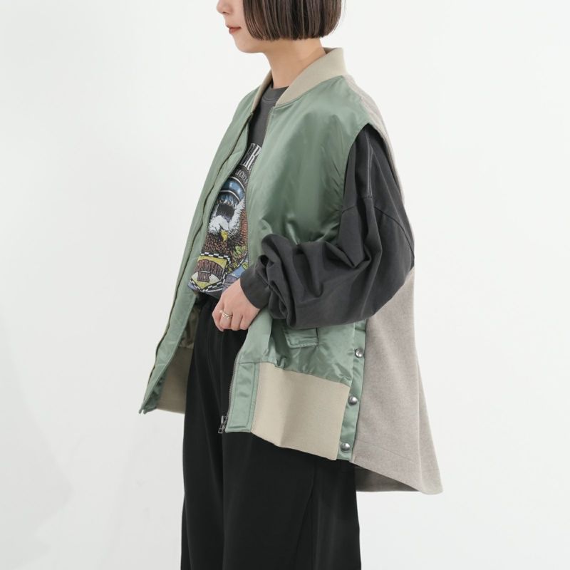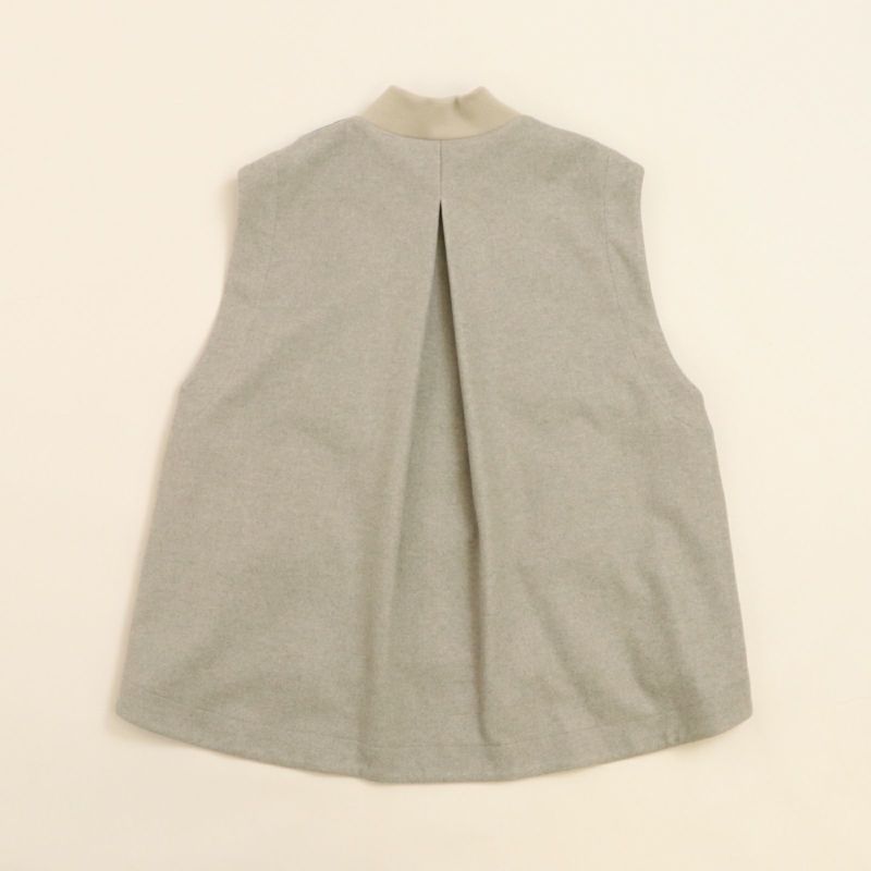 深みのある光沢と滑らかさが特徴の中綿入りナイロンとウール見えするジャージをドッキングさせたAラインジレ。 女性らしいデザインに見えるように拘りました。アームホールは広めに設計されておりインナーのサイズ感も気にせずに着用していただけます。