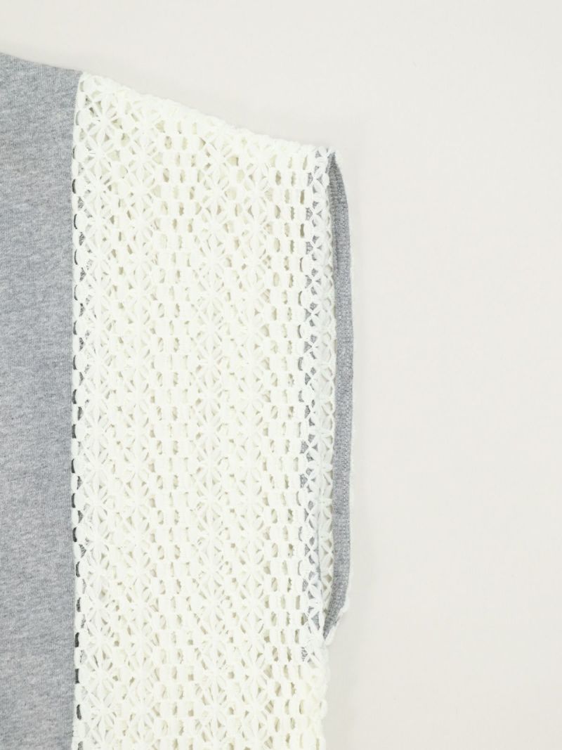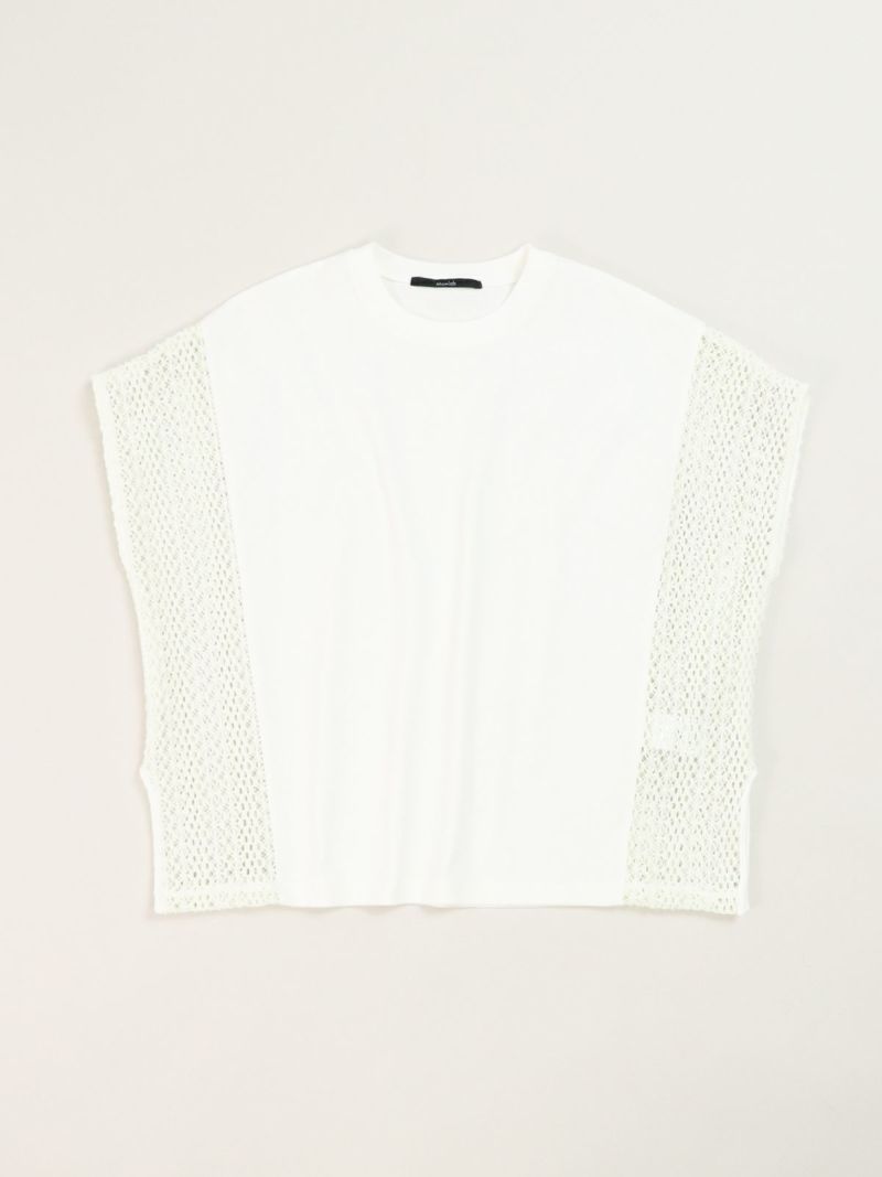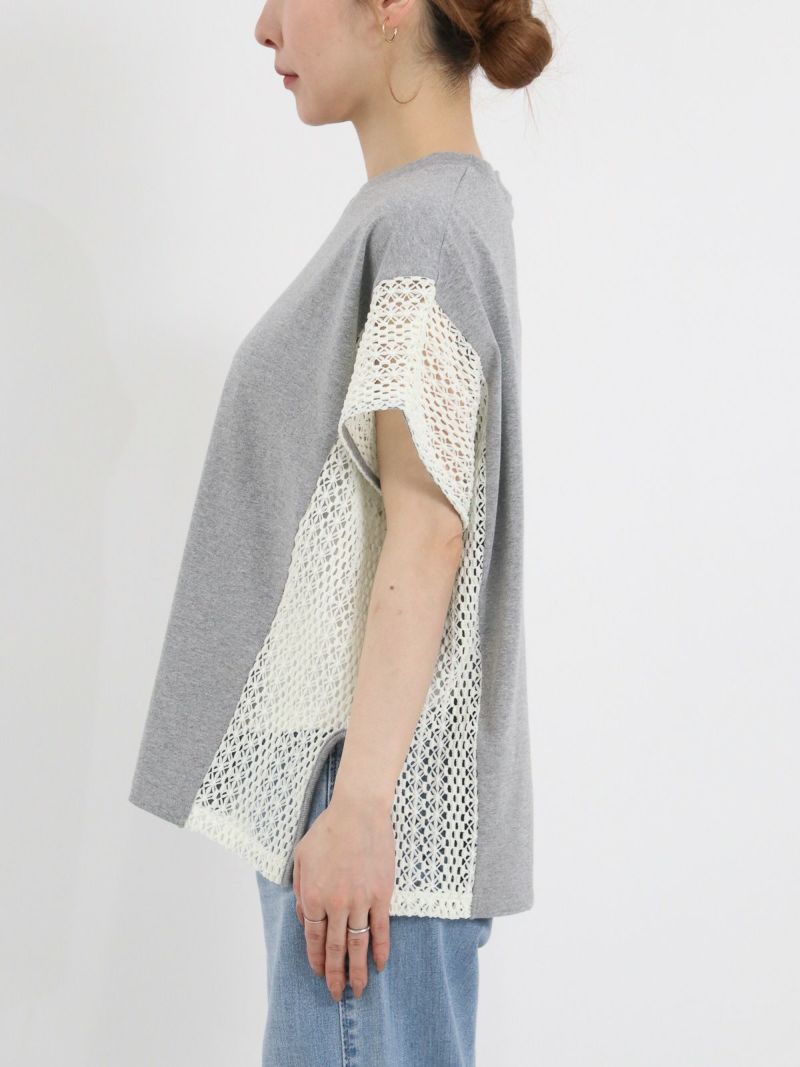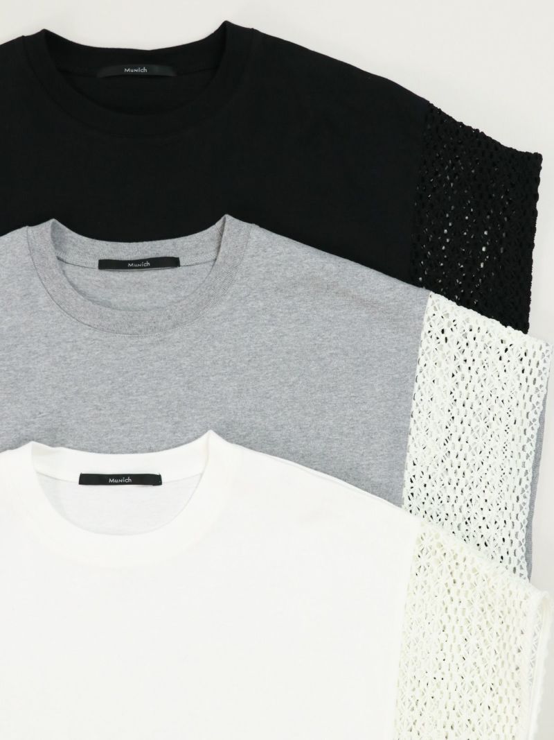 前後差のある丈感がポイントのドッキングTシャツ。 一見シンプルなTシャツですが、センターバックにライン状にシアー素材を切り替えアクセントに。 後ろ裾にはゴムギャザーを施し動きのあるデザインにしています。