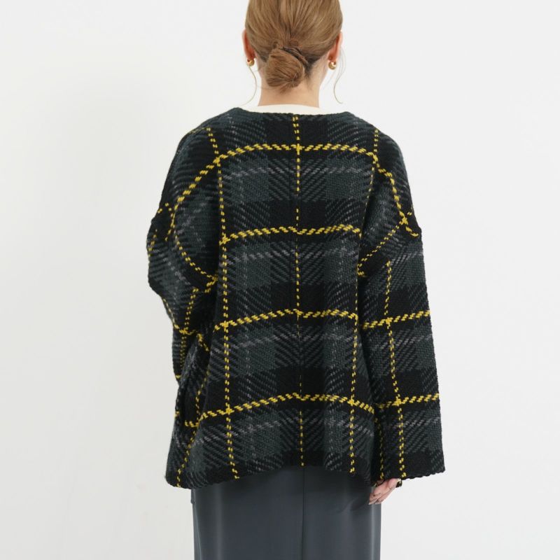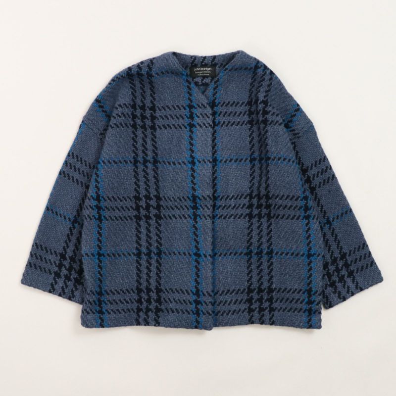 John Branigan(ジョン・ブラニガン) Vネックのゆったりとしたシルエットのノーカラージャケット。 他にはないニットの技術で編み上げられるツイード生地は、軽さと柔らかさが特徴です。ニット素材なので気軽に羽織りやすく、ウール混で暖かい1枚です。