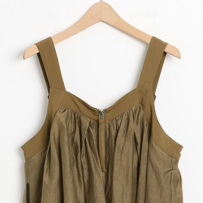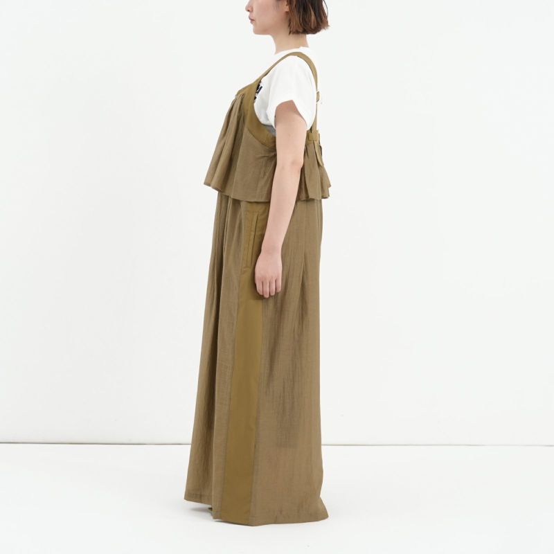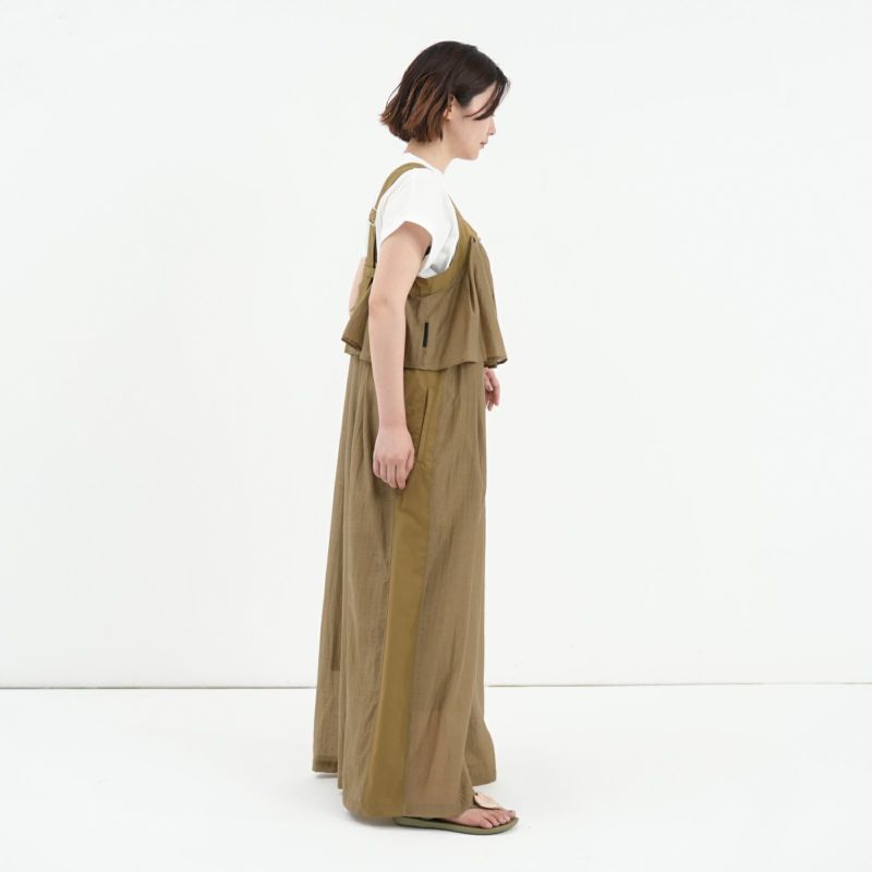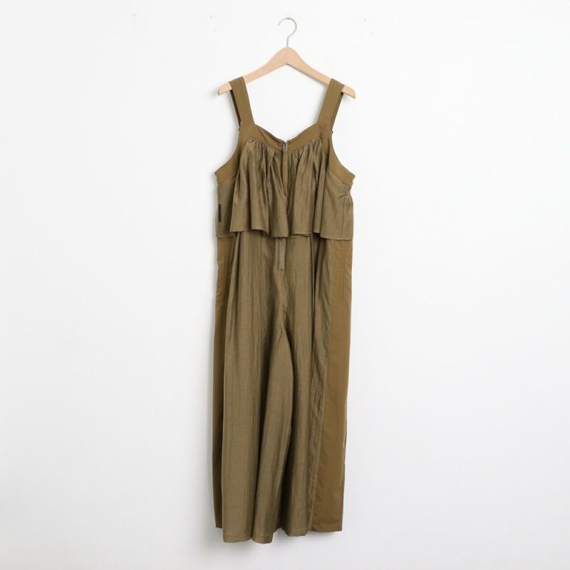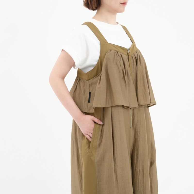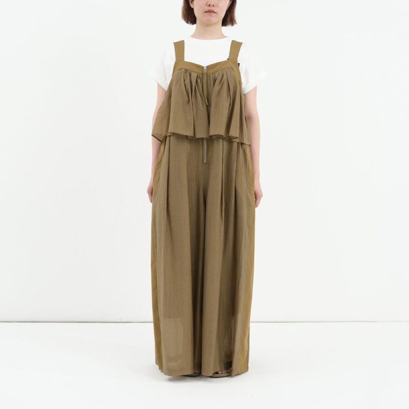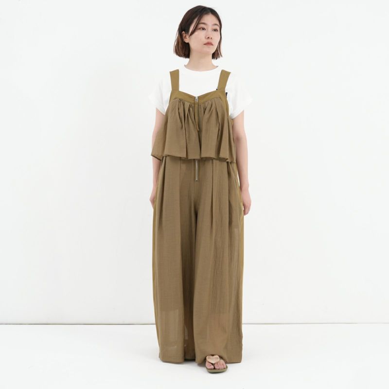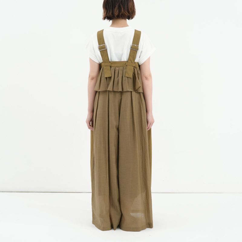 吊りサロペット型のパンツ。 胸元にフリルをあしらい、フェミニンさとシャープさを融合させた人気のアイテムです。 さらりとした素材感で汗ばむ夏~初秋まで着まわせます。
