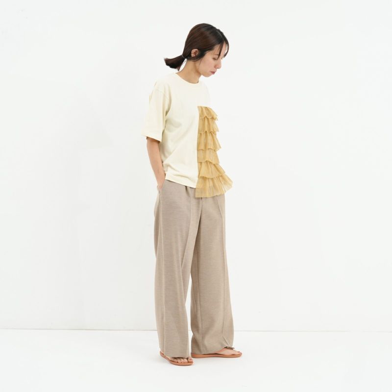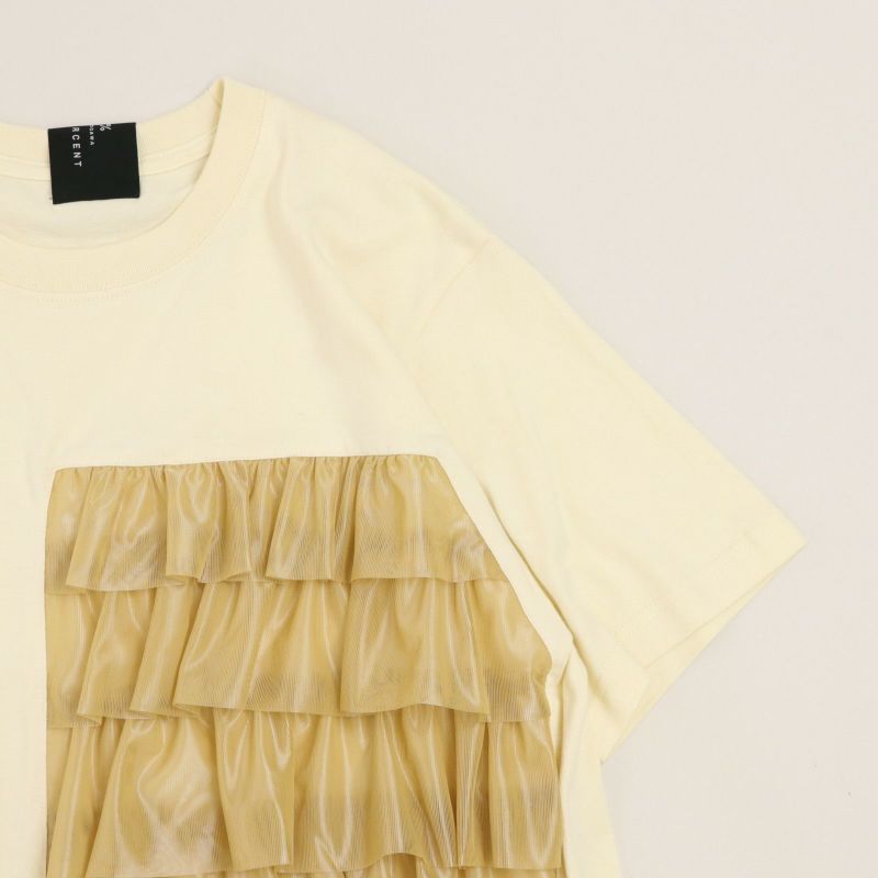 アメリカ製の新品のTシャツを額縁の形にくり抜き、細いフリルとドッキングさせた異素材との組み合わせが新鮮なTシャツです。