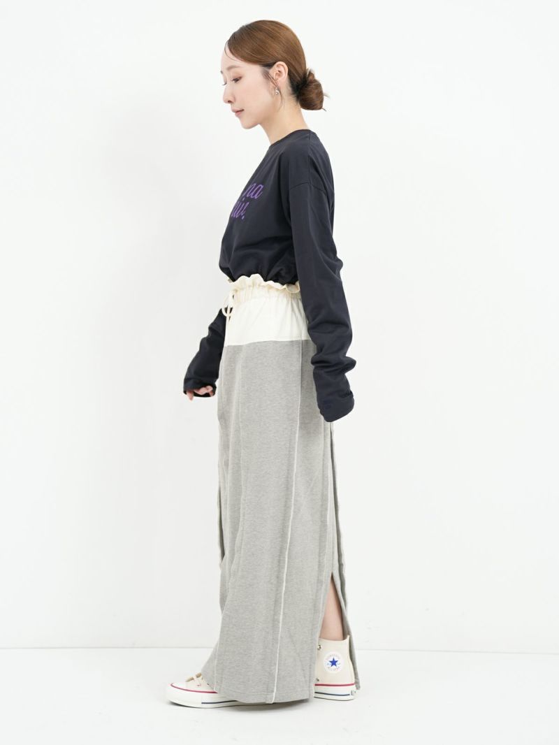 異素材をドッキングしたデザインのスウェットロングスカート。