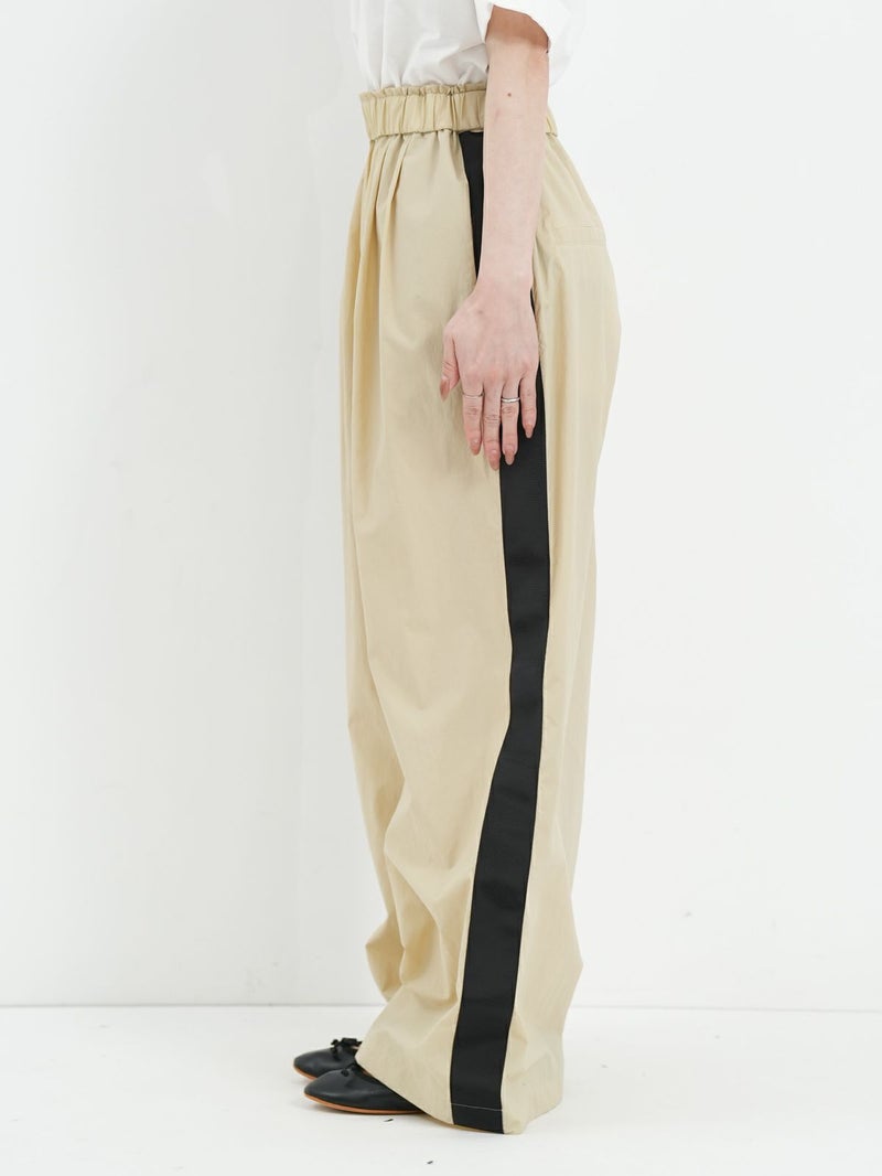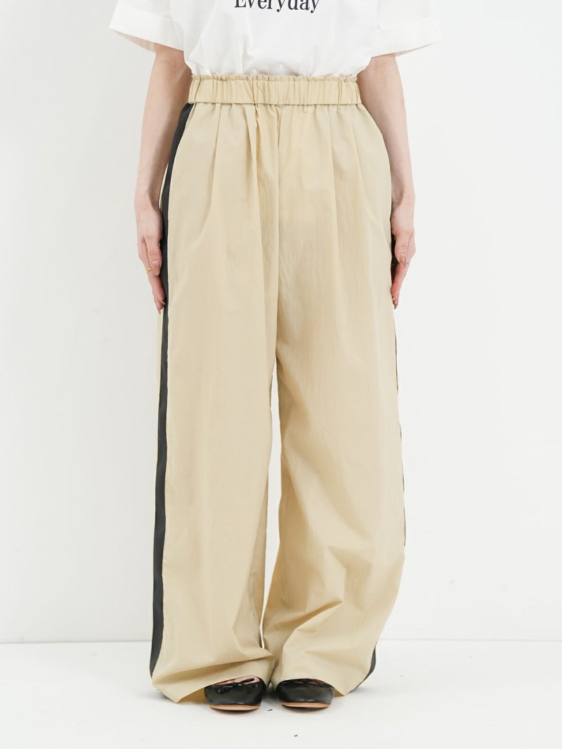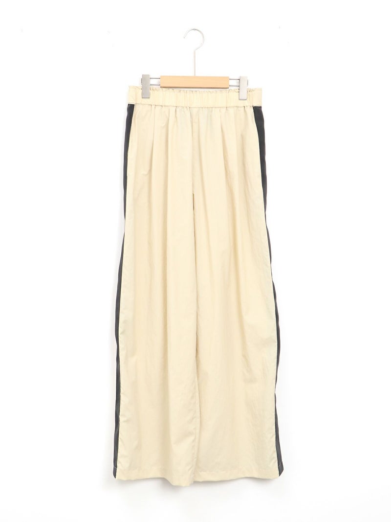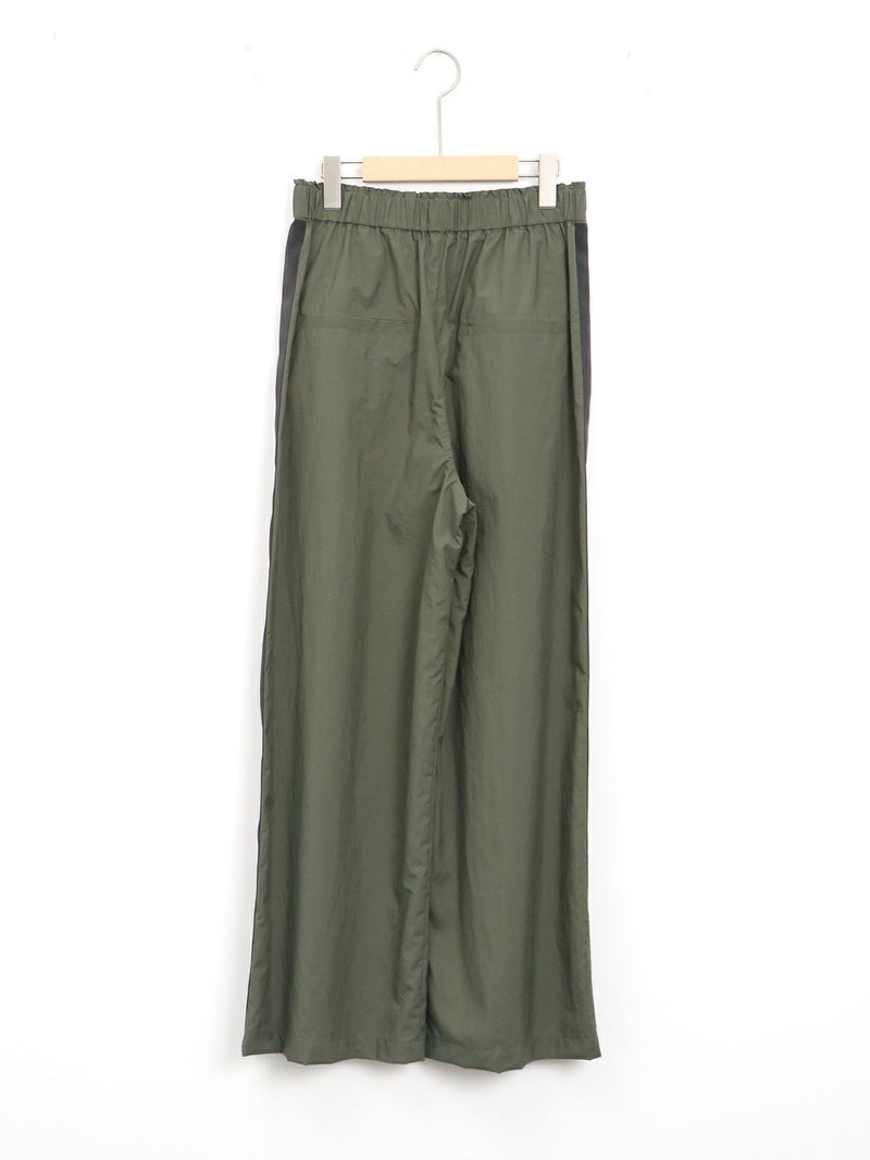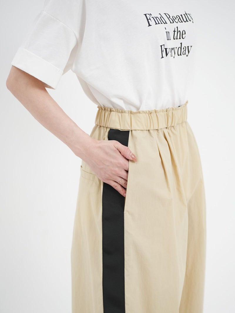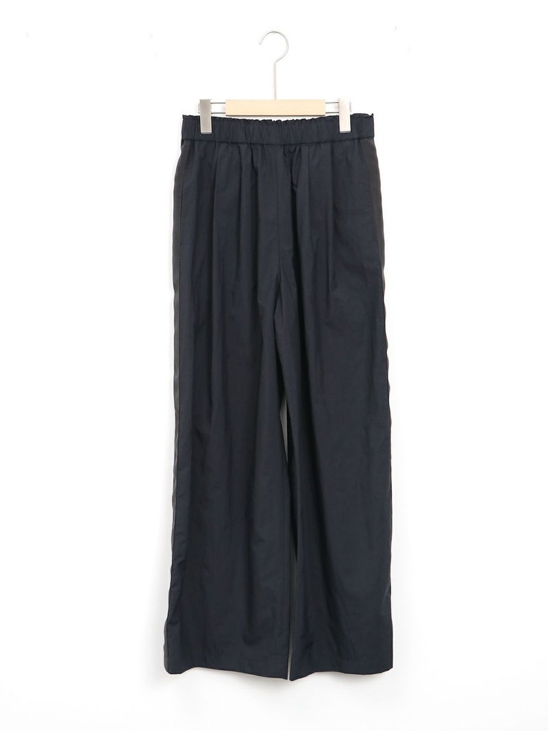 軽量で、撥水加工のタフタを使用したワイドパンツ。 サイドのグログランテープのラインがアクセント。落ち感のあるストレートワイドシルエットがコーディネートに抜け感をプラスしてくれます。