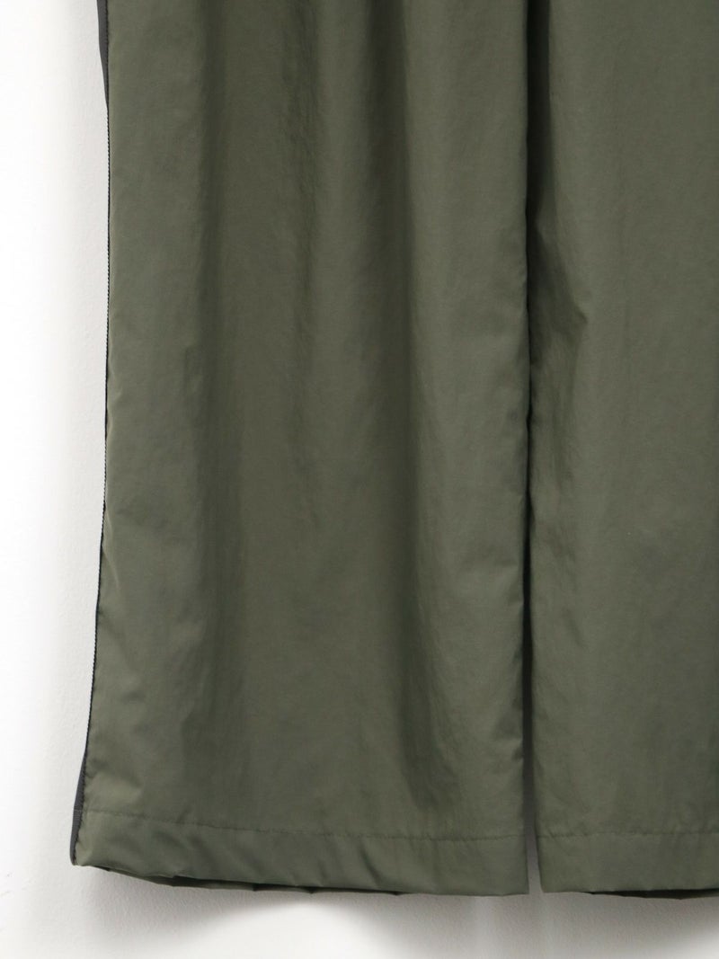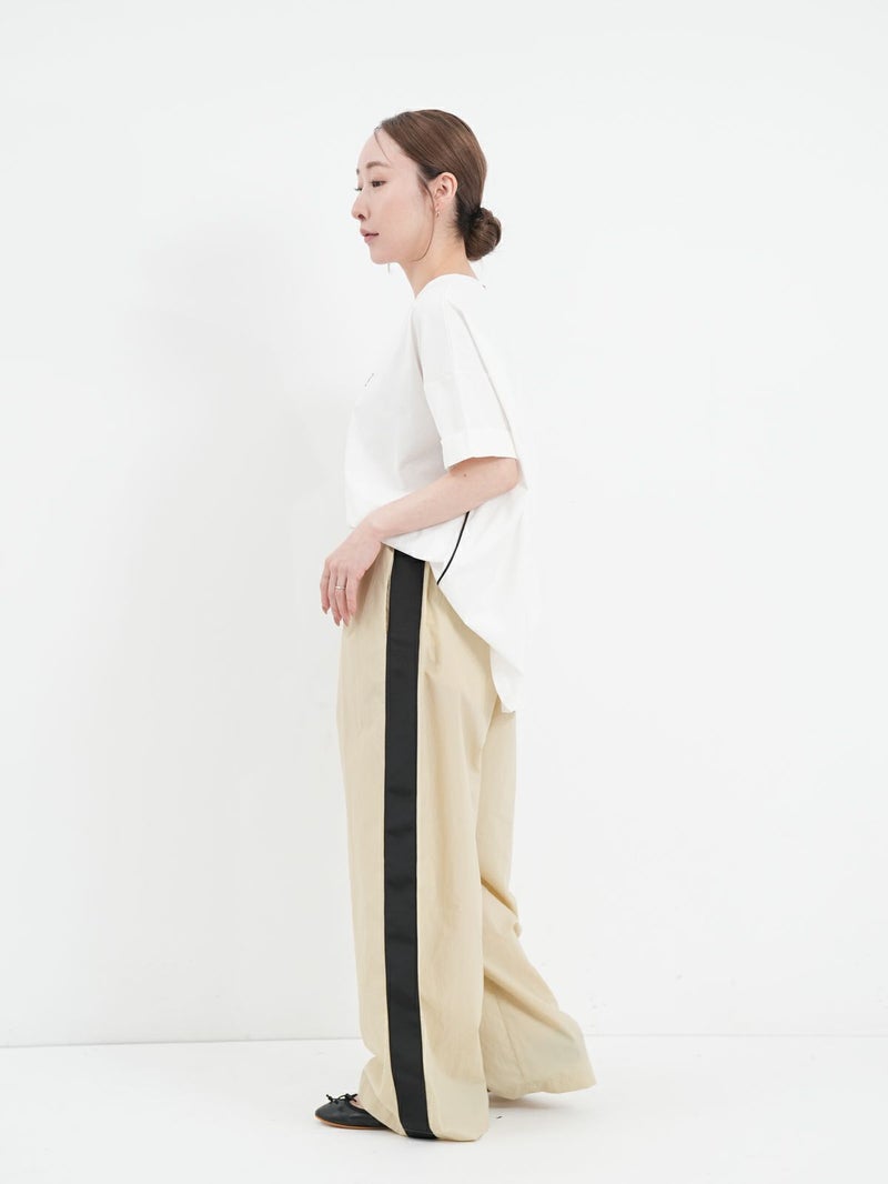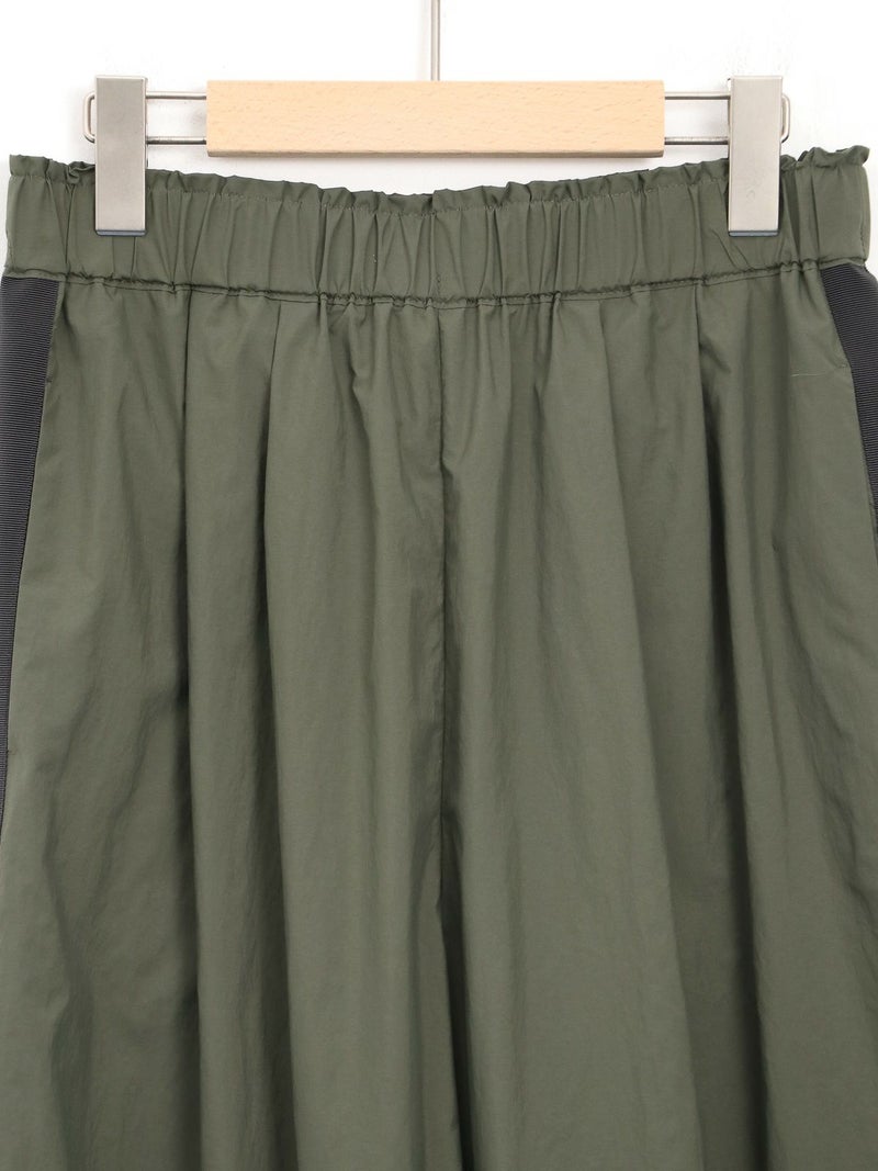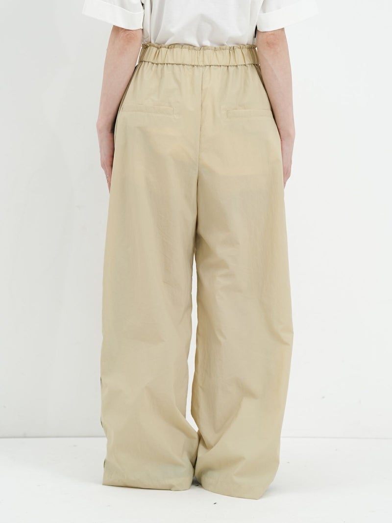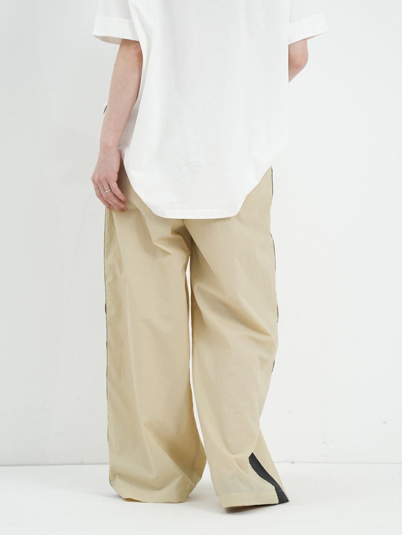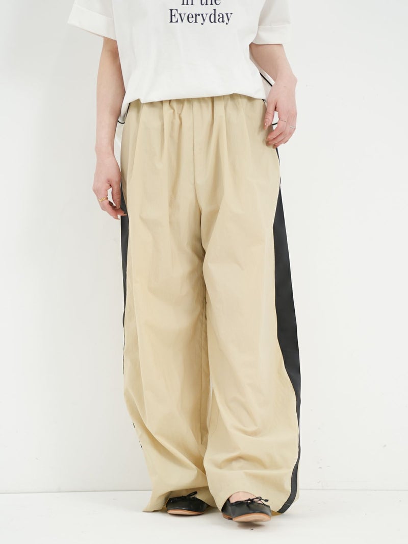 軽量で、撥水加工のタフタを使用したワイドパンツ。 サイドのグログランテープのラインがアクセント。落ち感のあるストレートワイドシルエットがコーディネートに抜け感をプラスしてくれます。
