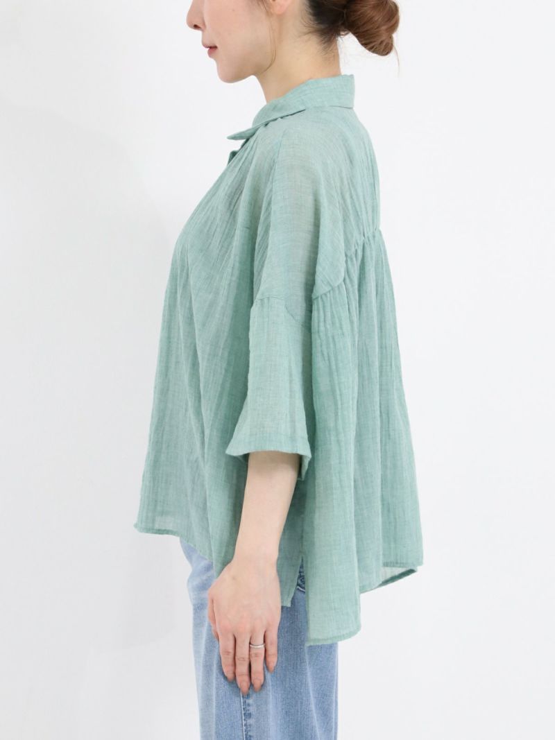 羽織にも使えるハーフスリーブのショートブラウス。 バックギャザーが程良く女性らしさもプラスしてくれます。