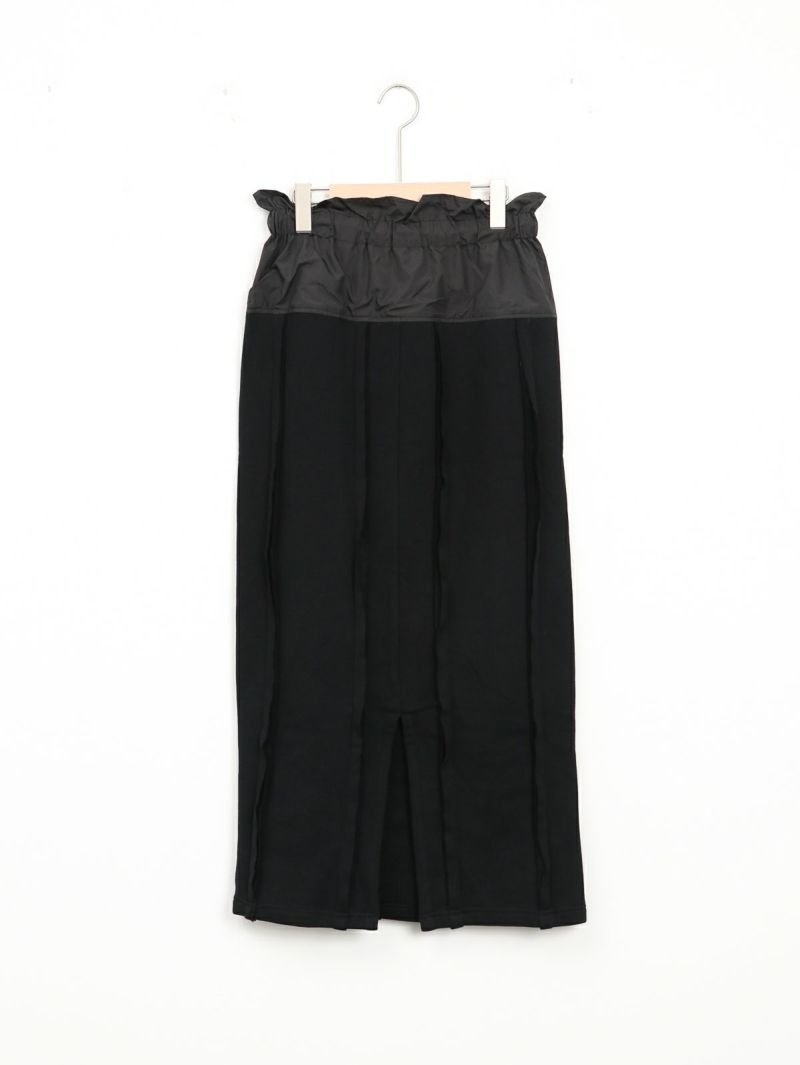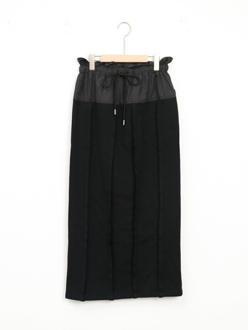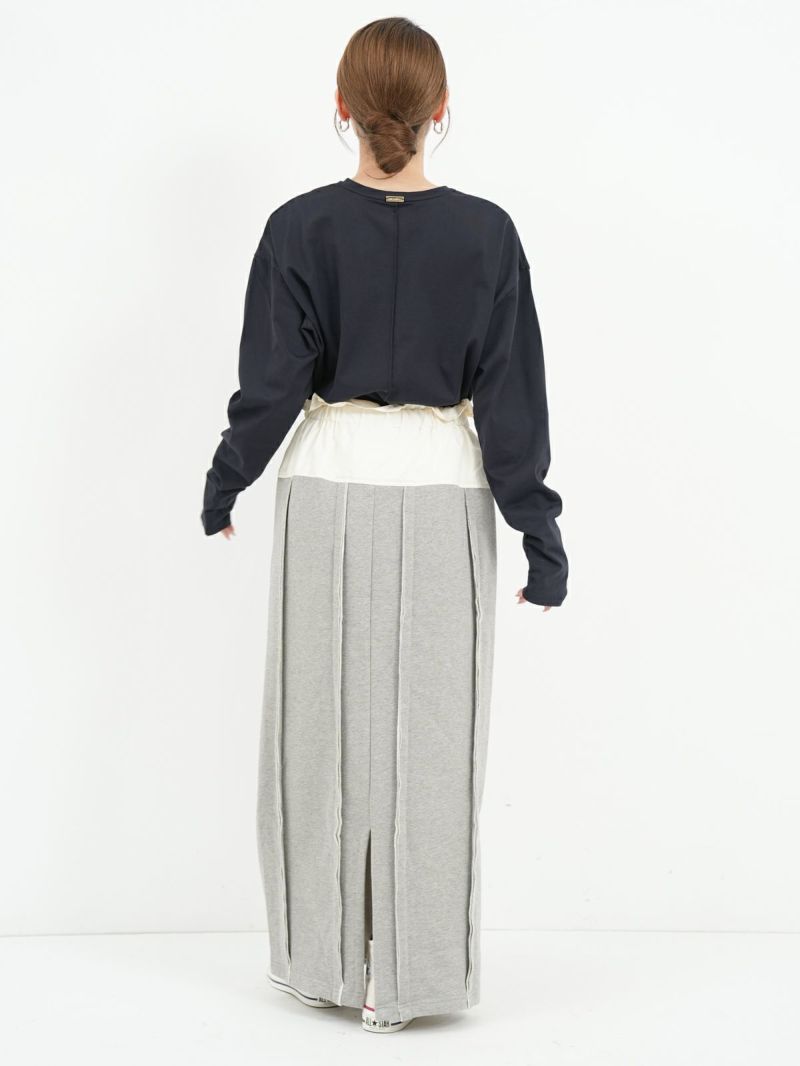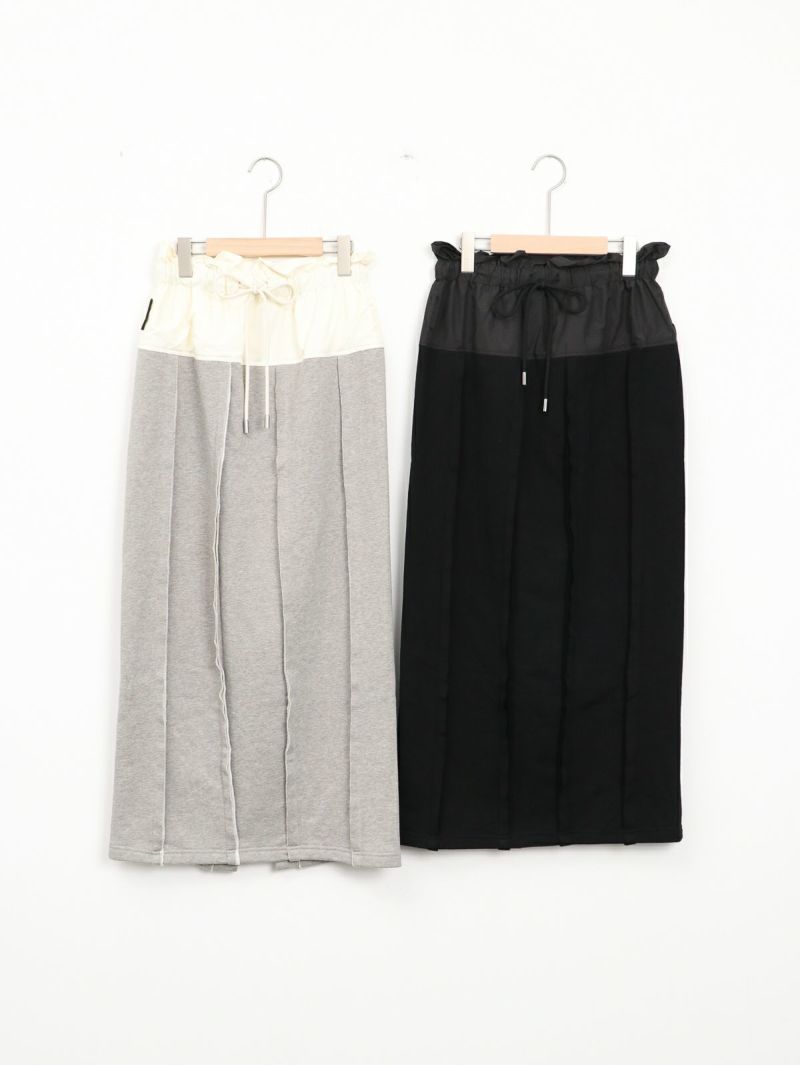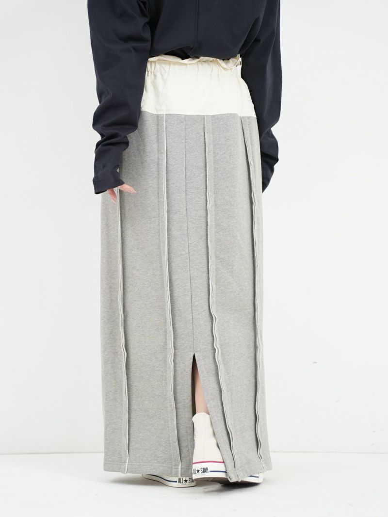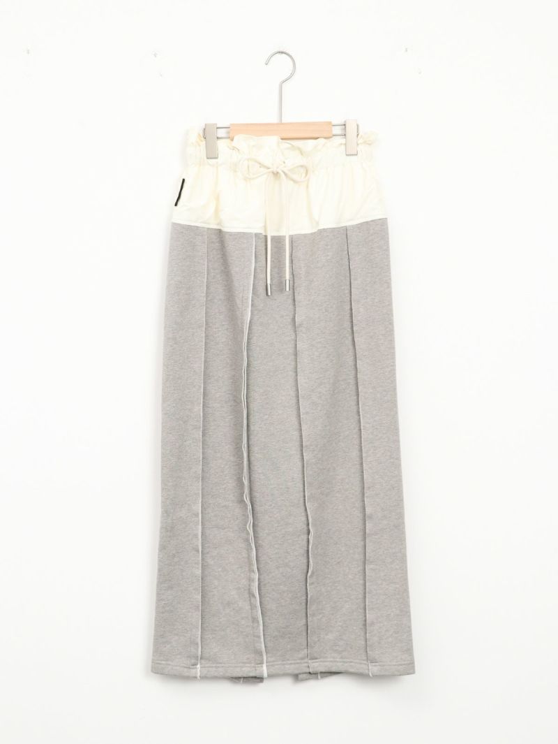異素材をドッキングしたデザインのスウェットロングスカート。