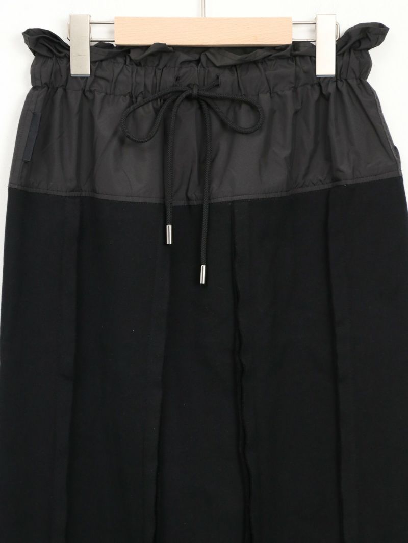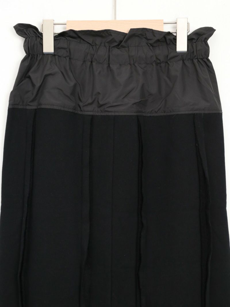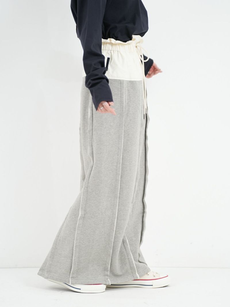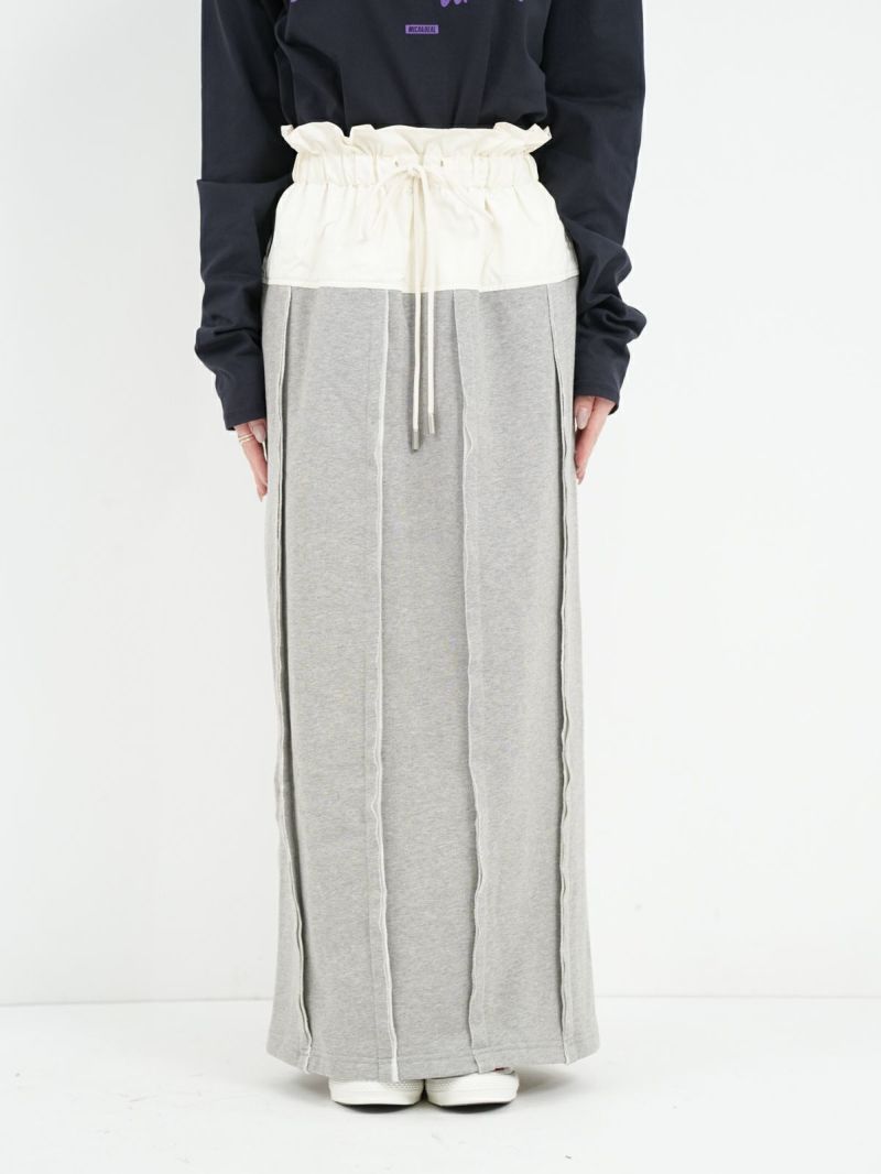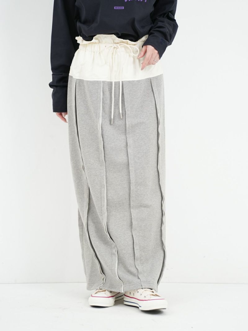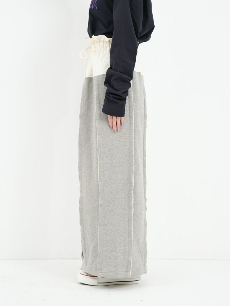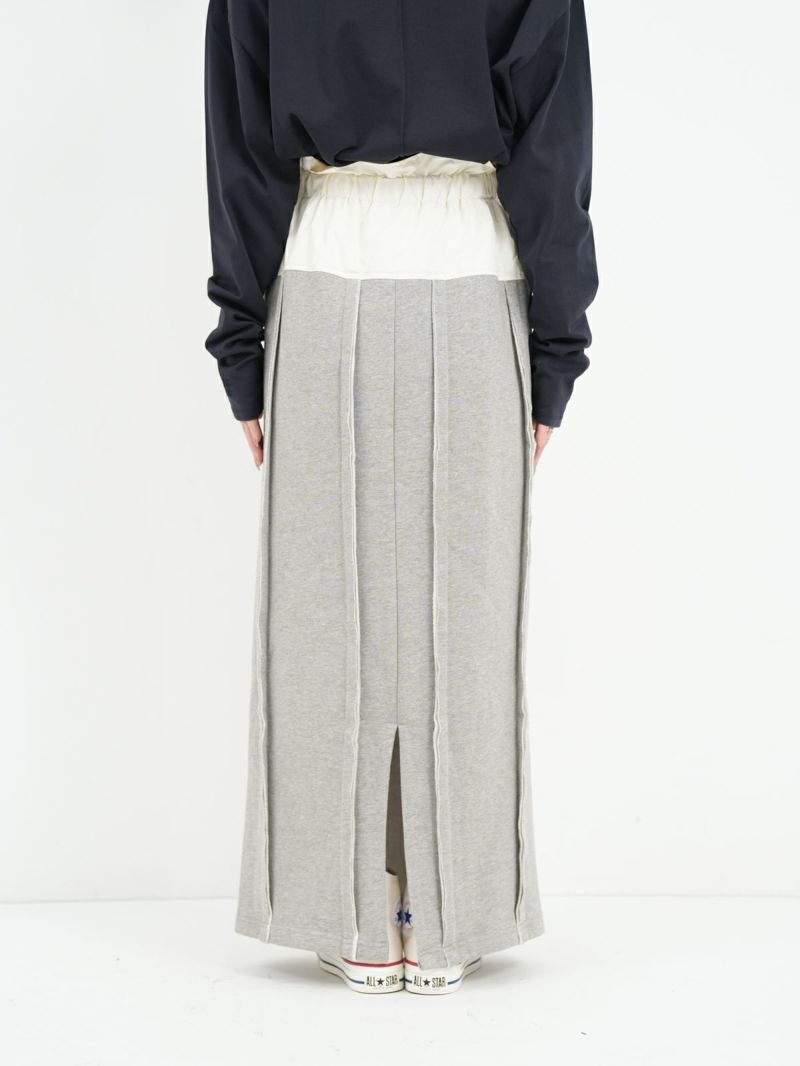 異素材をドッキングしたデザインのスウェットロングスカート。