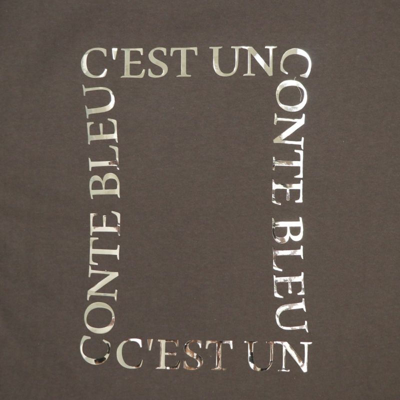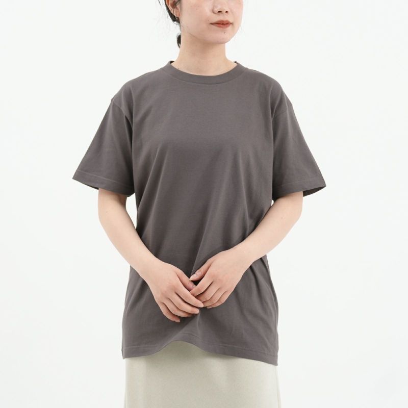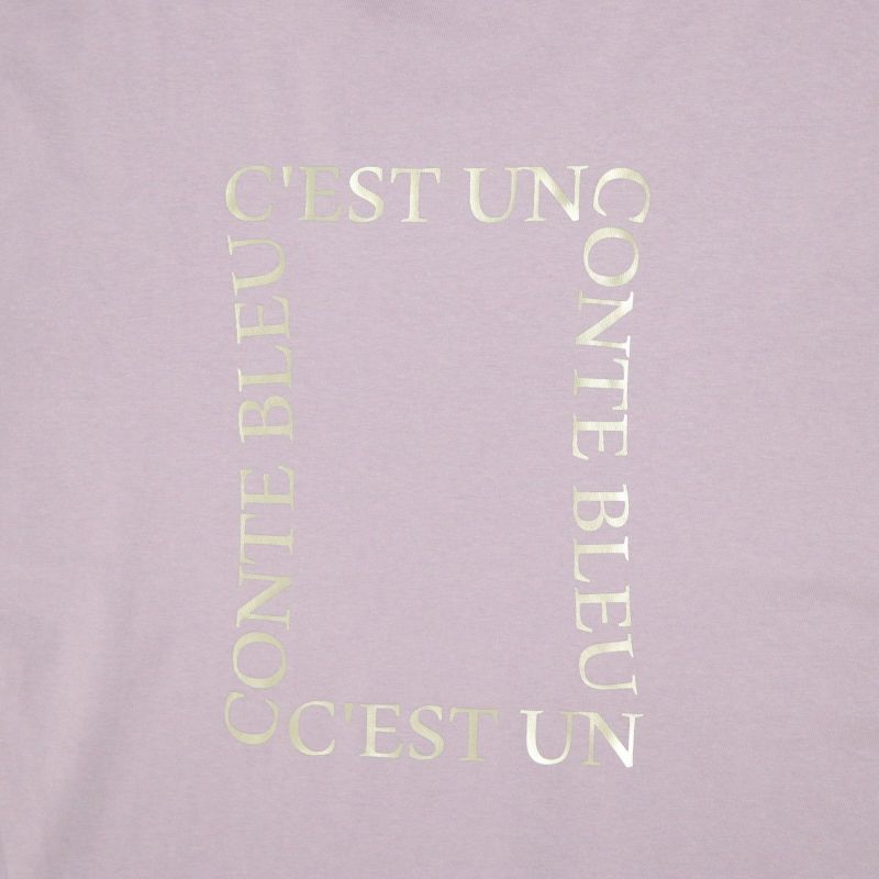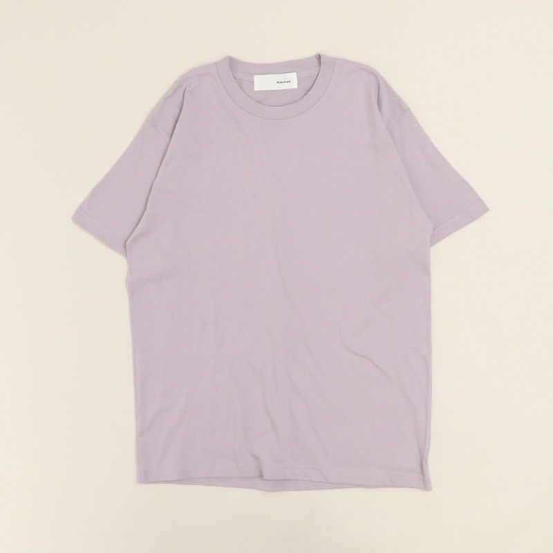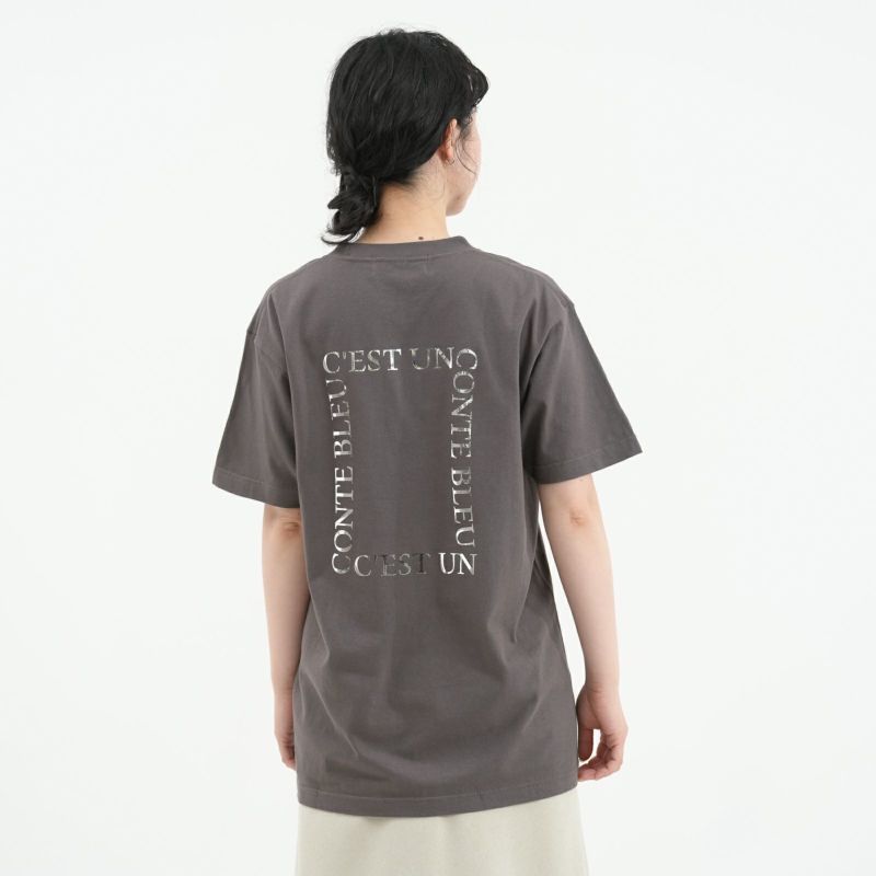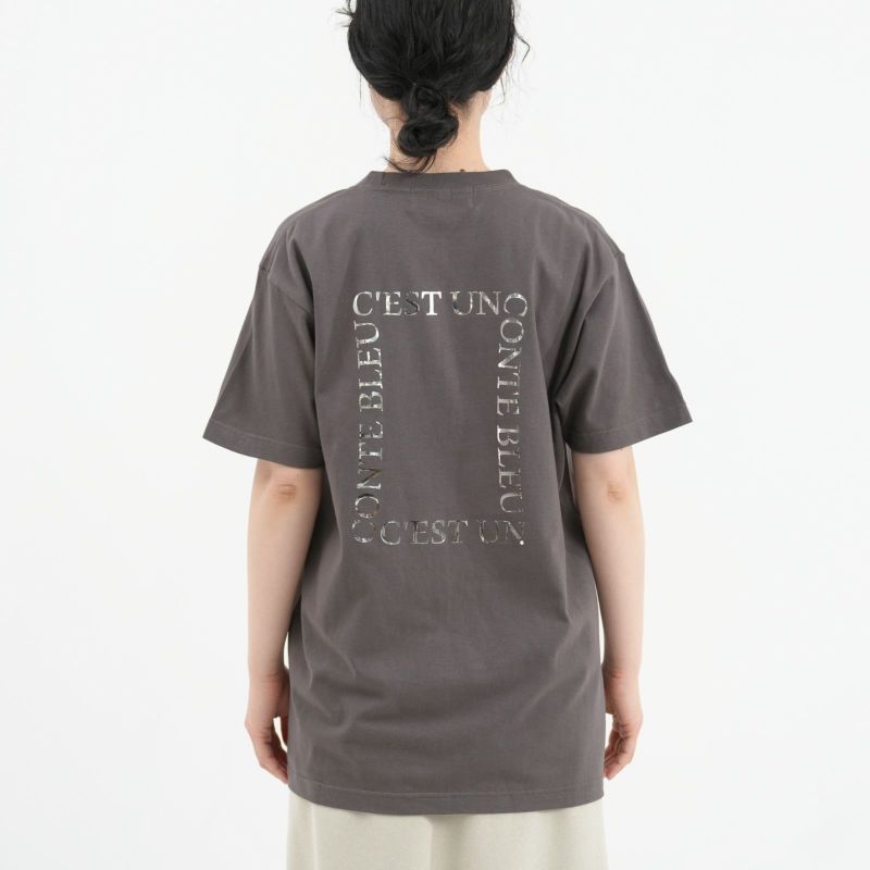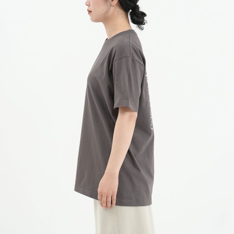 背中に箔シートプリントで描いた少しシェープさせたロゴがポイント。透けにくいやや肉厚の天竺を使用。 無地のカラーTシャツ感覚で着られるのにアクセントになる1枚として◎