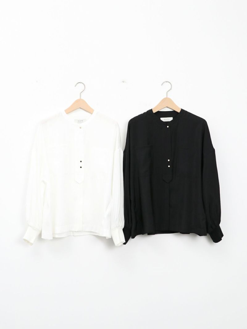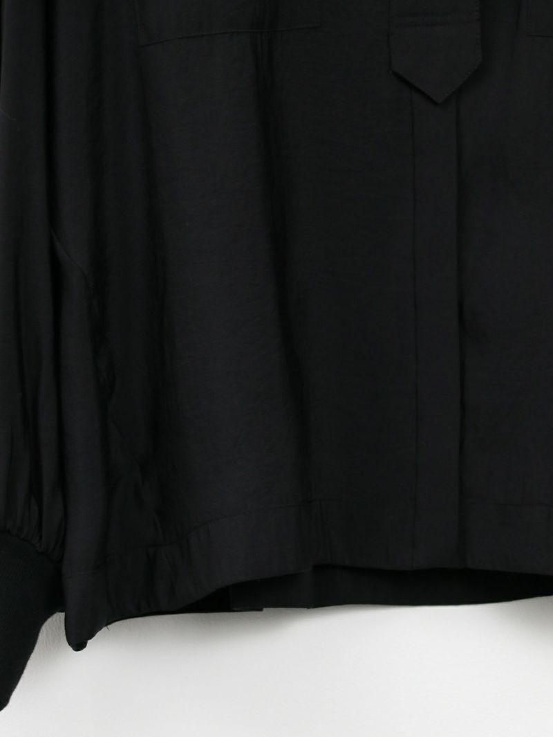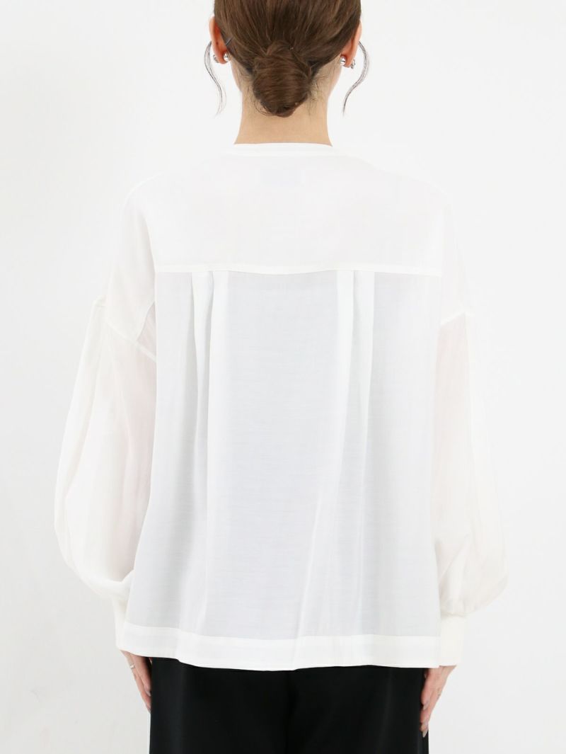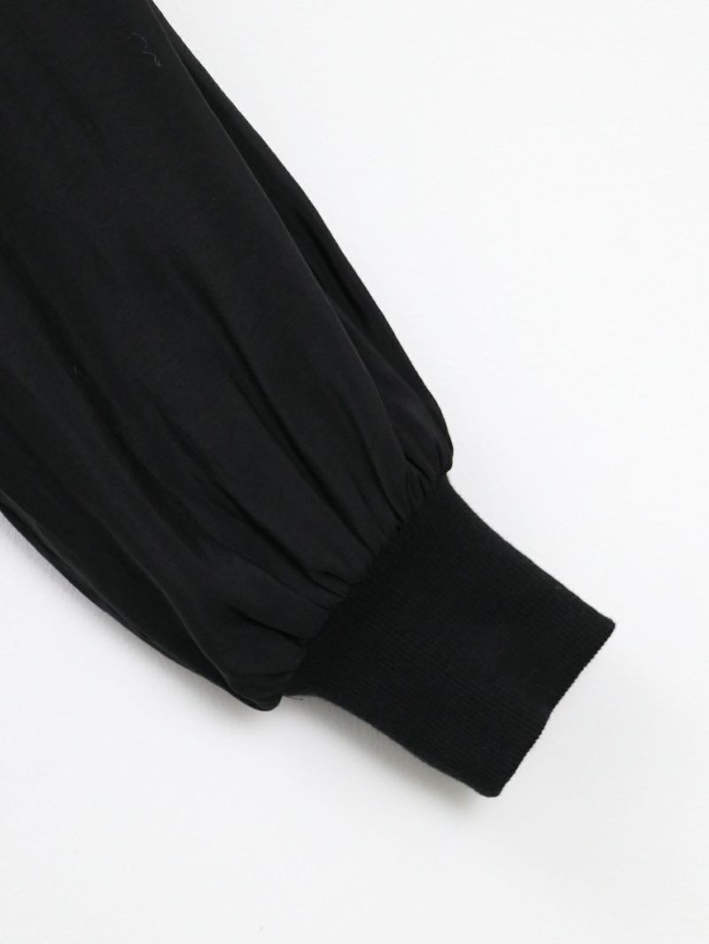 シルクのようなハリと光沢のあるポリモダールブロード×強撚カットソーのドッキングブラウス。袖のリブ使いなどパーツごとに表情のあるデザインです。