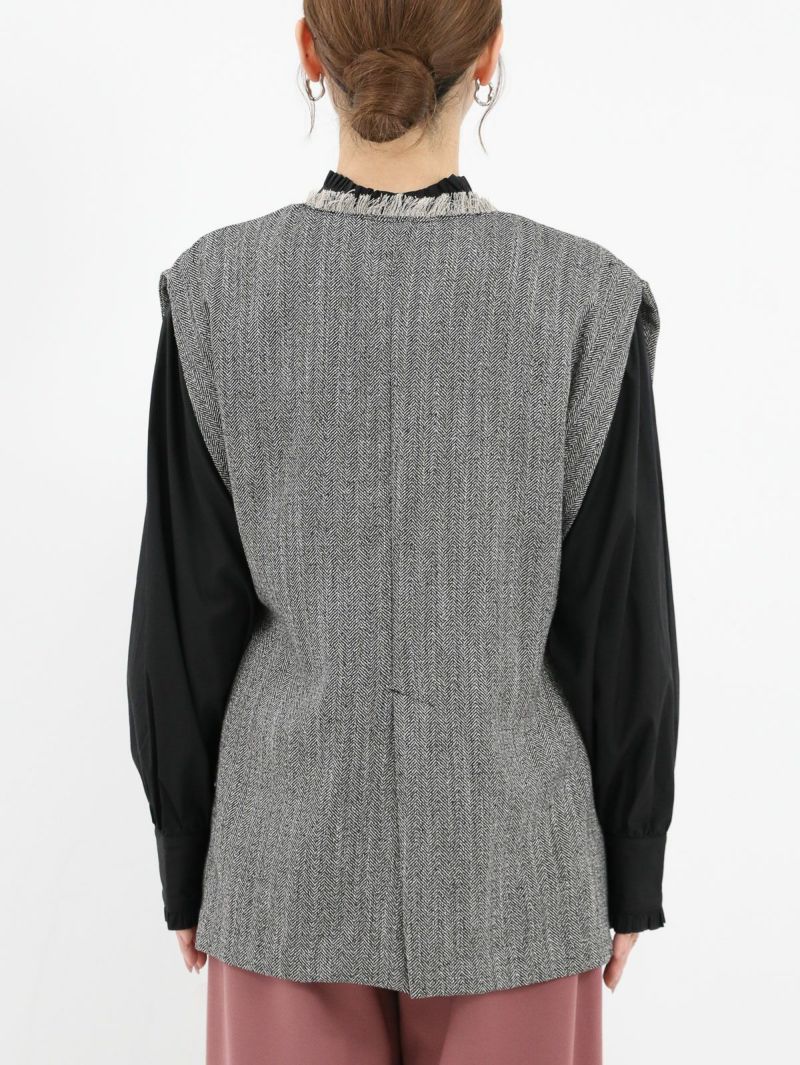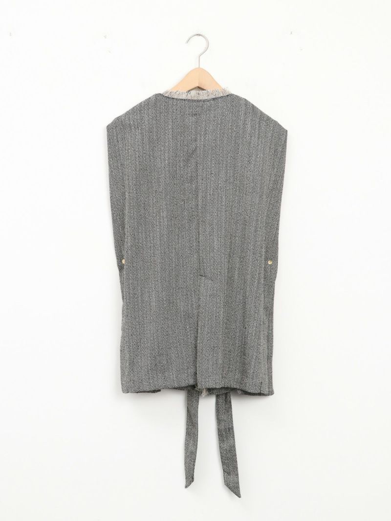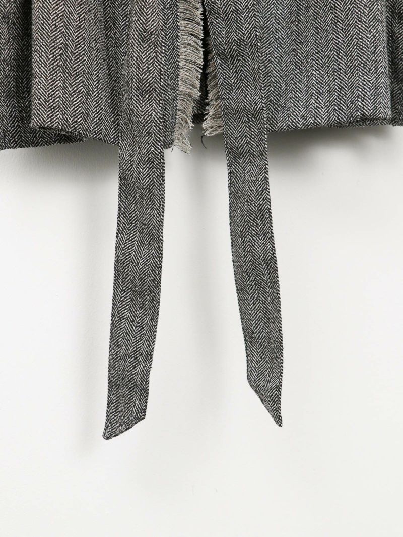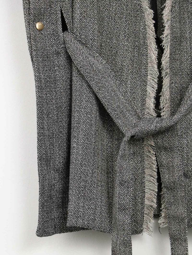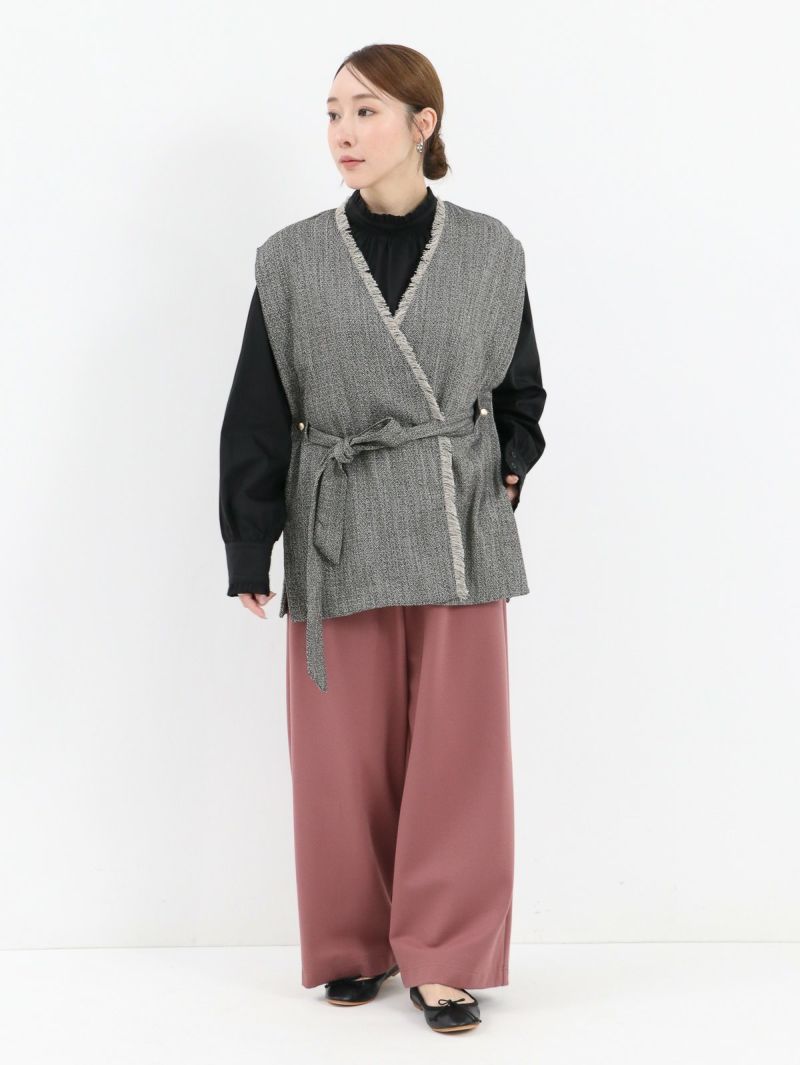 ウール見えするヘリンボーン生地はAWの雰囲気を取り入れるのにぴったりの素材感。 ミックスツイードの表面感が暖かみがありつつモードな雰囲気。フロントはボタンなどは付けず前端のフリンジが際立つデザイン。スッキリとした深めのVネックで大人な雰囲気に仕上げました。程よく長めの着丈で気になる腰回りやヒップもカバーできる優れもの。ベルトの巻き方はスタイリングに合わせてアレンジが可能です。