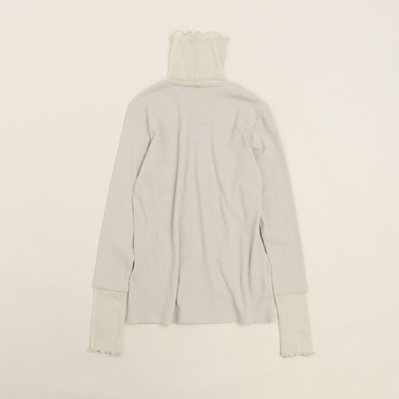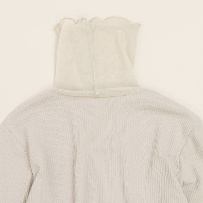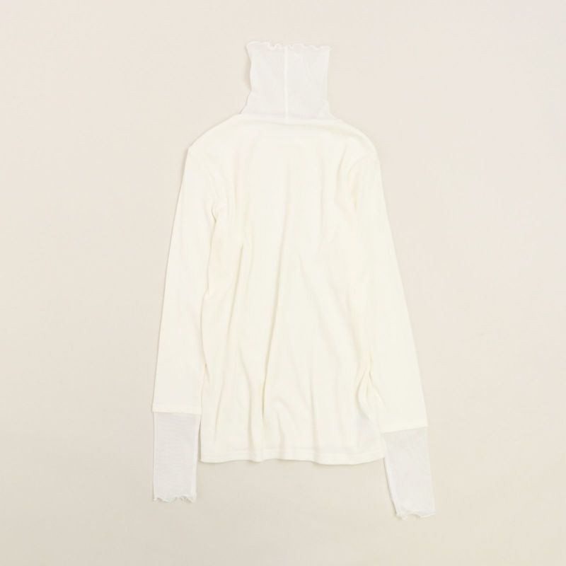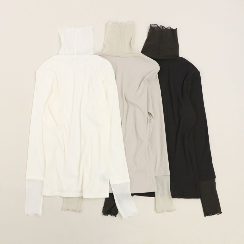 タートル部分と袖口にチュールを施したリブタートル。 身頃にはドライタッチな強撚ランダムベアテレコを使用し、透け感を気にすることなく着用していただけます。(Whiteのみやや透け感あり)