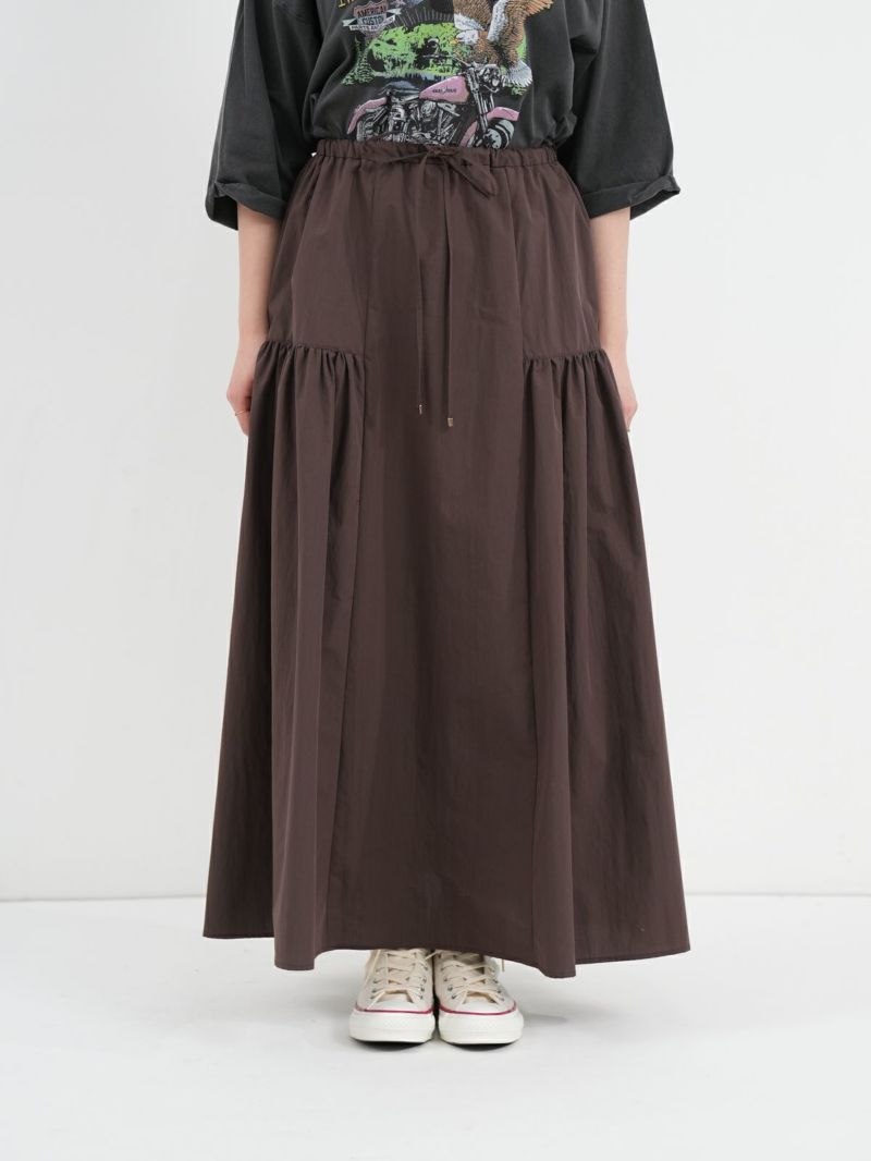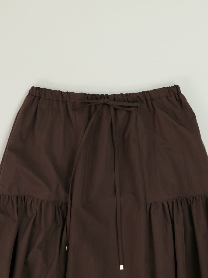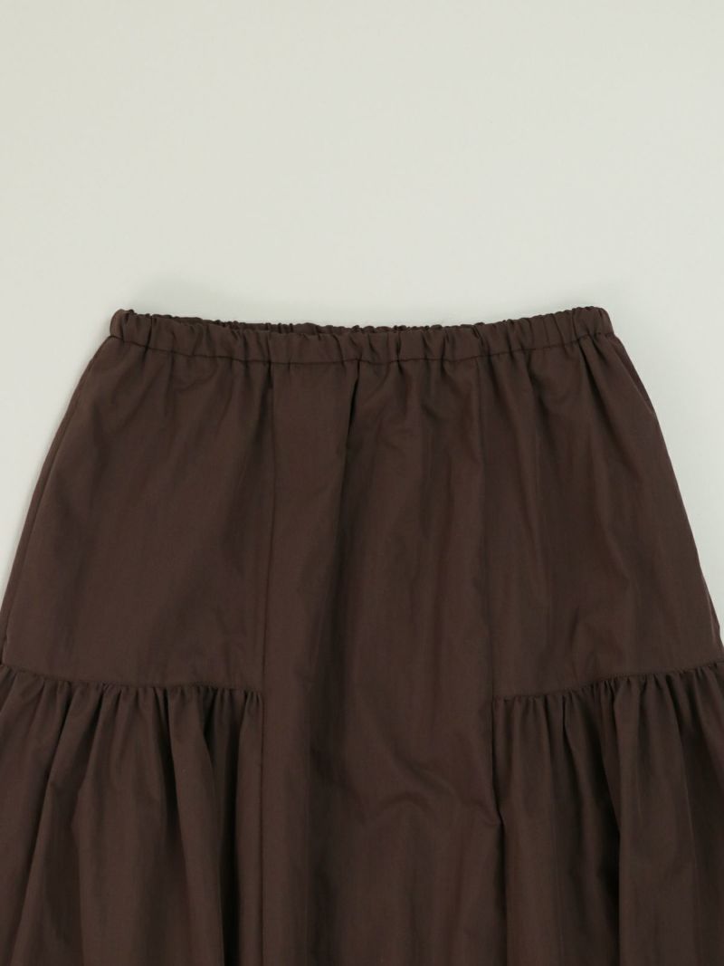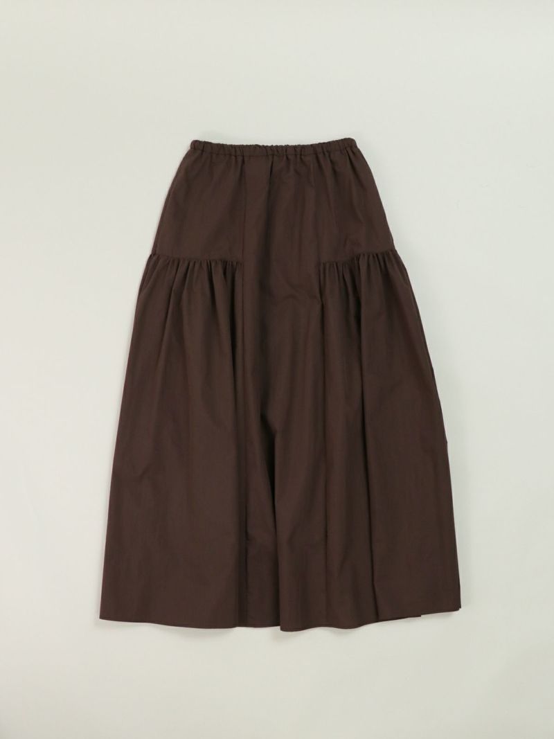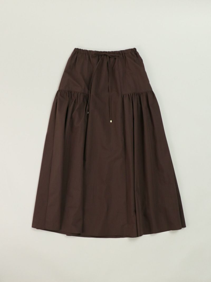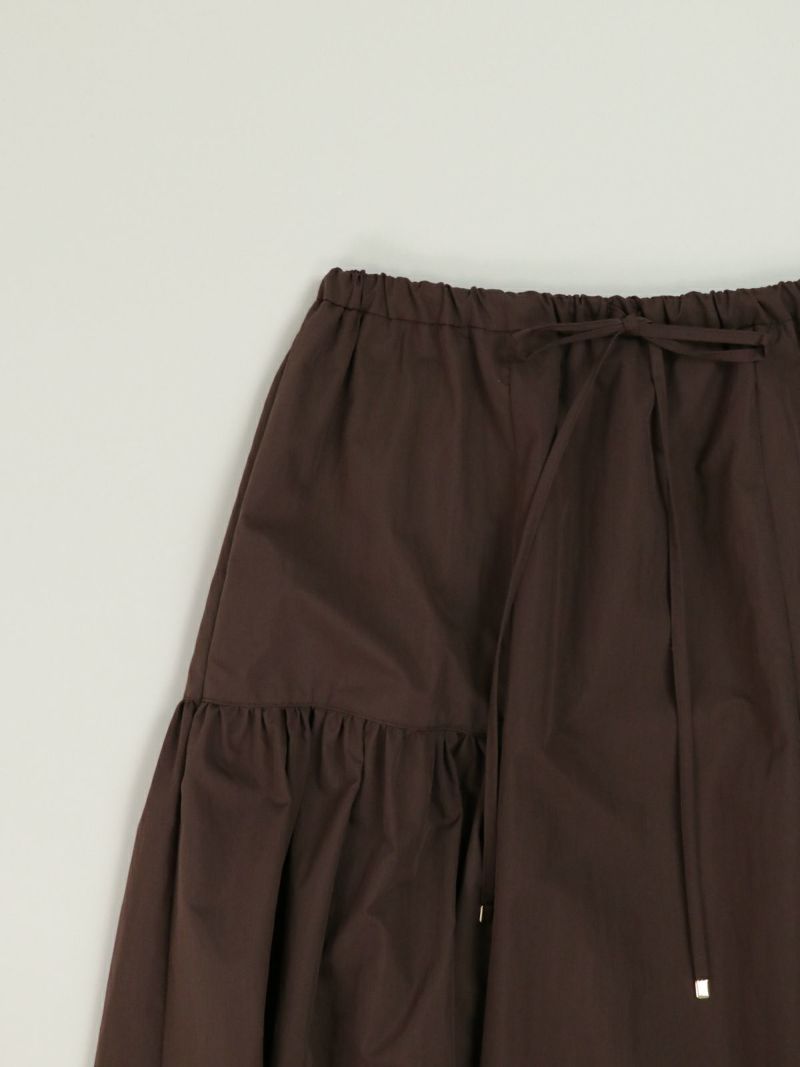 サイドに切り替えたっぷりのギャザーを配しボリュームのあるシルエットが華やかな印象のスカート。 細番手のコットンにナイロンを使用し高密度ながら軽さが特徴のタイプライター生地を使用。シーズンレスで着回せるのも嬉しいポイントです。