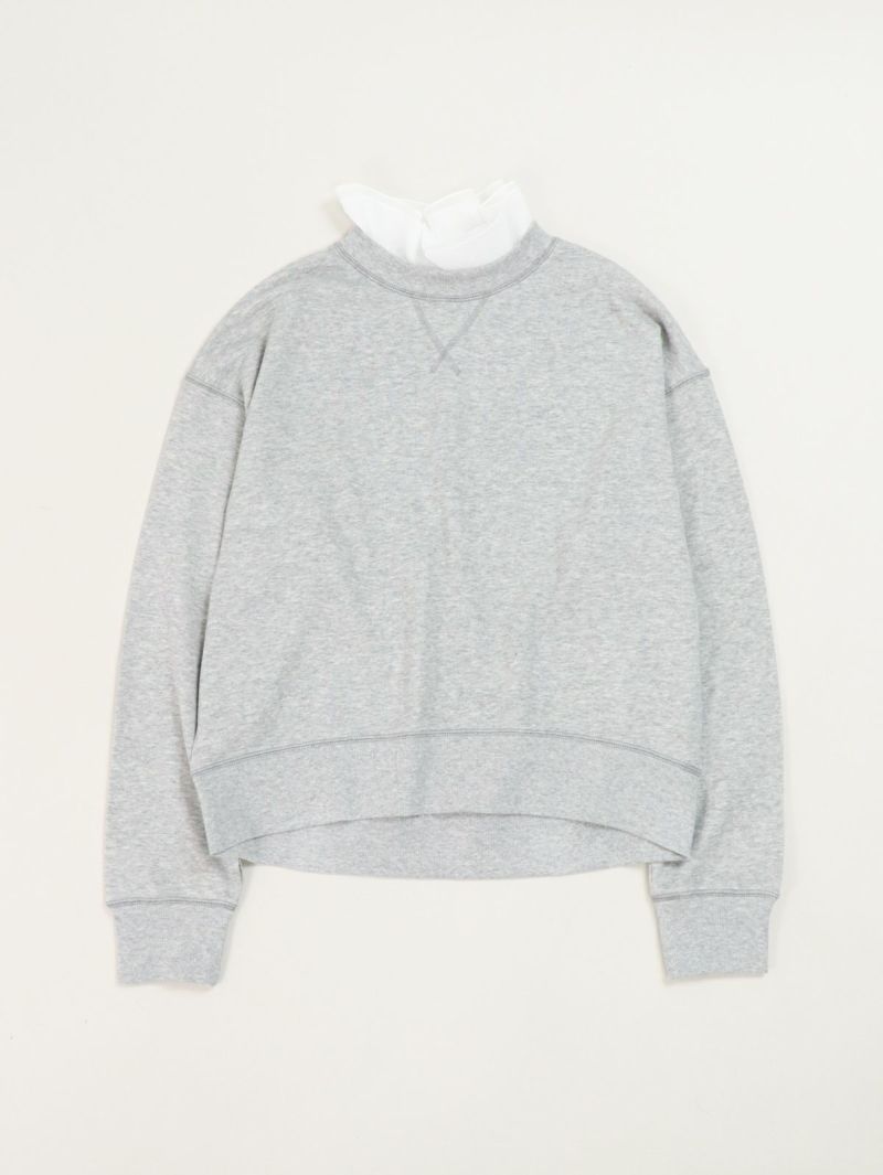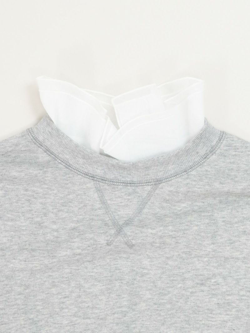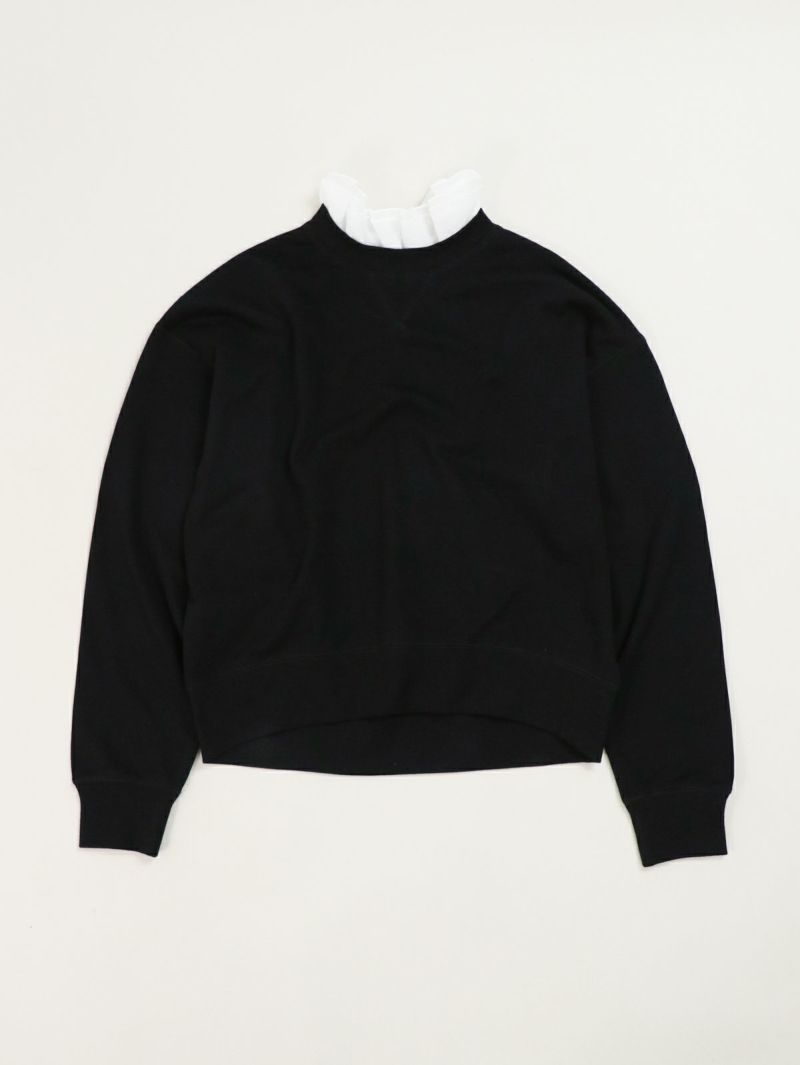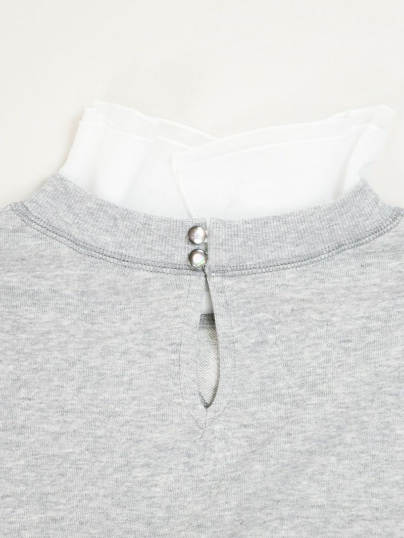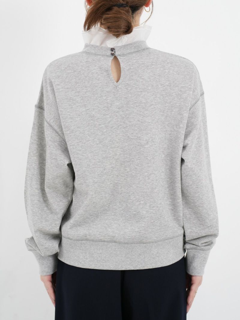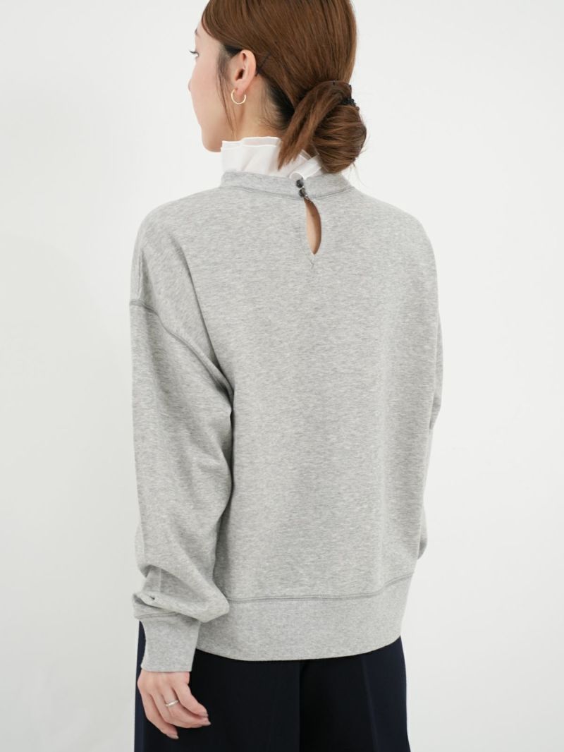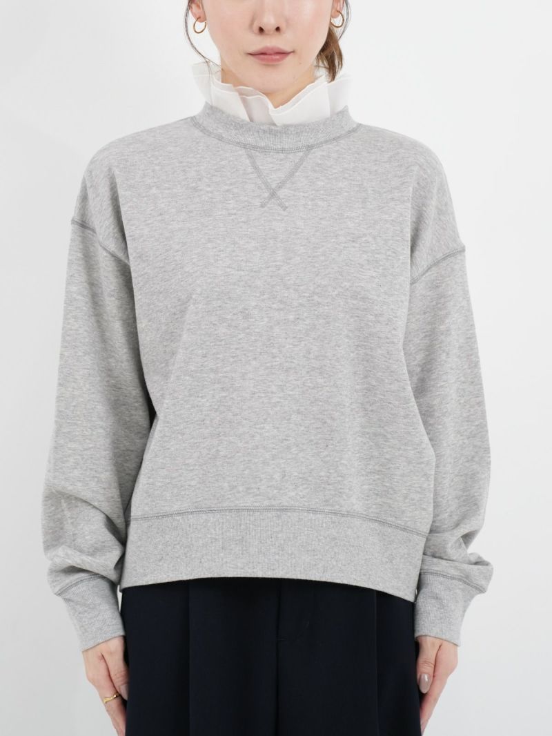 大人カジュアルが華やぐ襟フリル付きミニ裏毛プルオーバー。 肌ざわりのいいコットン100%のミニ裏毛素材は、軽すぎず重すぎない絶妙な厚み。季節の変わり目にも重宝する、毎日にちょうどいい一枚です。襟の内側には、取り外し可能なオーガンジーのフリルをあしらい、シンプルな中にふんわりとした甘さをプラス。パンツにもスカートにも合わせやすく、大人のカジュアルスタイルにさりげなくフィットし、一枚で二つの表情が楽しめる頼れるプルオーバーです。