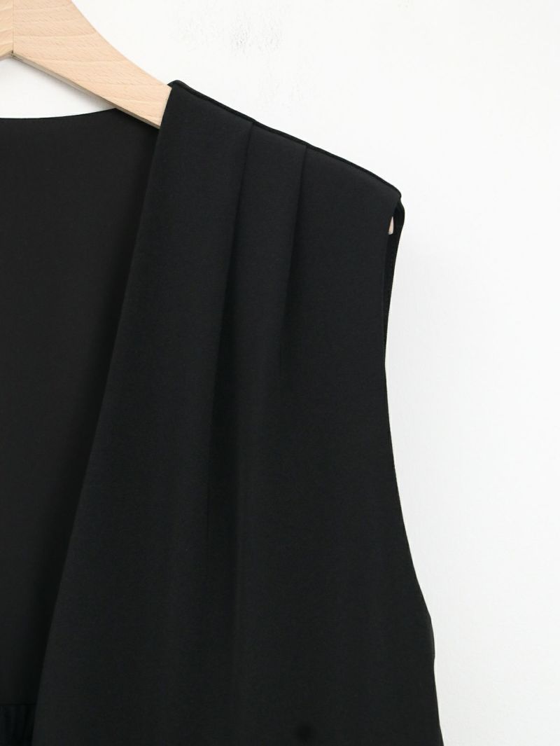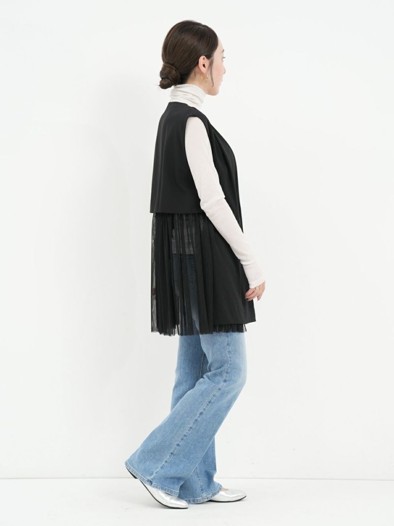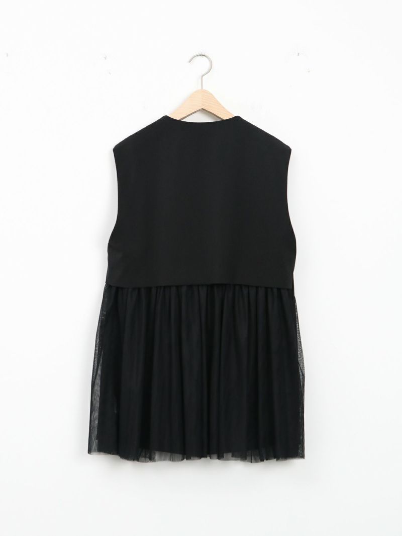 軽やかなチュールがポイントのジレ。 前裾サイドから覗くチュールがアクセント、後ろはハイウエスト位置からの切り替えデザインです。肩にもタックを施しキレイで落ち感のあるシルエットに見せてくれます。