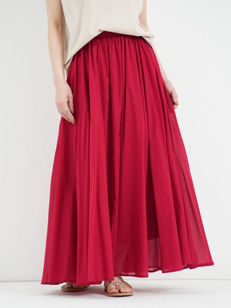ベーシックカラーと夏にピッタリな程良いボリューム感え華やかなカラー展開で今季も登場。 程良くボリュームがある広がり過ぎず、大人っぽく着こなせるバランスに仕上げました。ウエストはゴム仕様でストレスフリーな穿き心地です。