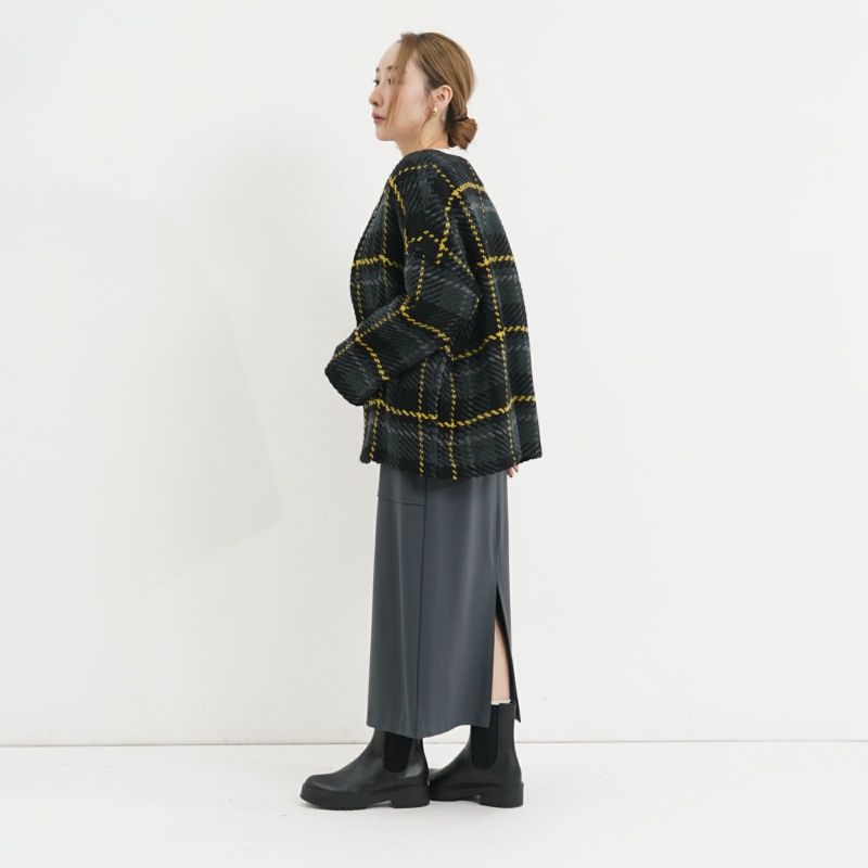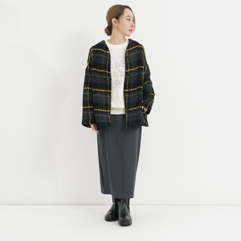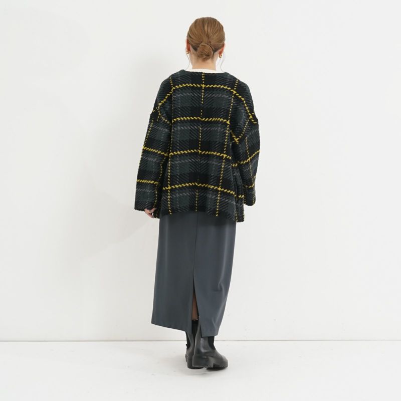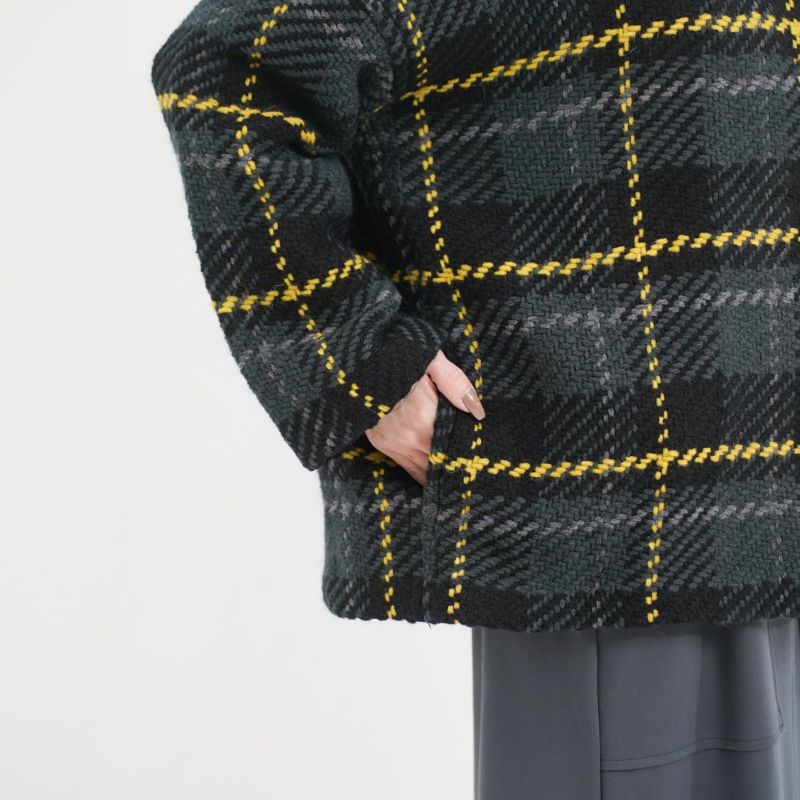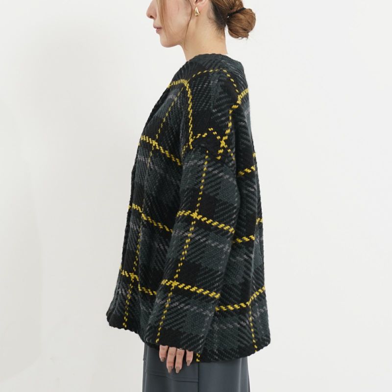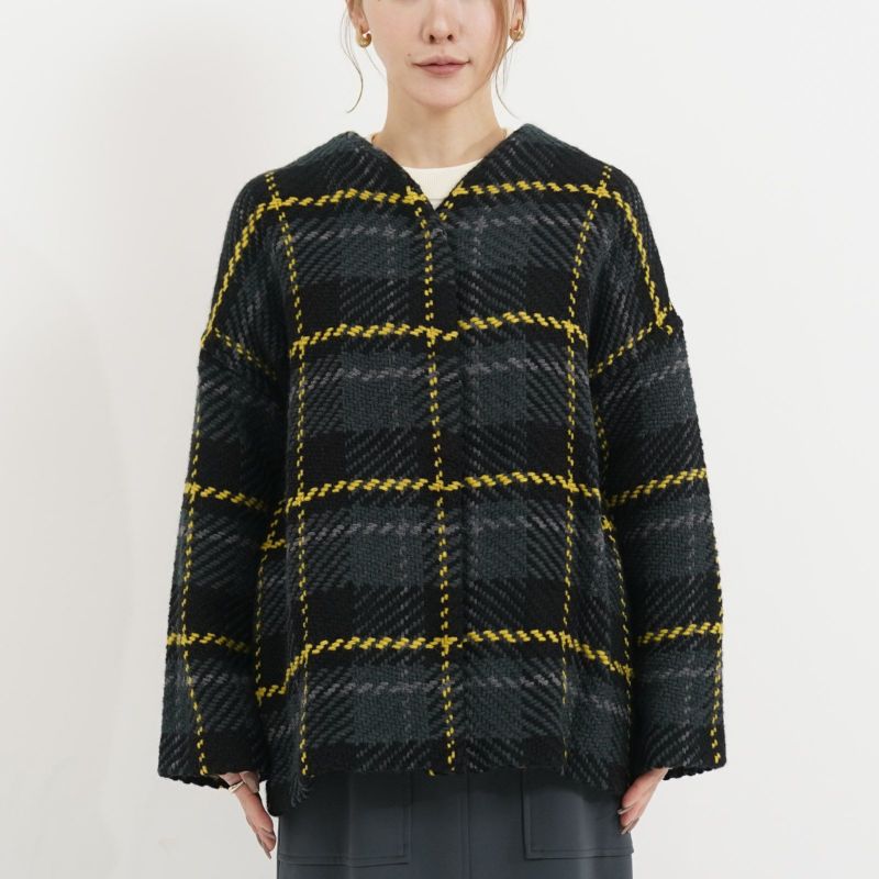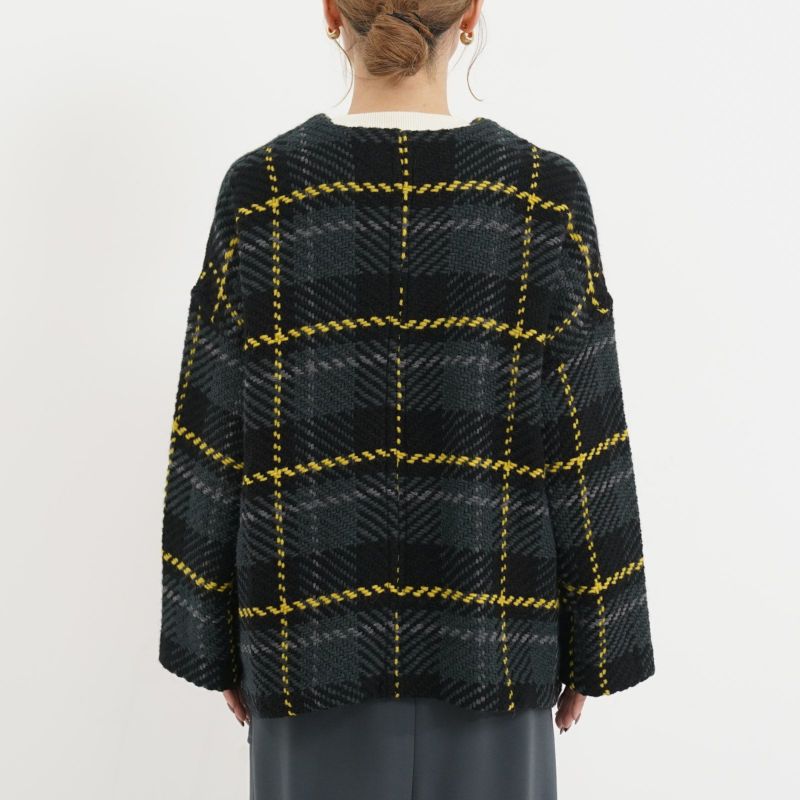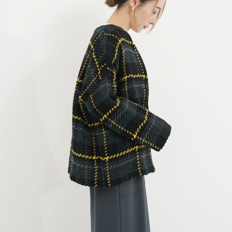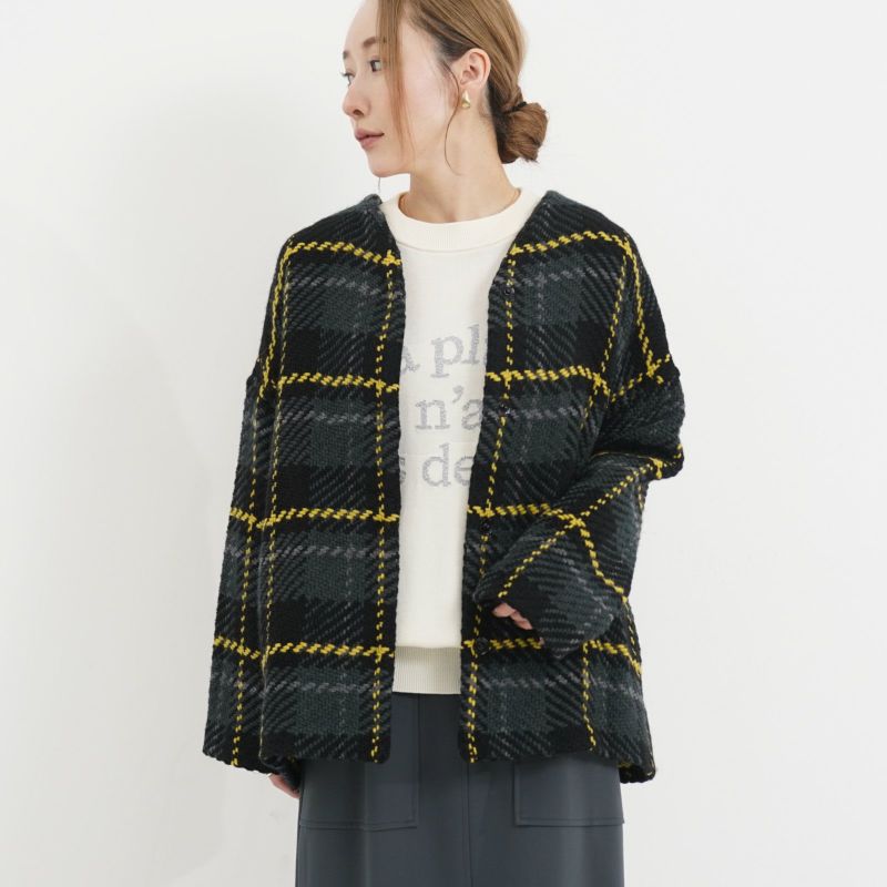 John Branigan(ジョン・ブラニガン) Vネックのゆったりとしたシルエットのノーカラージャケット。 他にはないニットの技術で編み上げられるツイード生地は、軽さと柔らかさが特徴です。ニット素材なので気軽に羽織りやすく、ウール混で暖かい1枚です。