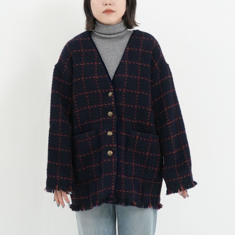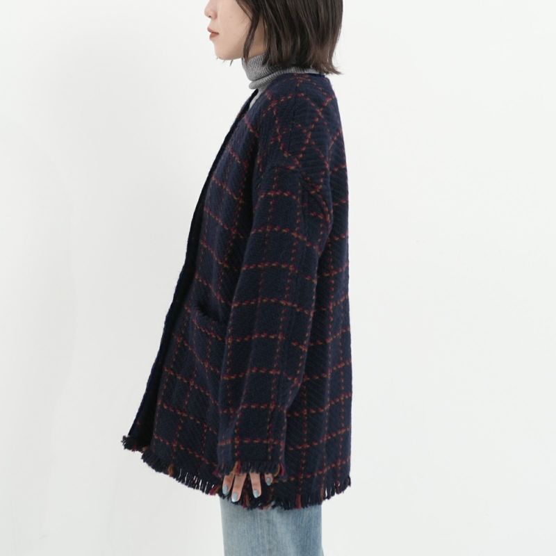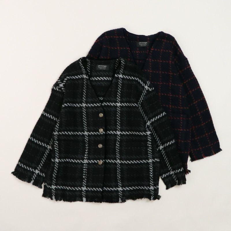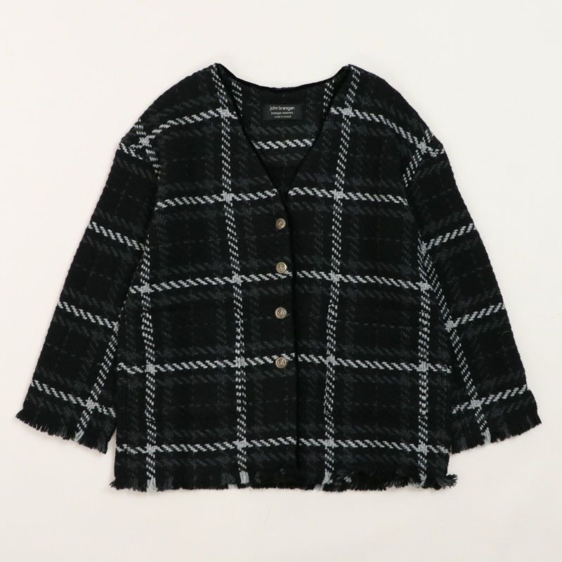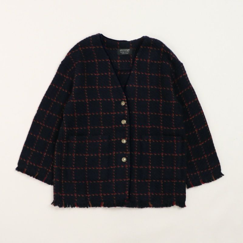 John Branigan(ジョン・ブラニガン) 柔らかいふっくらとした風合いのツイード生地がポイントのノーカラージャケット。 他にはないニットの技術で編み上げられるツイード生地は、軽さと柔らかさが特徴です。 ニット素材なので気軽に羽織りやすく、ウール混で暖かい1枚です。