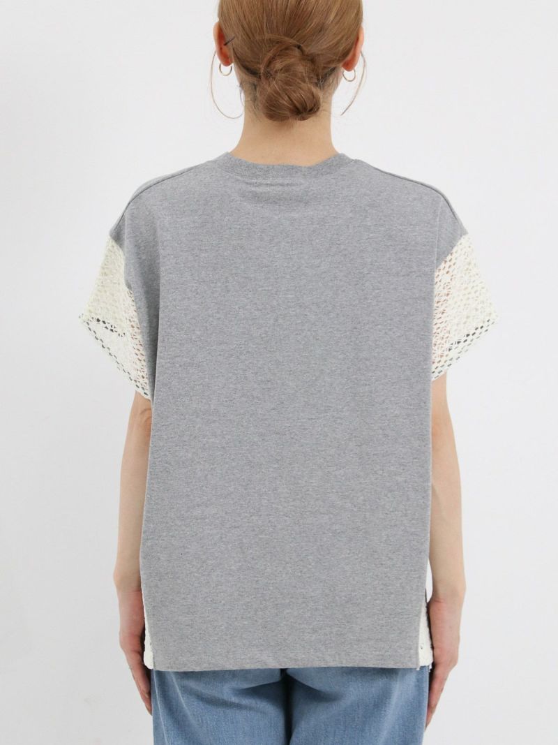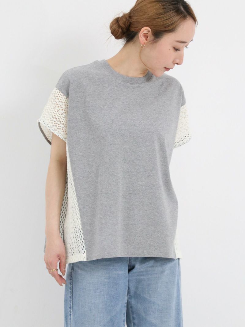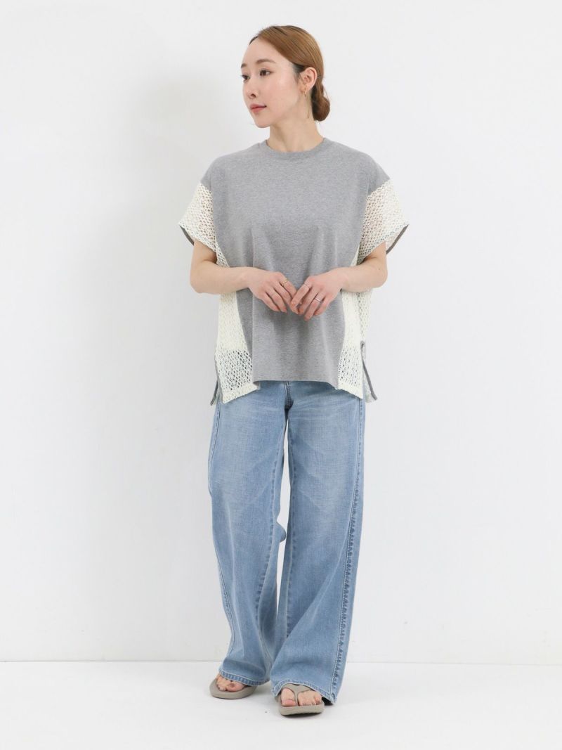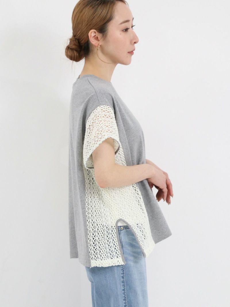 前後差のある丈感がポイントのドッキングTシャツ。 一見シンプルなTシャツですが、センターバックにライン状にシアー素材を切り替えアクセントに。 後ろ裾にはゴムギャザーを施し動きのあるデザインにしています。
