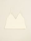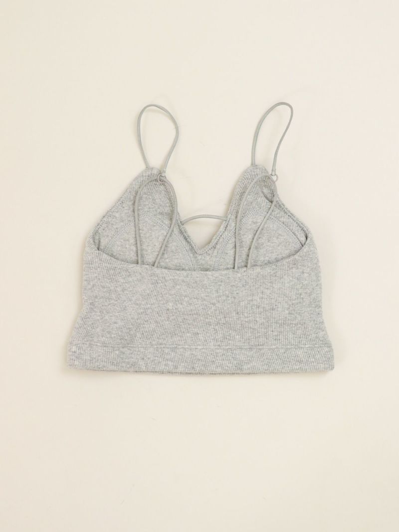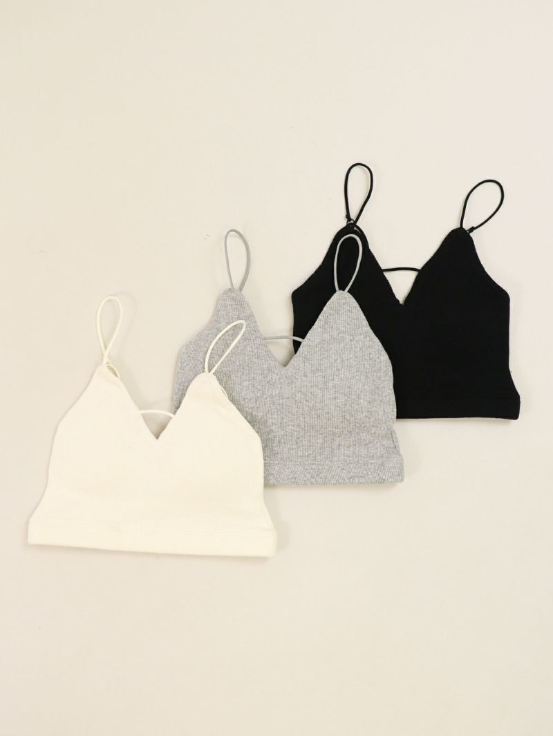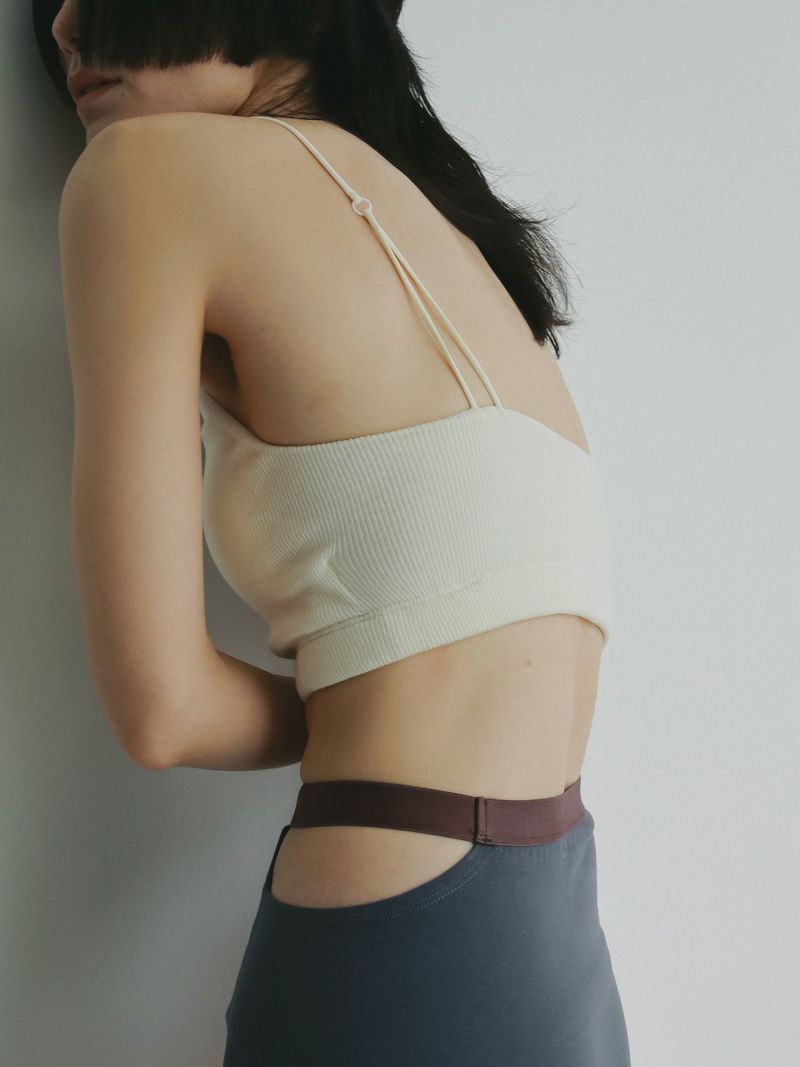 Knuth Marfコラボ、フロントデザインがポイントのブラトップ。 風合いの良い肌触りのやさしいコットン100%のリブ素材を使用。カジュアルになりすぎない細めのストラップと大きくあいた背中のデザインが特徴です。縫い付けタイプの三角形のパットでホールド感もしっかりとあり、スッキリとしたシルエットでご着用いただけます。