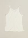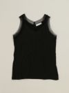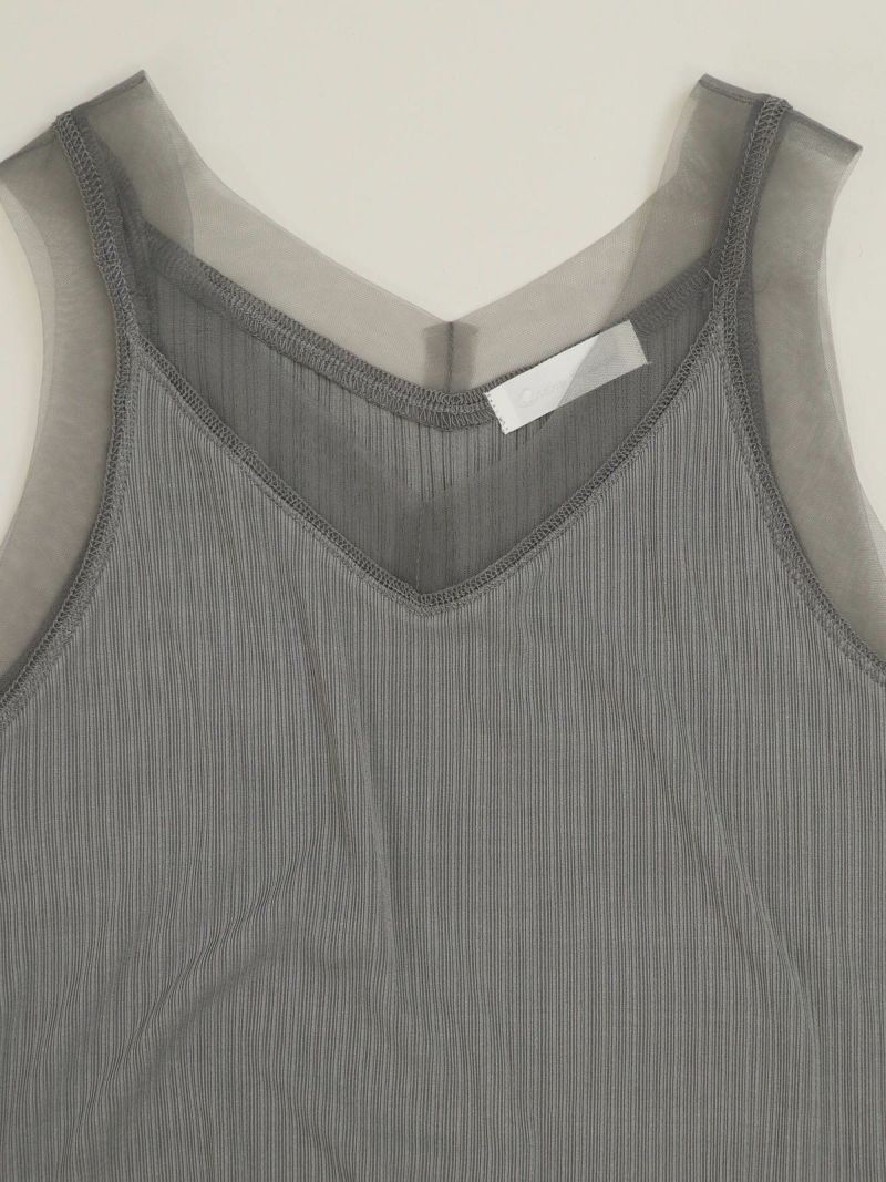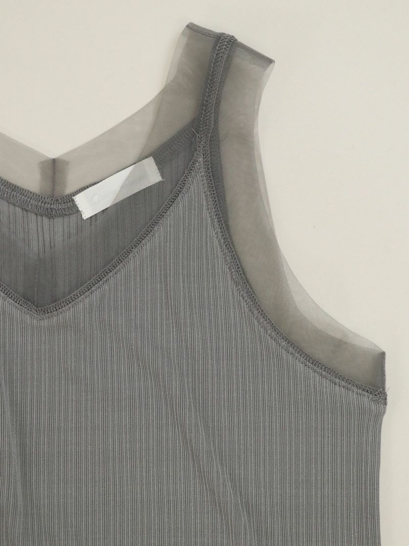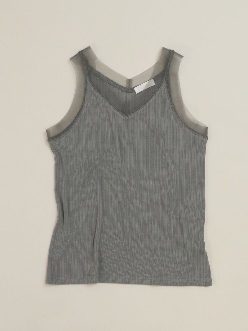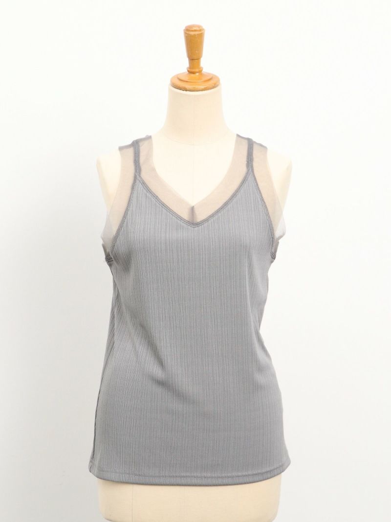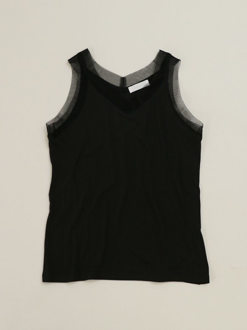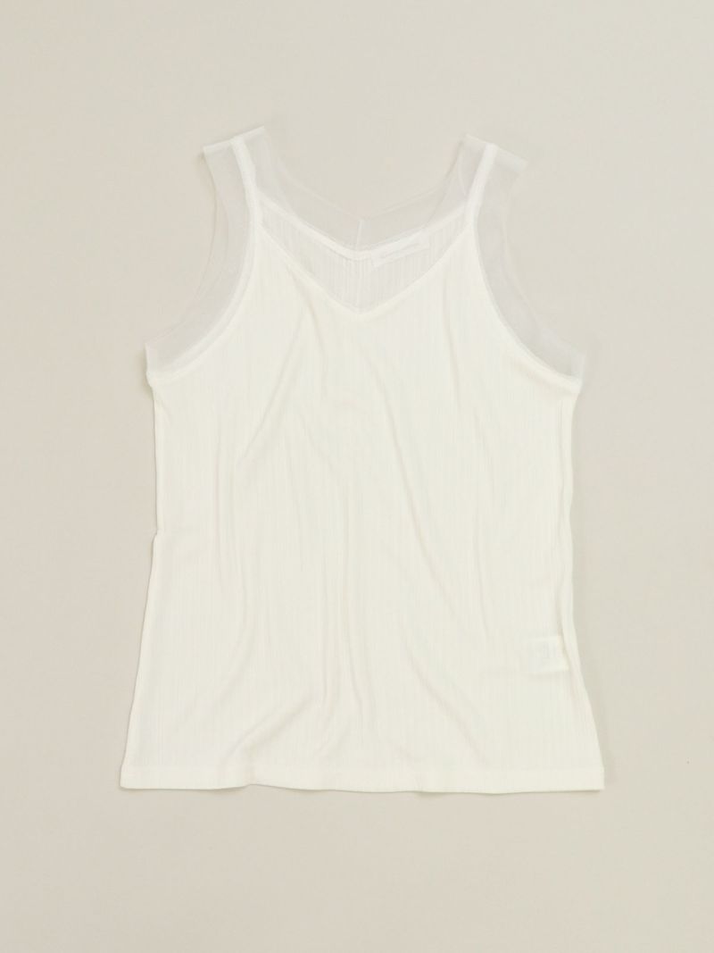 前後の衿とアームホールにボディと同色計のチュール素材をドッキングしたタンクトップ。 透け感のあるトップスやシャツなどと合わせて、さり気なくポイントとなるインナーは夏の頼れるアイテムとして活躍します。