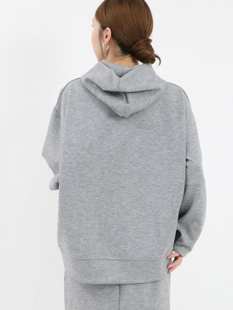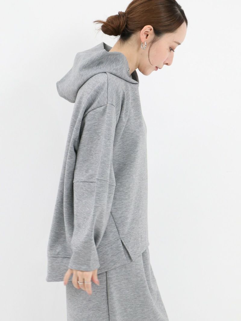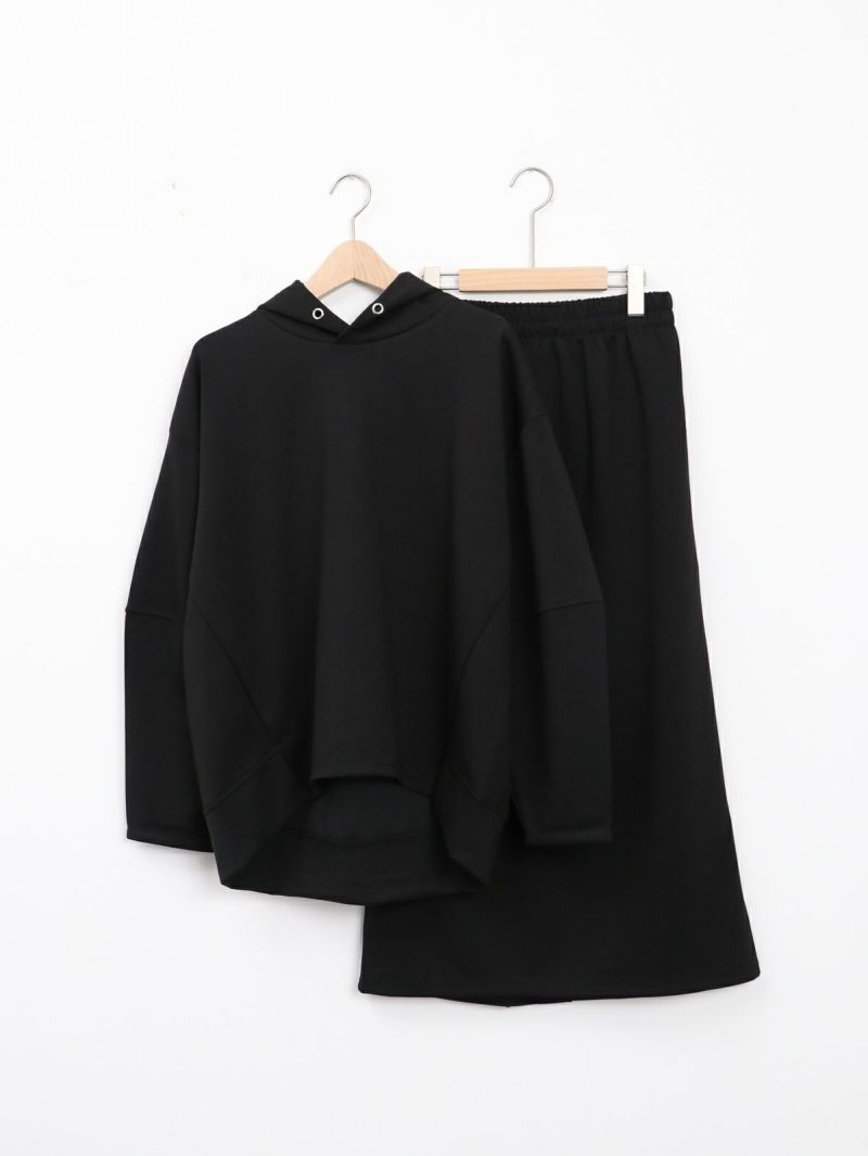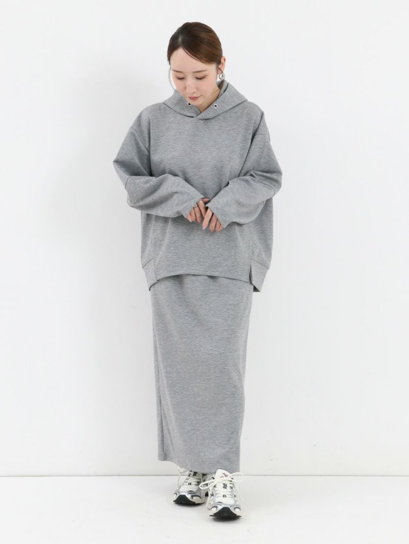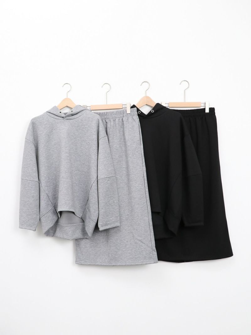 立体感とハリのある風合いが特徴のダンボールニット素材を使用した、フーディーとスカートのセットアップ。軽やかでシワにもなりにくくストレッチ性もあるため日常使いにもおすすめです。