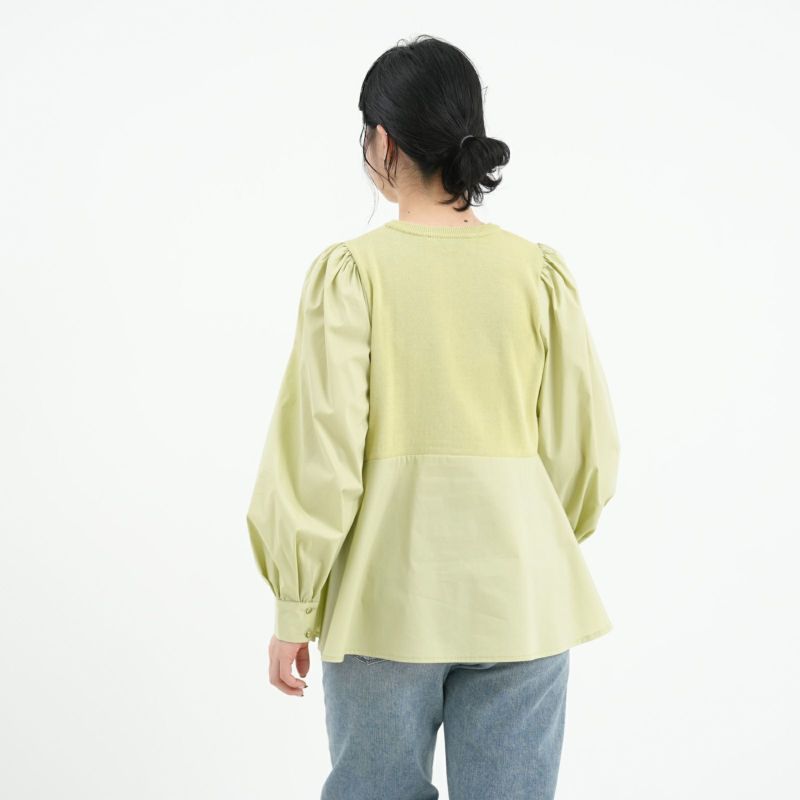ニットとシャツをハイブリッドした裾ぺプラムトップス。