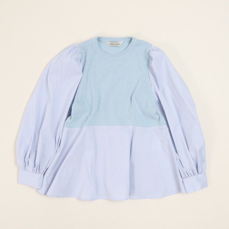 ニットとシャツをハイブリッドした裾ぺプラムトップス。
