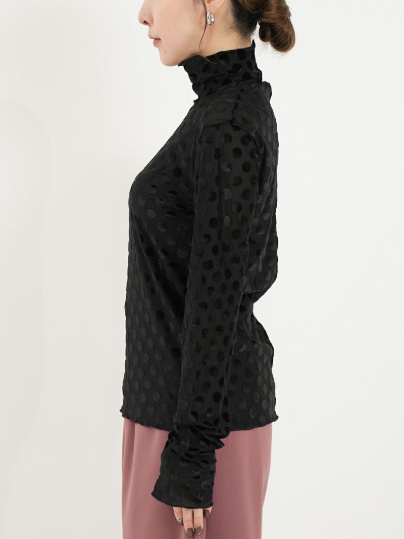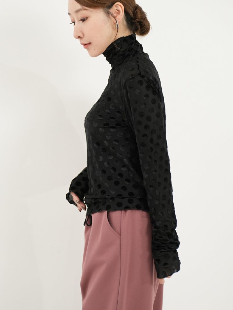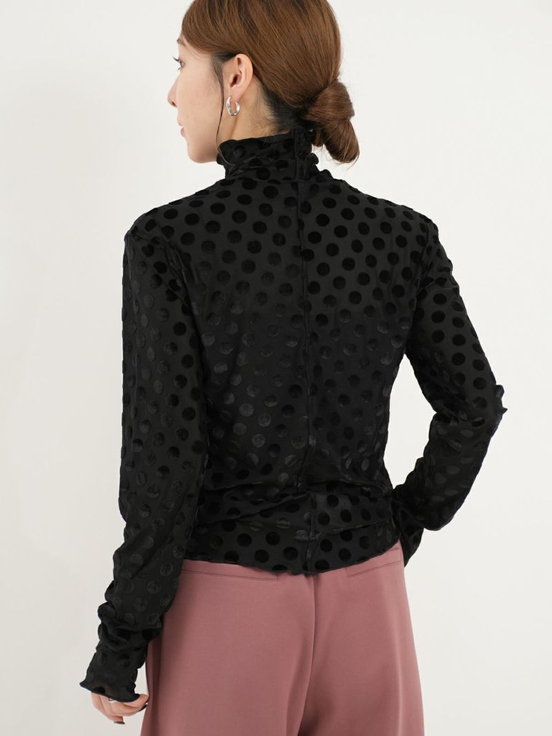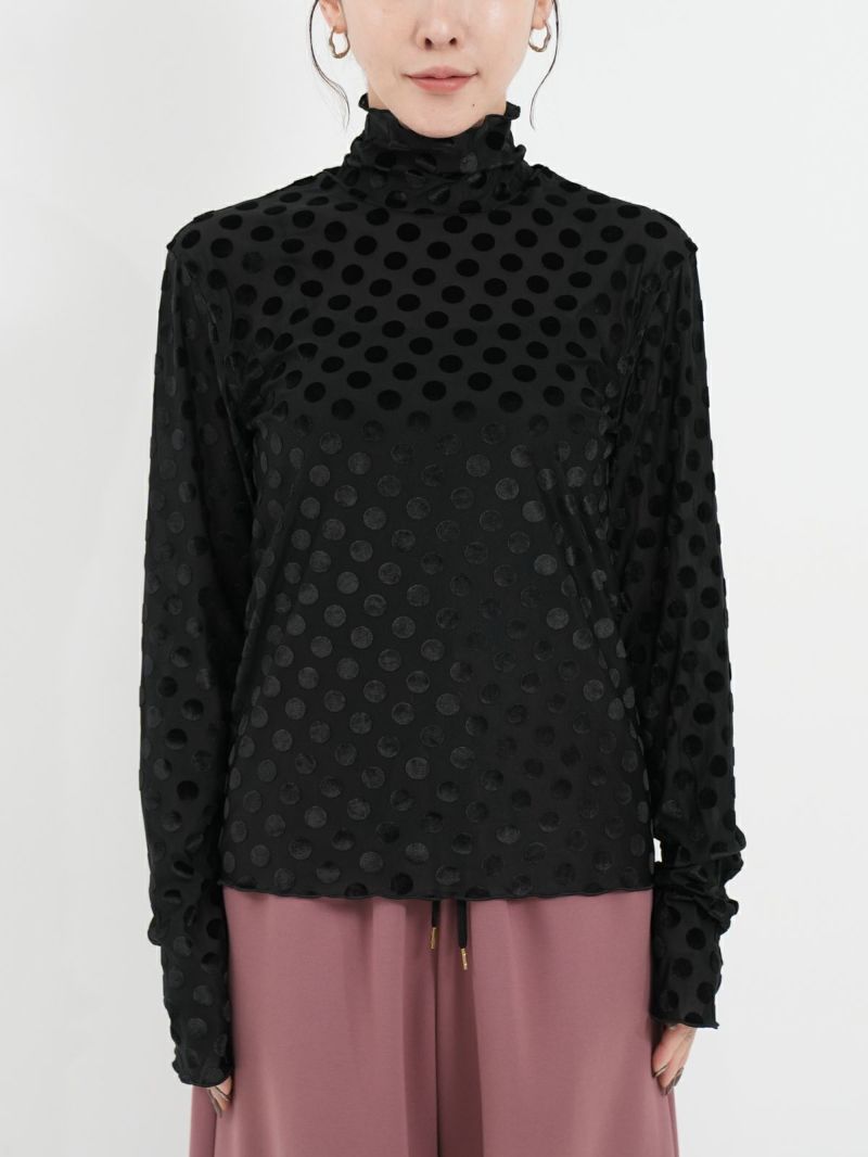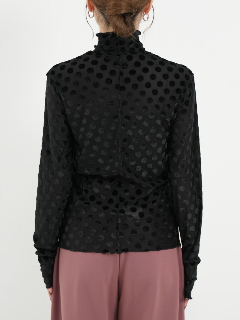 ドットのシースルーインナー。 微光沢のドットを施した生地は1枚で大人モードな雰囲気が漂います。ジャケットを合わせたり、デニムを合わせたり、いつもの無地インナーに変わって取り入れるだけで新鮮なアイテム。ほどよい透け感がとても可愛いのでお勧めです。