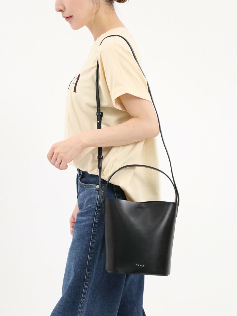 艶のあるW FACE レザーが映えるシンプルな楕円形のバケットバッグ。 端正な縦長フォルムに柔らかなカーブを描くシルエットが、ミニマルでありながらも温かみのある印象を与えます。 開閉はマグネット仕様でスムーズ。コンパクトな見た目ながら、500mlのペットボトルや長財布、ミニポーチなどの必需品がしっかり収まり、実用性にも優れています。 長さ調整可能なストラップと、手持ちできるトップハンドルを備えた2WAYデザイン。 コーディネートやシーンに合わせて、斜め掛け・肩掛け・ハンドキャリーと多彩にアレンジできます。 日常使いにちょうどよく、シンプルな着こなしを品よくまとめてくれるバッグです。