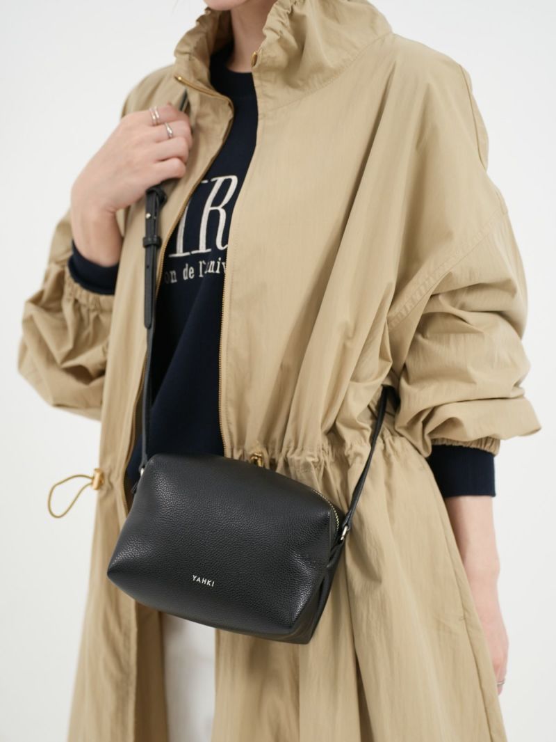SOFT SHRINK レザーのクロスボディバッグ。 すっきりとしたフォルムに、両サイドの縫製がさりげないアクセントになったミニショルダーです。 一見シンプルながら、立体感のあるシルエットがどの角度から見ても美しく、ミニマルな中に個性が宿るデザインです。 本体にはシボ感のある床革を使用。軽量で肩掛けしやすく、コンパクトながらスマートフォンやミニ財布、鍵などの必需品がしっかり収まります。 ストラップは長さ調節が可能で、斜めがけにも対応。毎日のスタイルに寄り添う、飽きのこないベーシックアイテムです。
