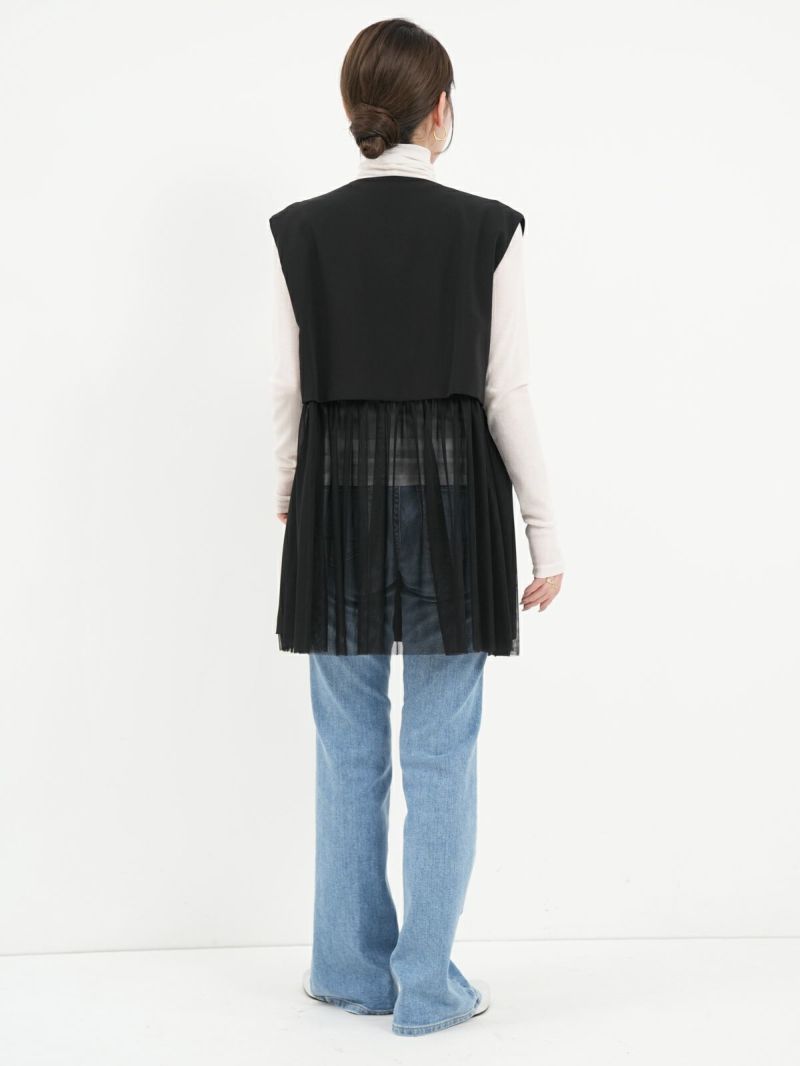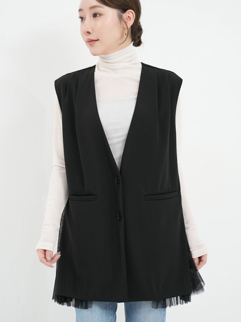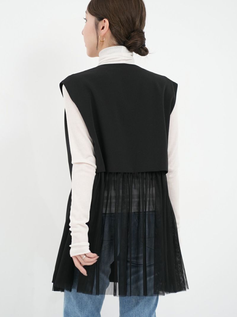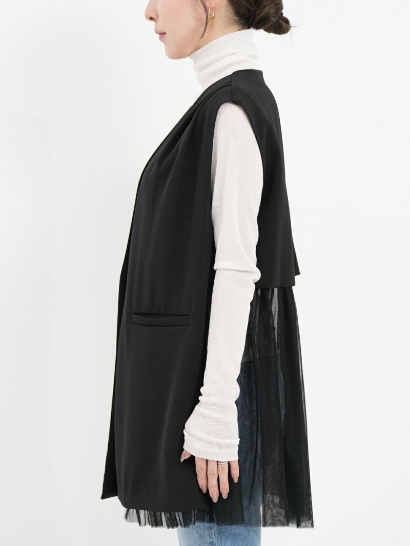 前裾サイドから覗くチュールがアクセント、後ろはハイウエスト位置からの切り替えデザインです。肩にもタックを施しキレイで落ち感のあるシルエットに見せてくれます。