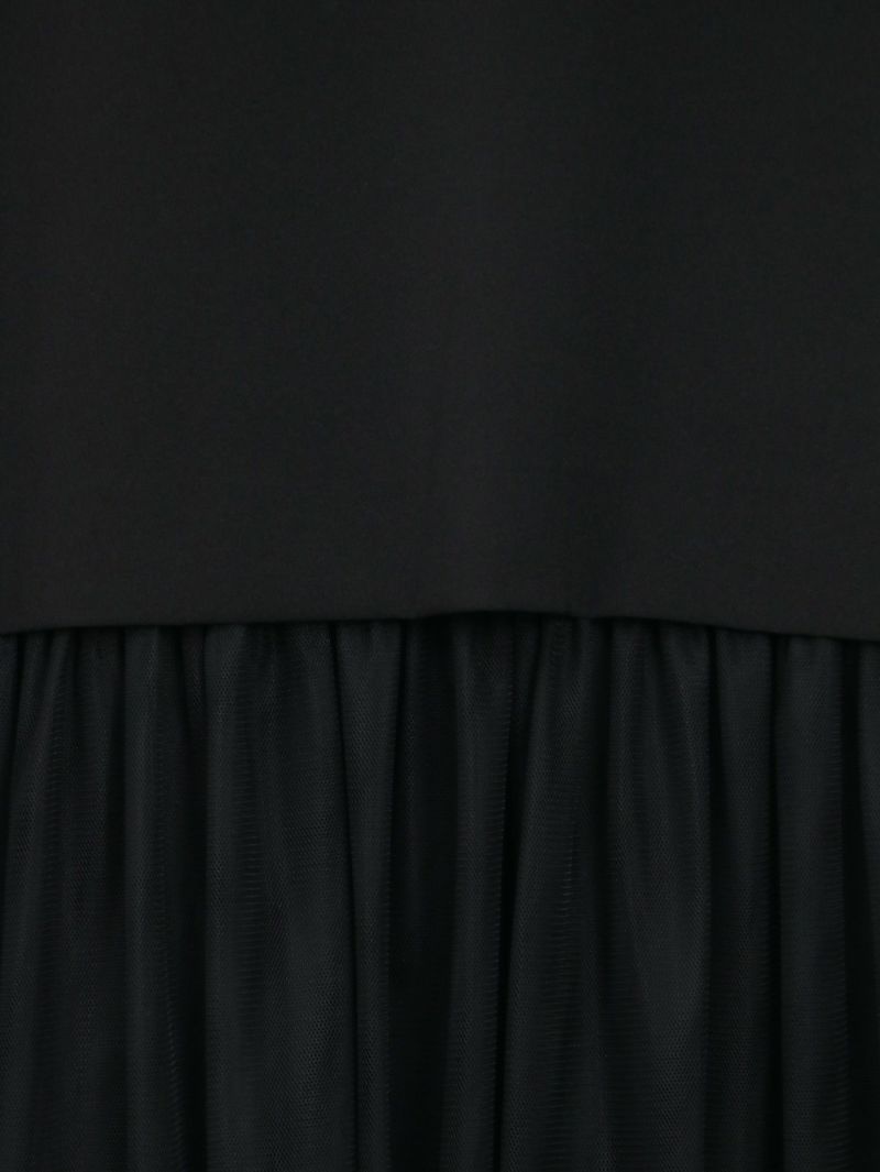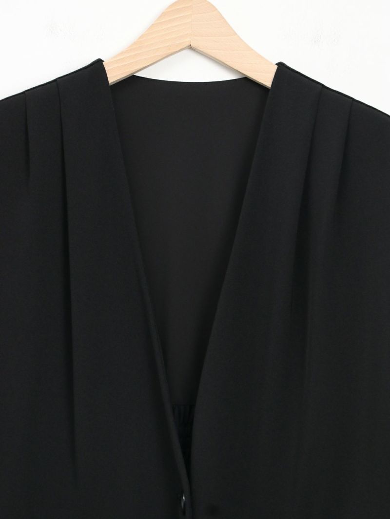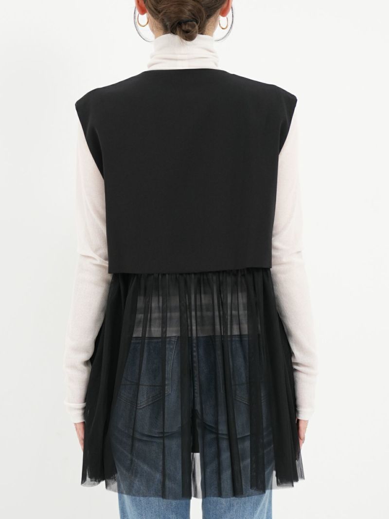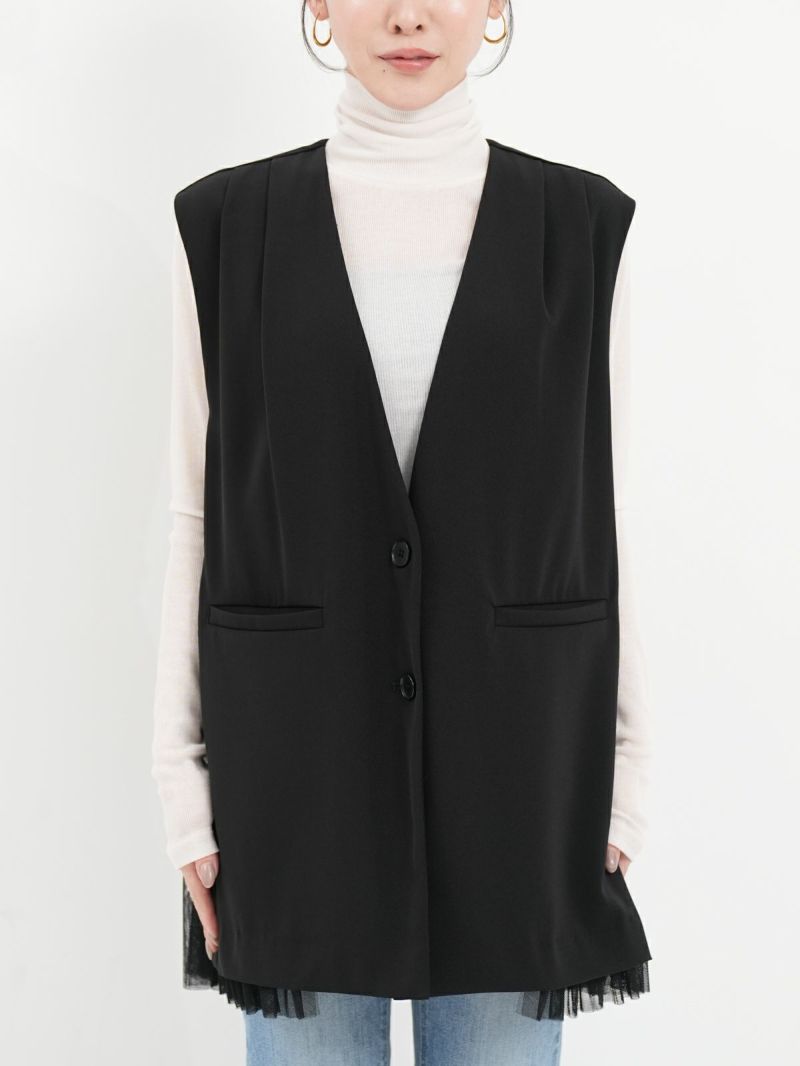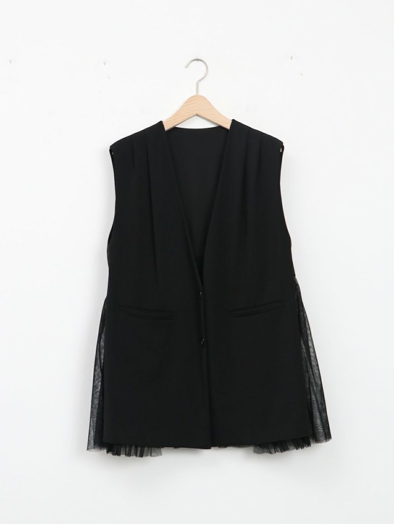 前裾サイドから覗くチュールがアクセント、後ろはハイウエスト位置からの切り替えデザインです。肩にもタックを施しキレイで落ち感のあるシルエットに見せてくれます。