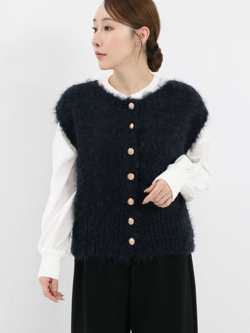 テクニック無しで着映える金ボタンのニットベスト。柔らかい肌触りが特徴で、程良い開きのクルーネックタイプ。