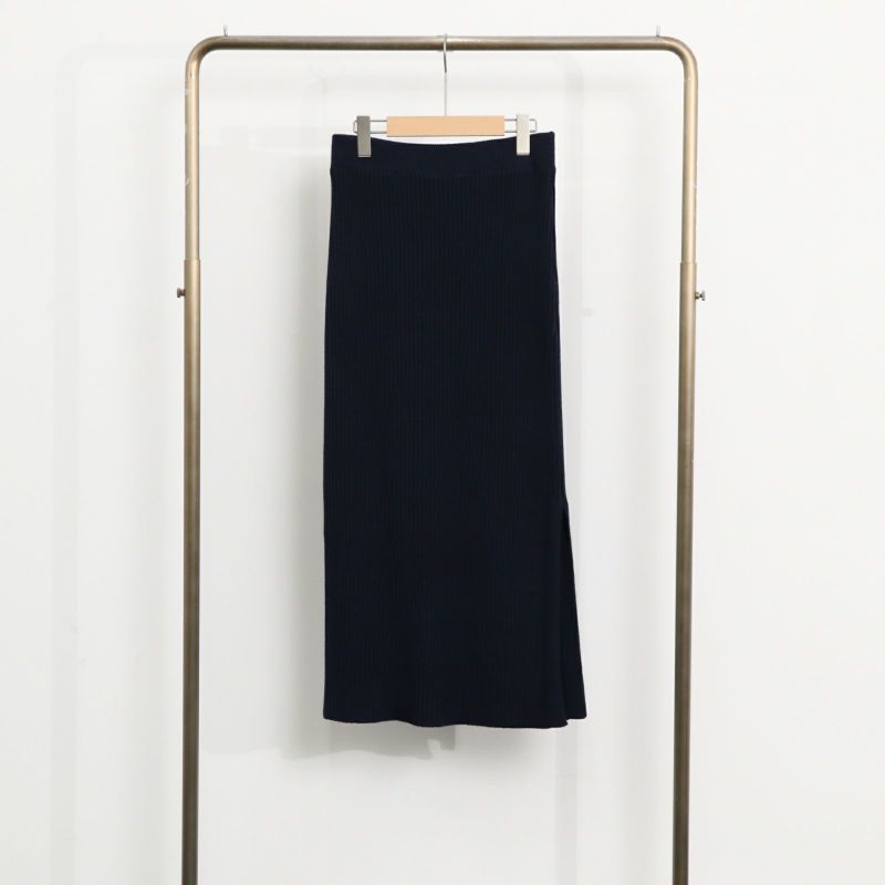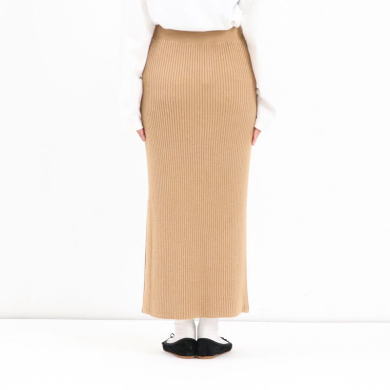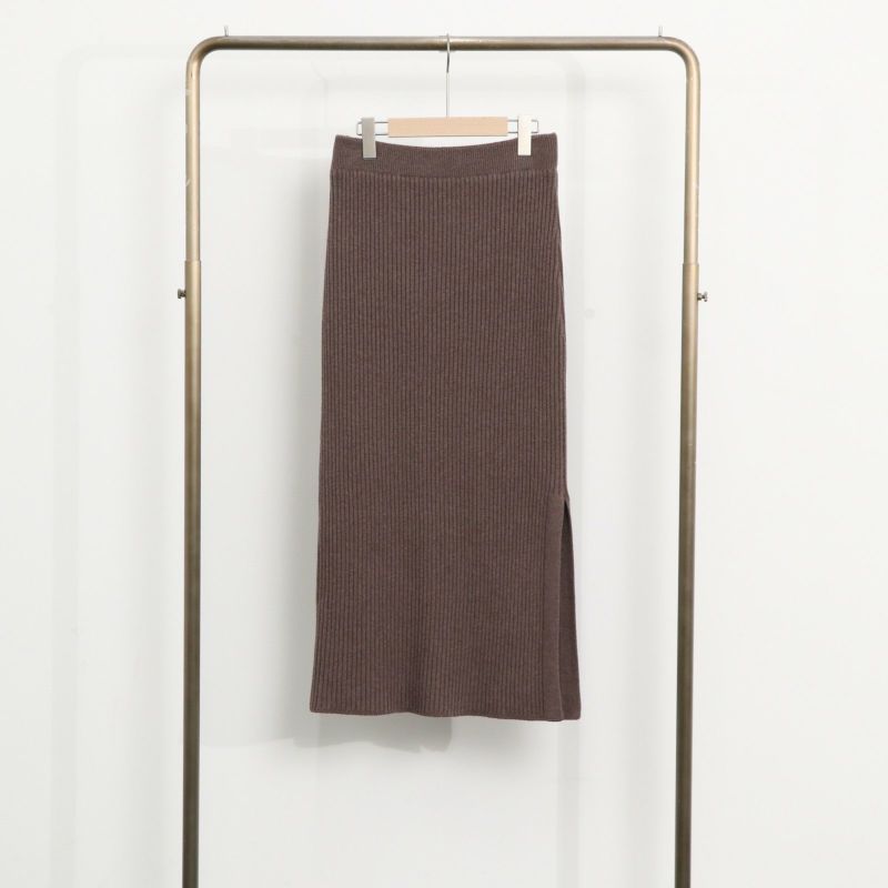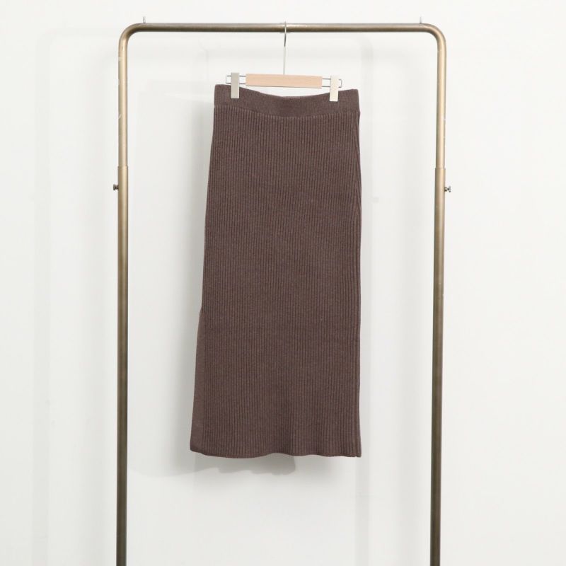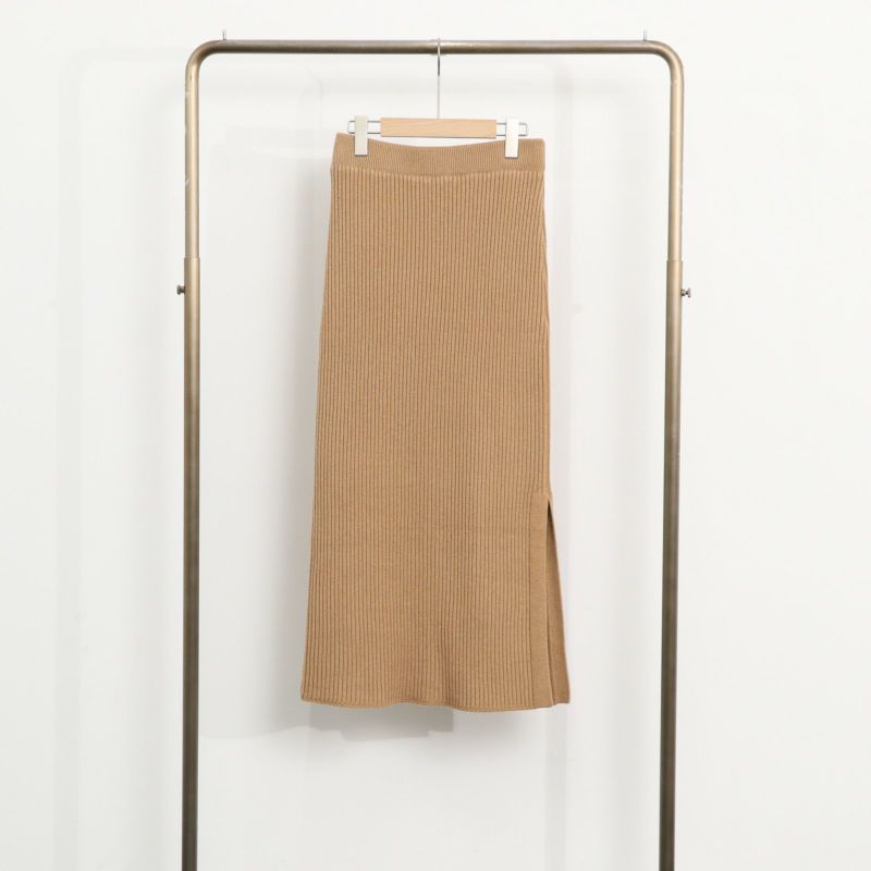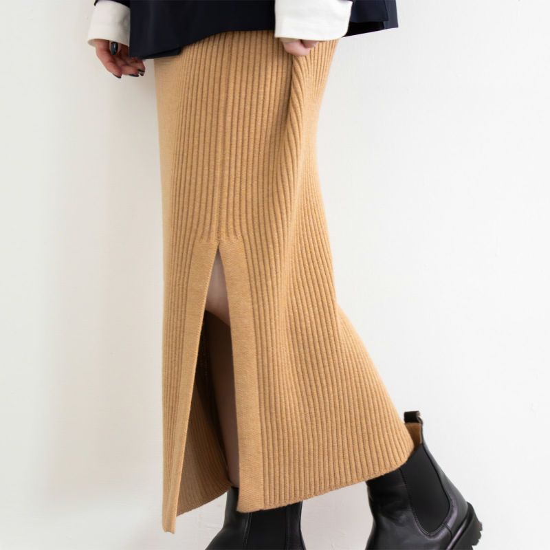 9月展開のニットカーディガン(BD_FK23A-016)と同素材のリブニットスカート。 伸縮性のあるリブ編みとウエストゴムでストレスフリーな穿き心地。Iラインシルエットとサイドスリットで大人っぽく着こなせます。ゆるっとスウェットに足元はブーツで締めるスタイルなどもおすすめです。