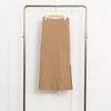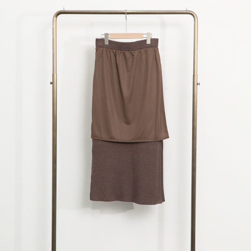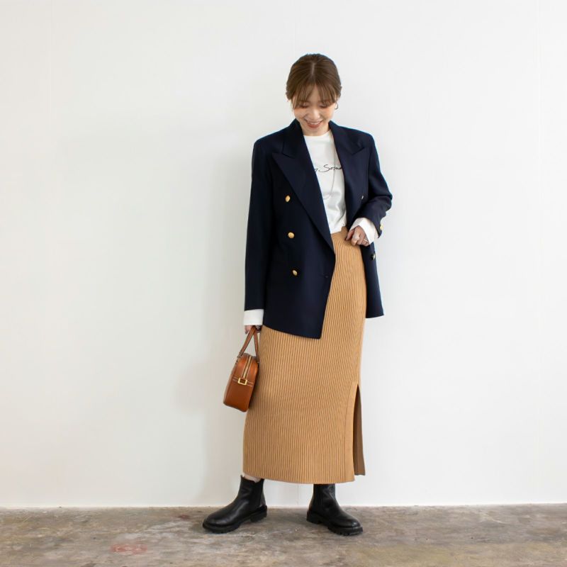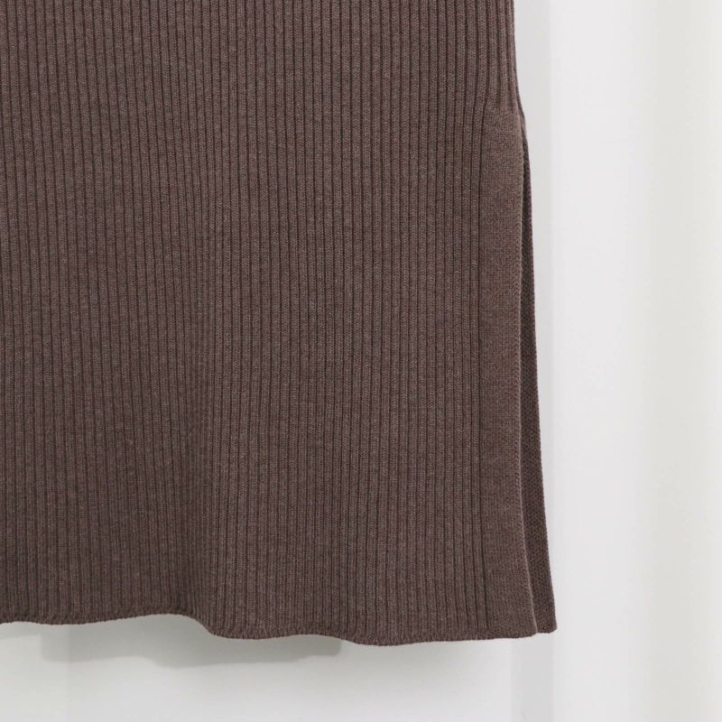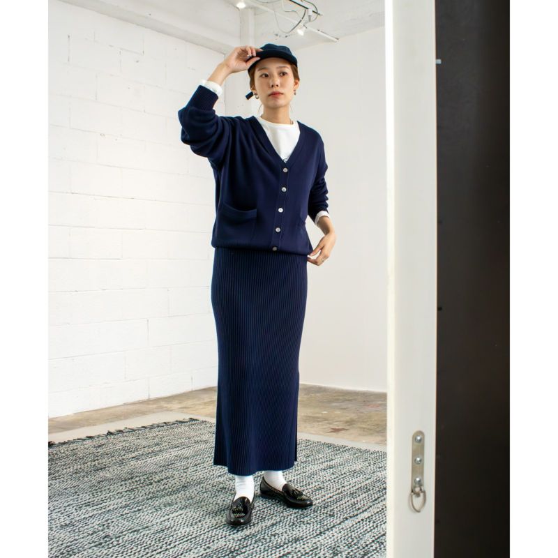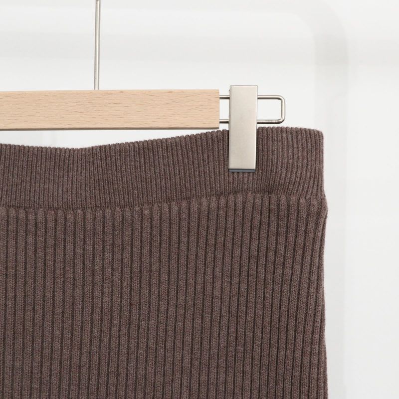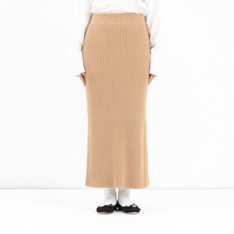 9月展開のニットカーディガン(BD_FK23A-016)と同素材のリブニットスカート。 伸縮性のあるリブ編みとウエストゴムでストレスフリーな穿き心地。Iラインシルエットとサイドスリットで大人っぽく着こなせます。ゆるっとスウェットに足元はブーツで締めるスタイルなどもおすすめです。
