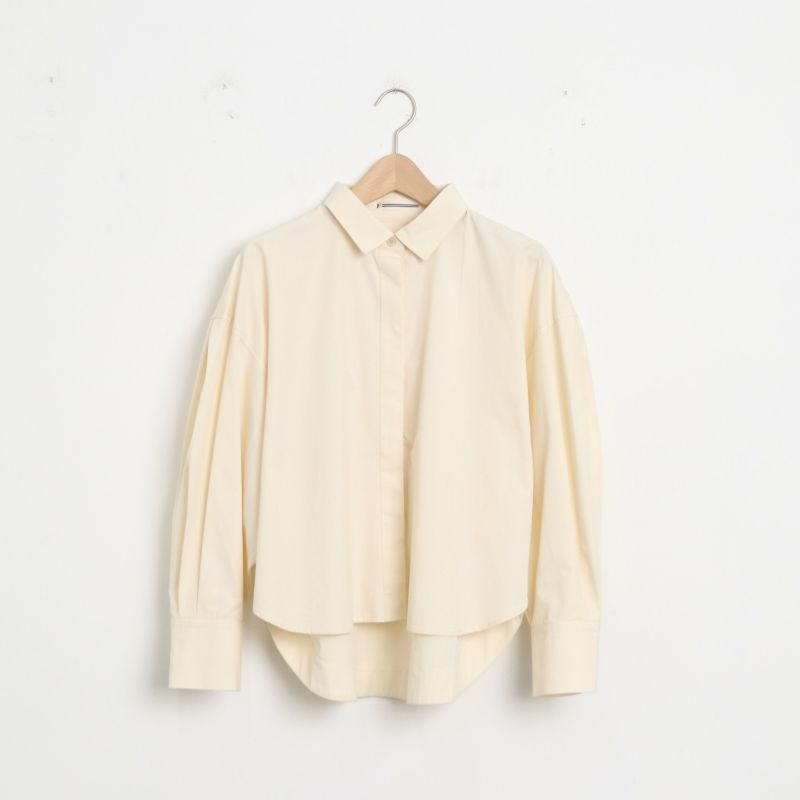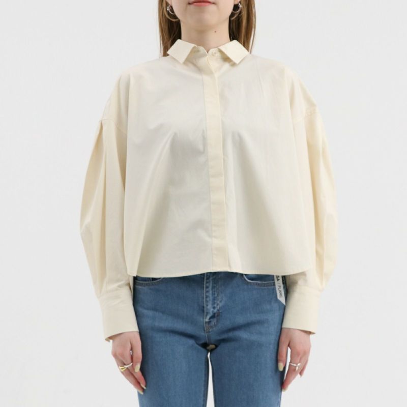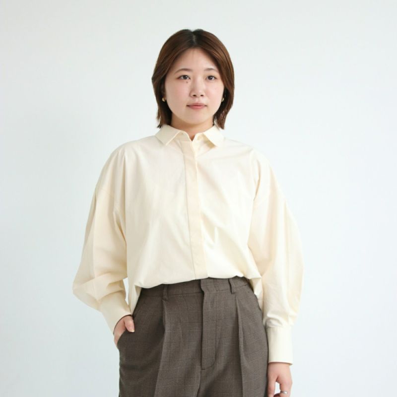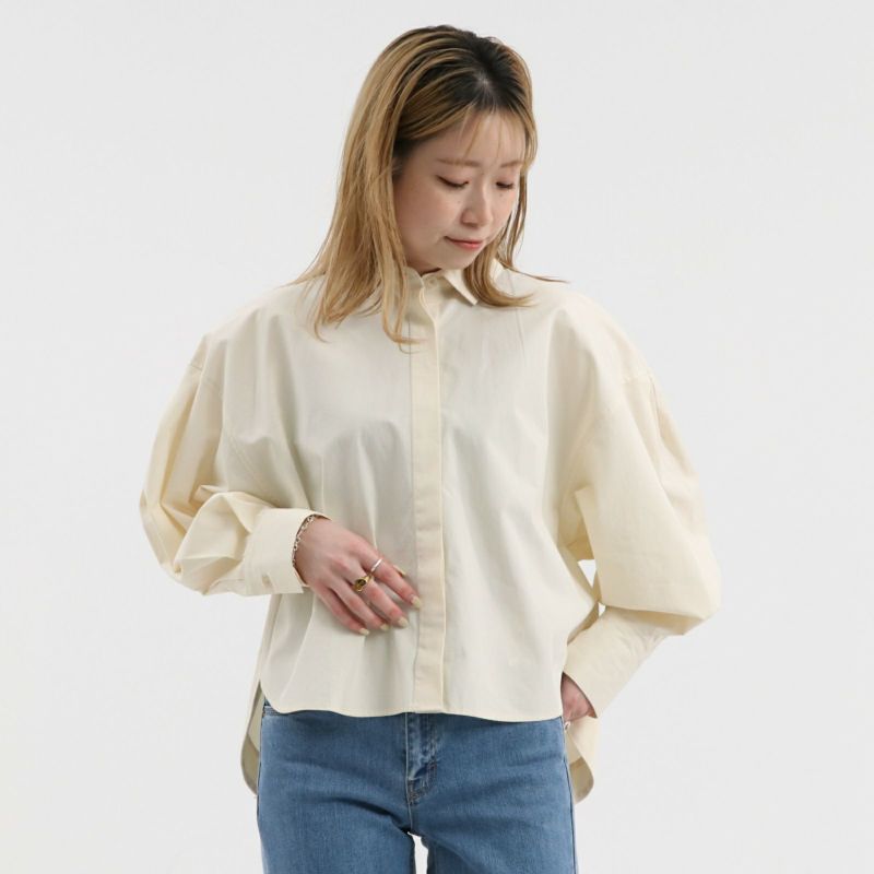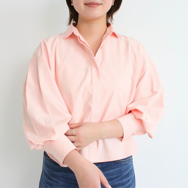 たっぷりと分量感のある袖がトレンド感のあるブラウス。 身頃は限りなくシンプルにすることで、幅広い着こなしが可能です。程よいハリ感のある素材を採用し、ボリュームスリーブを美しくみせてくれます。