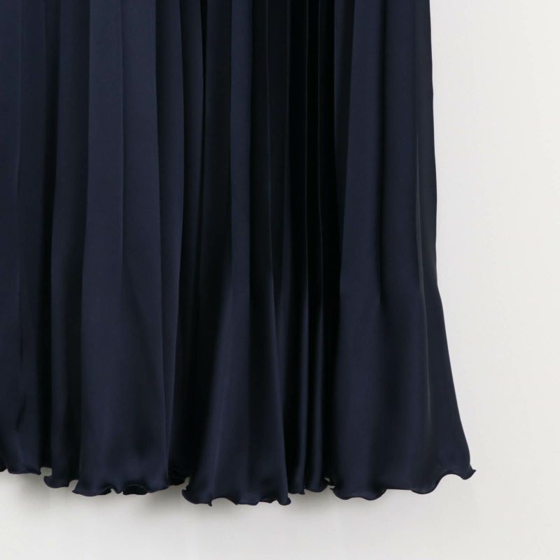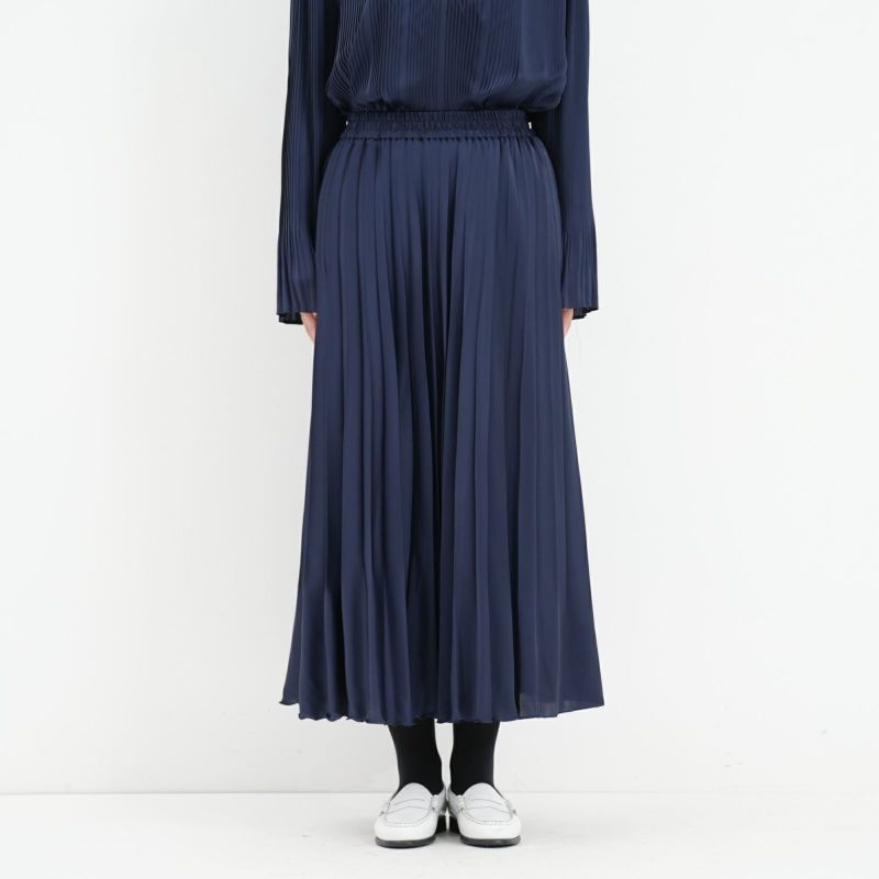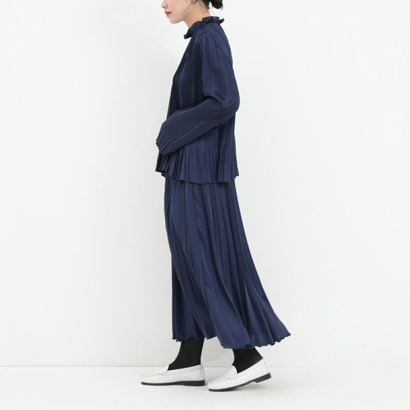 国内外の有名ブランドなどで活躍されているデザイナーからも支持されている福岡のプリーツ専門メーカーオザキプリーツで生産したアイテム。 華やかな光沢感とソフトな風合いが上品なプリーツのトップスとロングスカート。ロングスカートは裾消しプリーツで軽やかな表情があります。プリーツブラウス(BD_FK24S-019) と同素材で作っているため、セットアップでの着用がオススメです。オケージョンシーンでもお召いただけます。