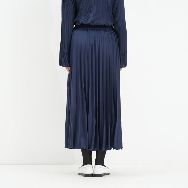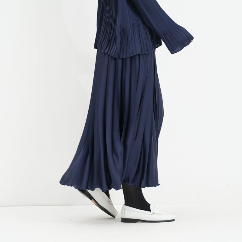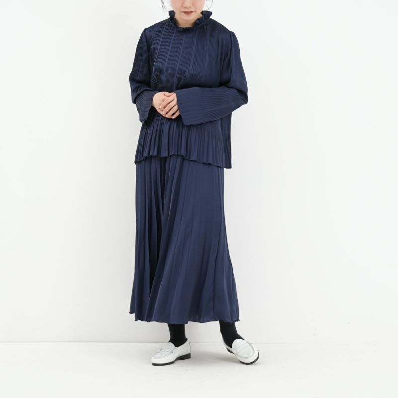 国内外の有名ブランドなどで活躍されているデザイナーからも支持されている福岡のプリーツ専門メーカーオザキプリーツで生産したアイテム。 華やかな光沢感とソフトな風合いが上品なプリーツのトップスとロングスカート。ロングスカートは裾消しプリーツで軽やかな表情があります。プリーツブラウス(BD_FK24S-019) と同素材で作っているため、セットアップでの着用がオススメです。オケージョンシーンでもお召いただけます。