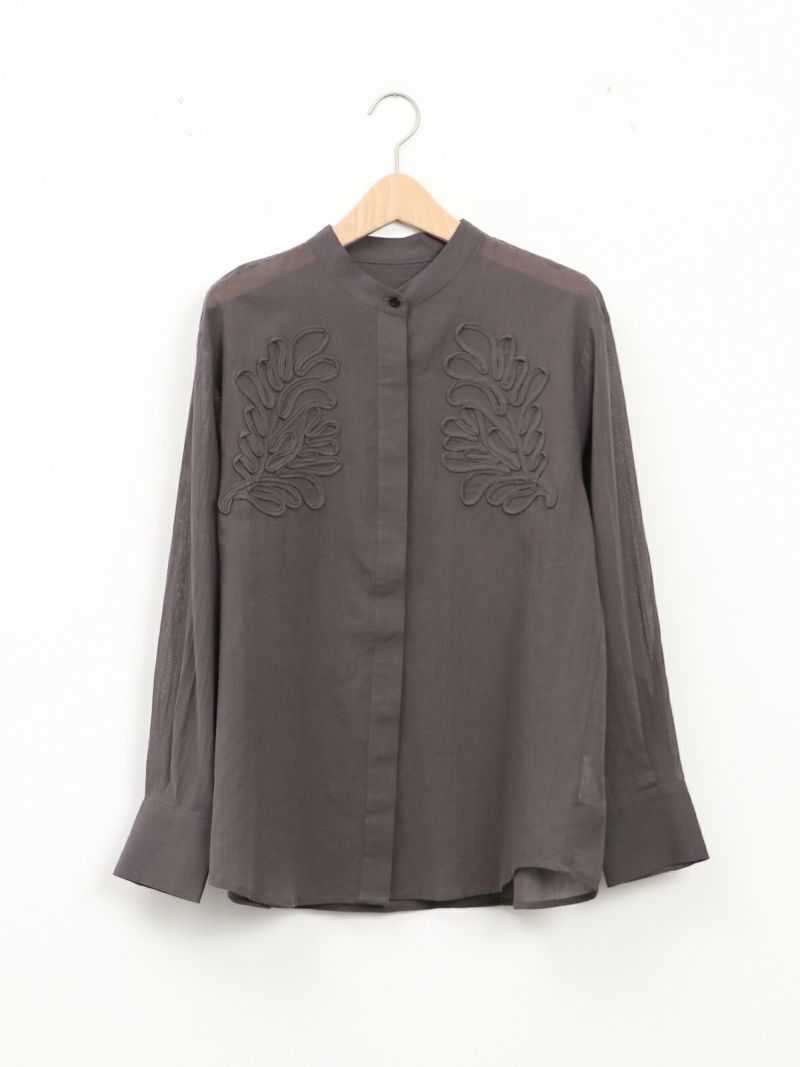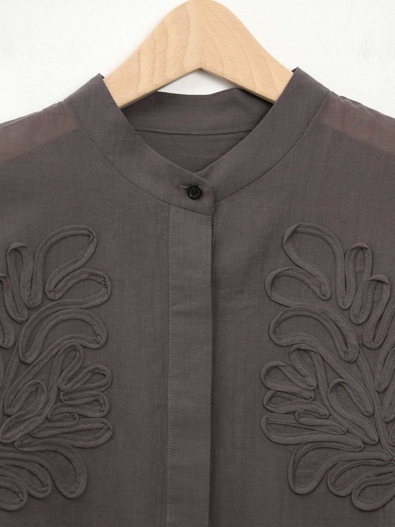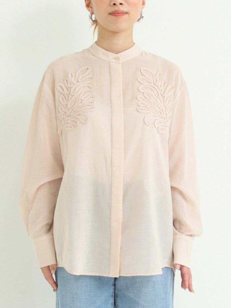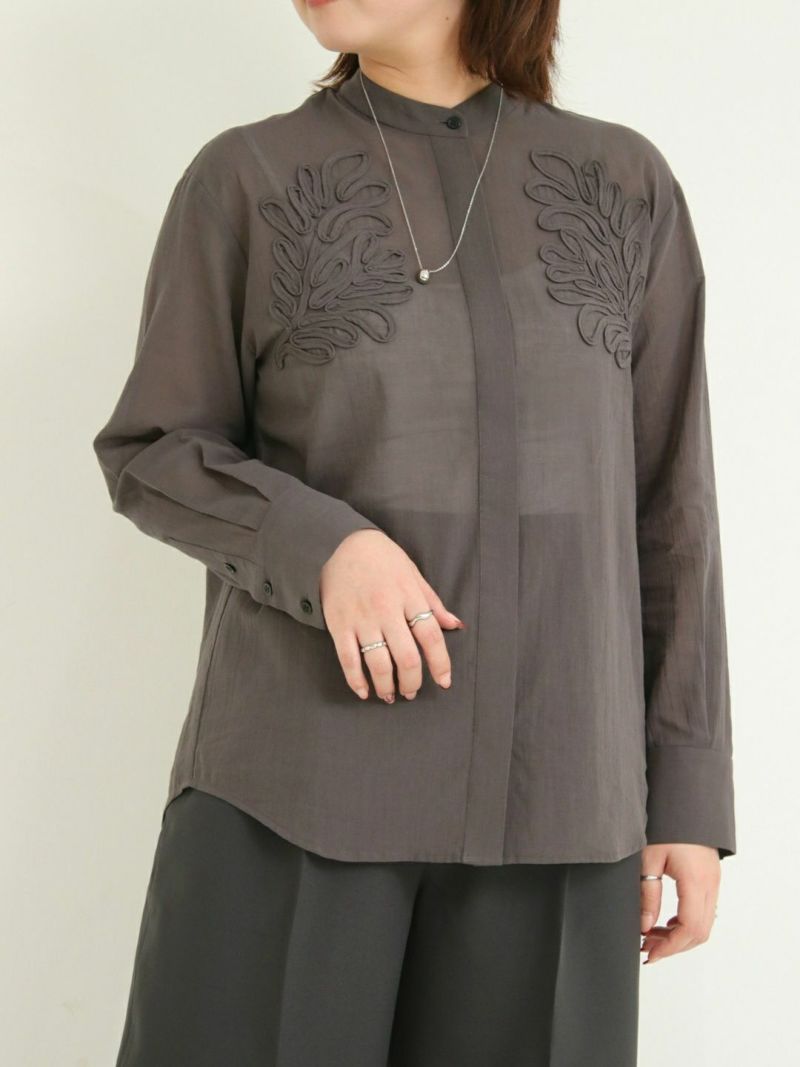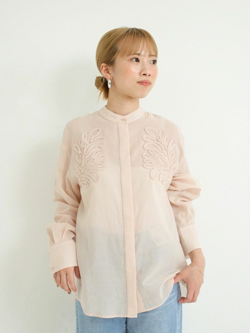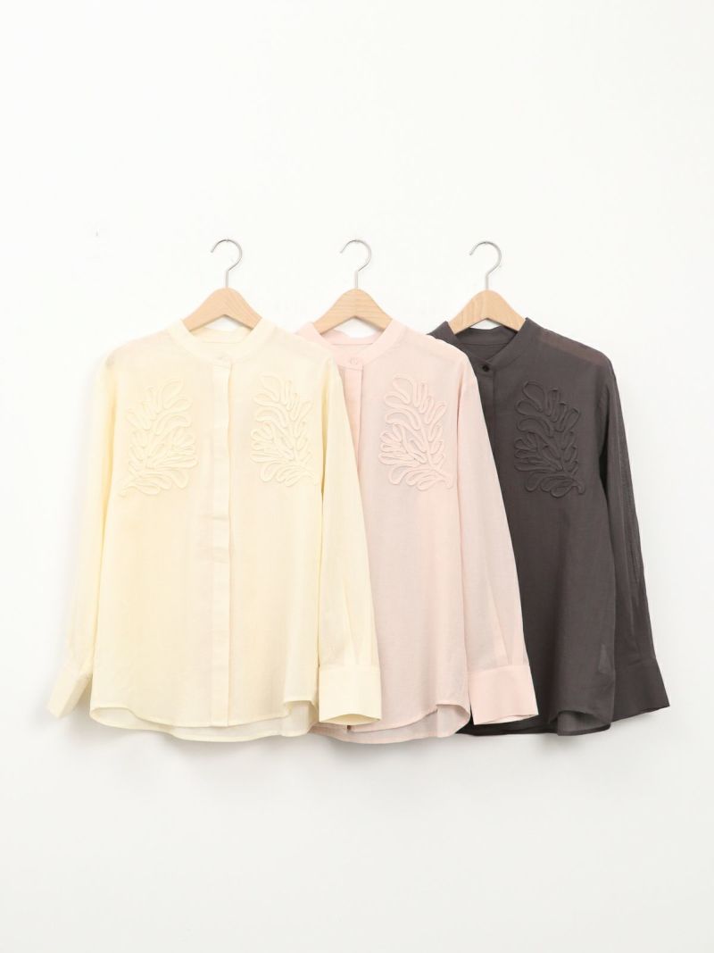 立体感のある刺繍がポイントのブラウス。 軽やかで透け感のある素材が絶妙なバランスです。 バンドカラーとヒヨクボタンで、刺繍を引き立てています。 体のラインを拾いにくく、上品なきれいめシルエット。 日焼けや冷房対策にもおすすめです◎