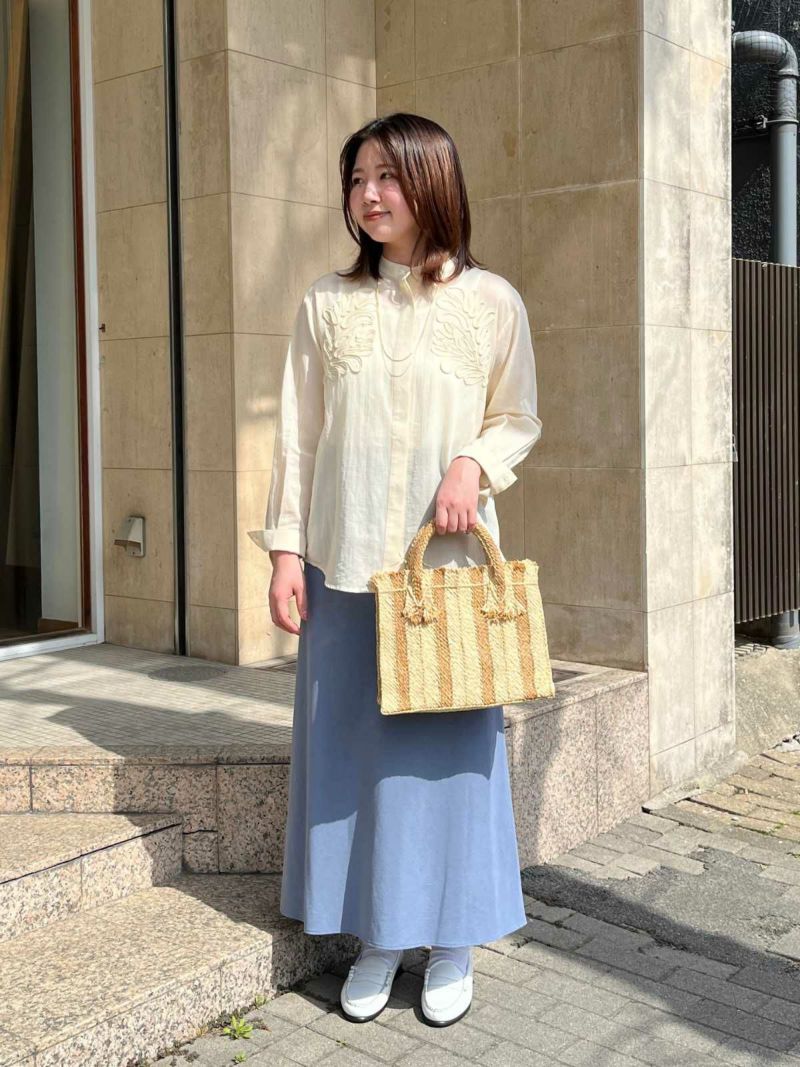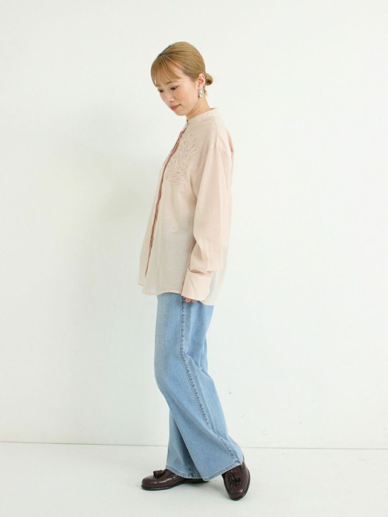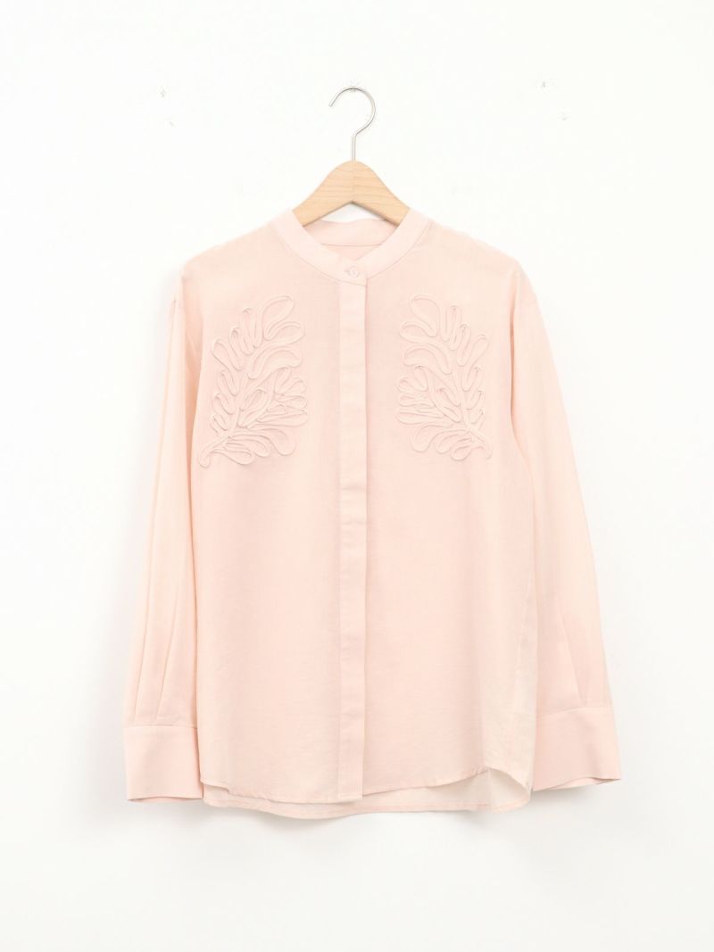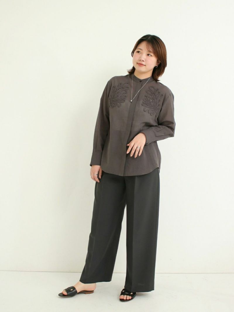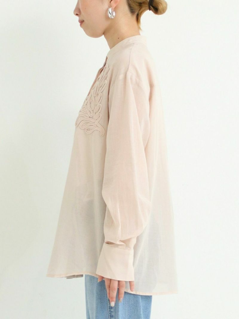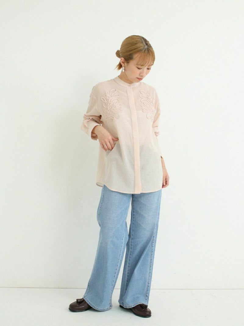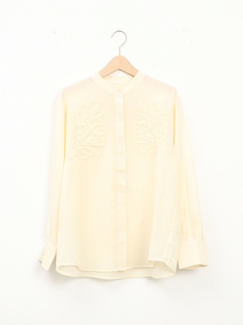 立体感のある刺繍がポイントのブラウス。 軽やかで透け感のある素材が絶妙なバランスです。 バンドカラーとヒヨクボタンで、刺繍を引き立てています。 体のラインを拾いにくく、上品なきれいめシルエット。 日焼けや冷房対策にもおすすめです◎