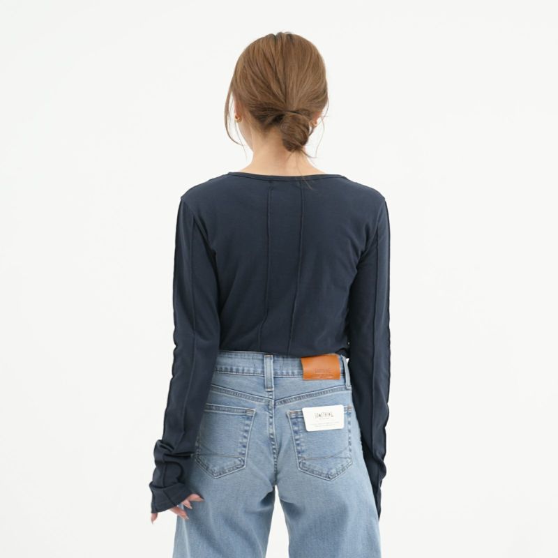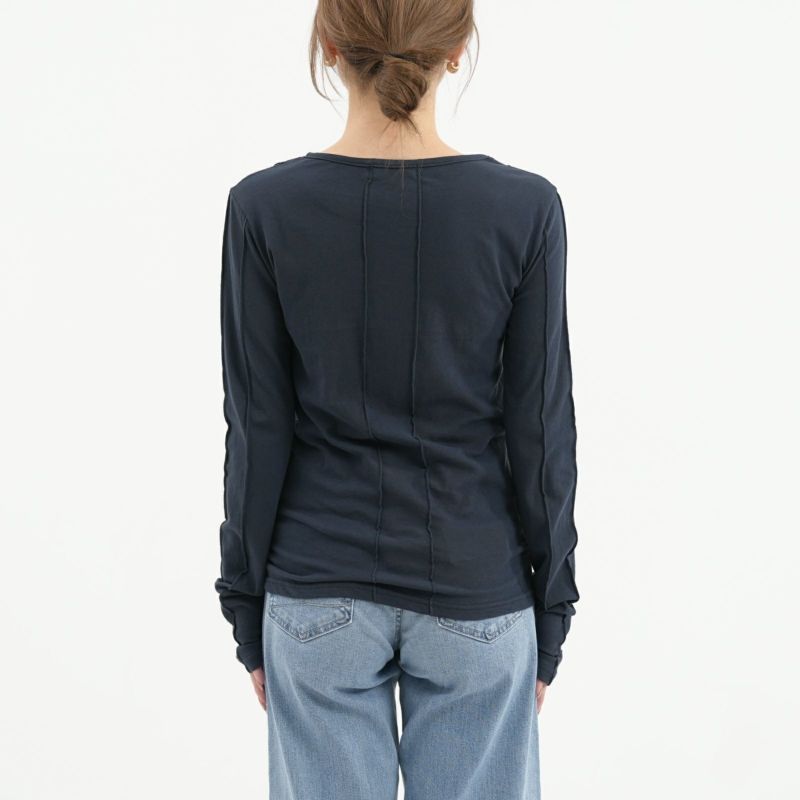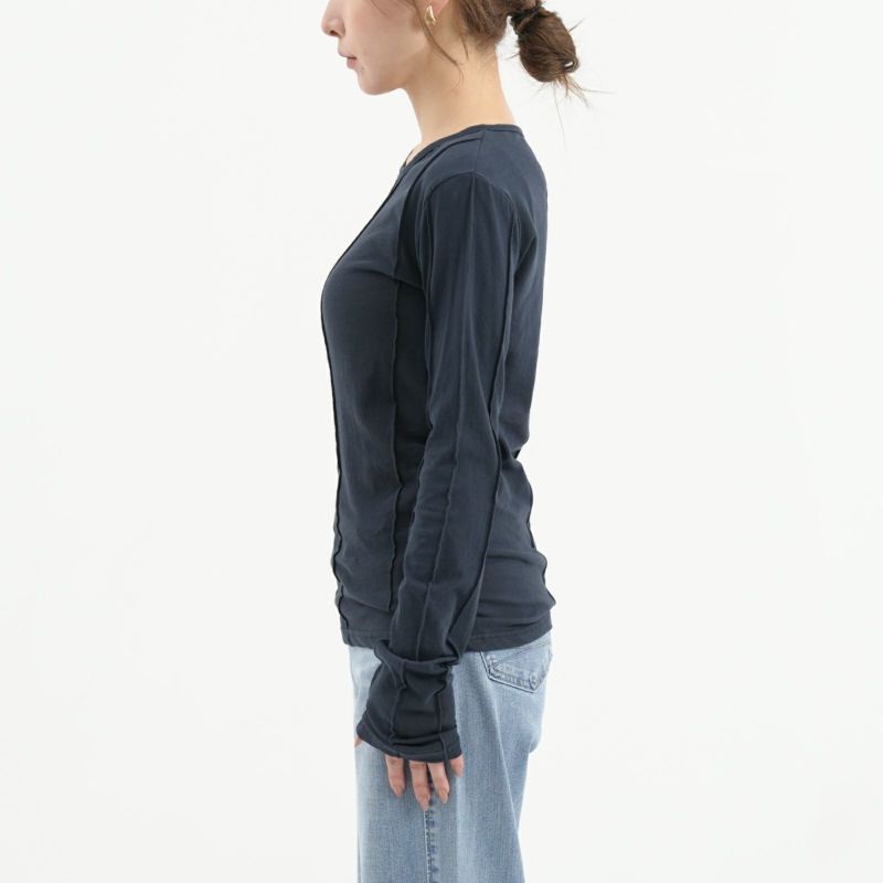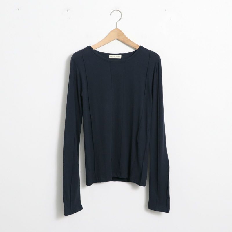 切り替えのラインが特徴的なロンT。 薄手ながらも控えめなシアー感で、1枚ではもちろんインナー使いもしやすいアイテムです。 袖は長め、襟元は横に広めですっきり着用していただけます。