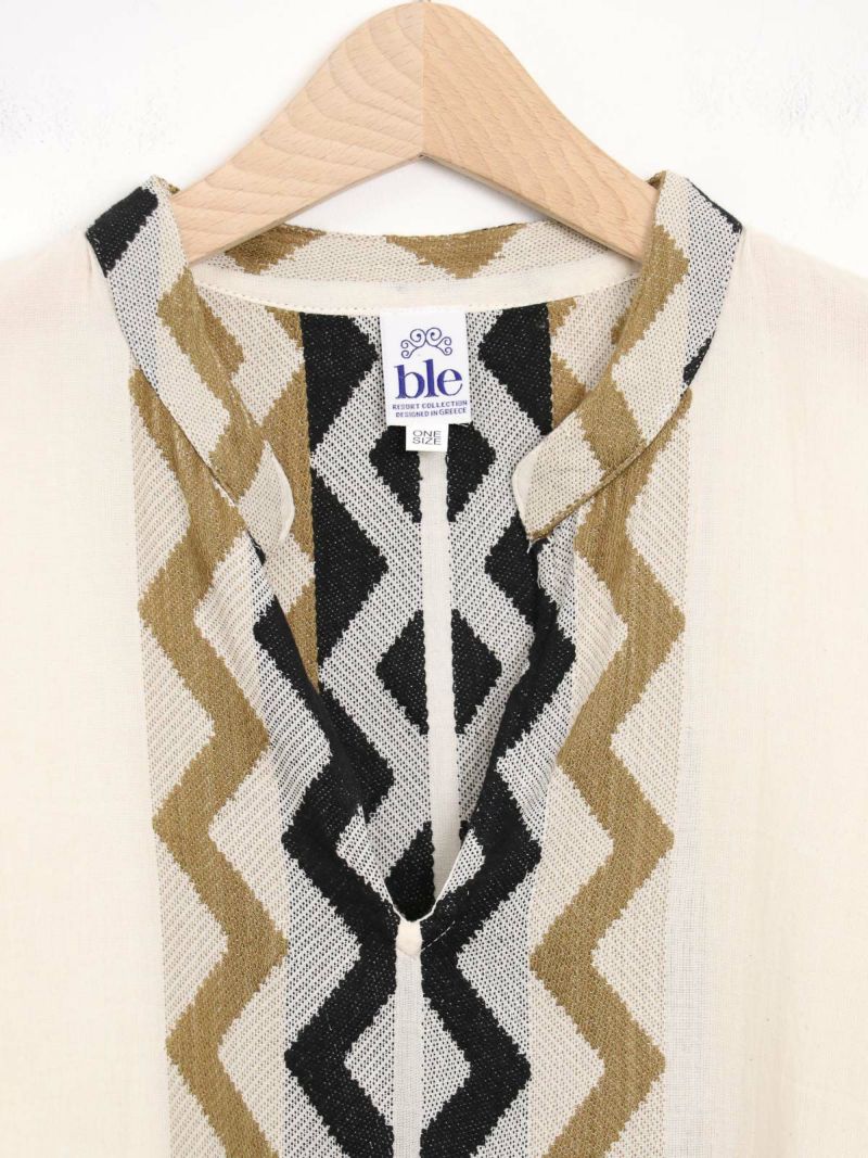 インド綿の風合いが魅力のチュニック丈ワンピース。 1枚で着ても、デニムなどをレイヤードするのもオススメな、この夏により一層映えるアイテム。 ナチュラルな配色と波線のデザインがエスニックな雰囲気のある1枚です。 ひざ上ほどの丈で、袖のフレアデザインもポイント。