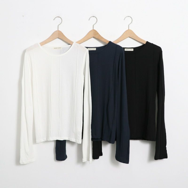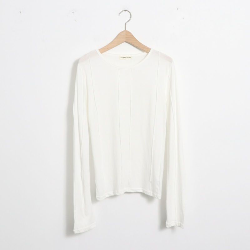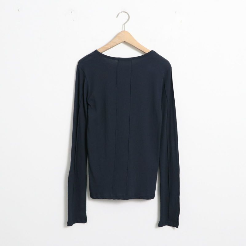 切り替えのラインが特徴的なロンT。 薄手ながらも控えめなシアー感で、1枚ではもちろんインナー使いもしやすいアイテムです。 袖は長め、襟元は横に広めですっきり着用していただけます。