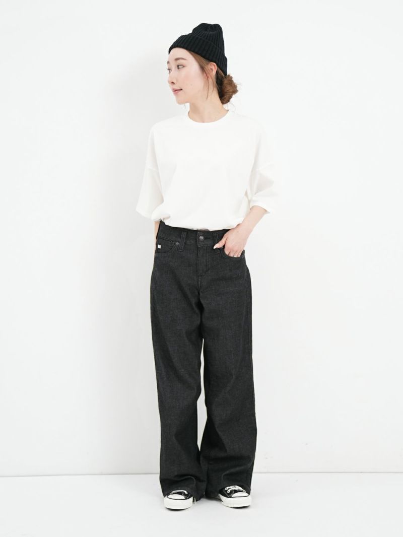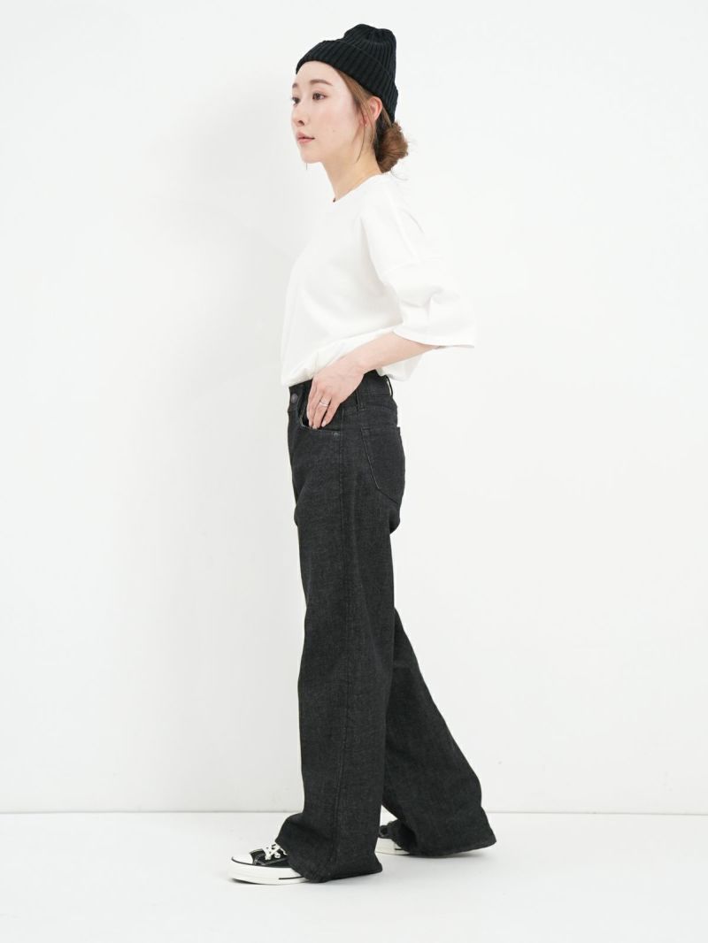 ミッドライズ、腰周りがコンパクトなすっきりワイドシルエット。 LISA WIDEと比較するとややすっきりとした脚周り。ベルト幅を太めにすることで、腰周りをコンパクトに見せ、フィット感もUP。初めてワイドパンツを穿かれる方や、ワイドでもすっきりと見せたい方にオススメしたい1本です。