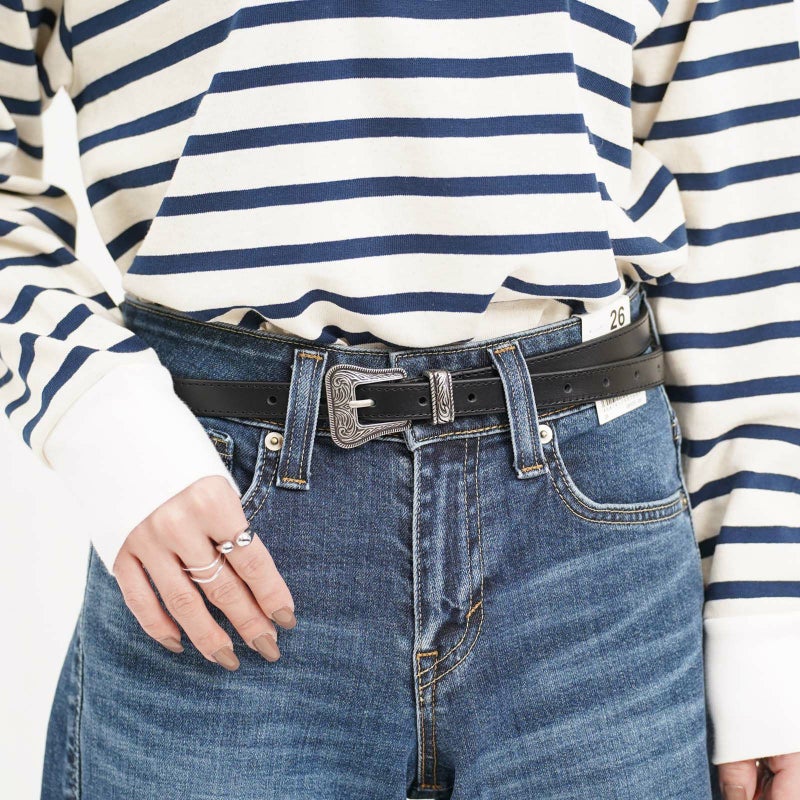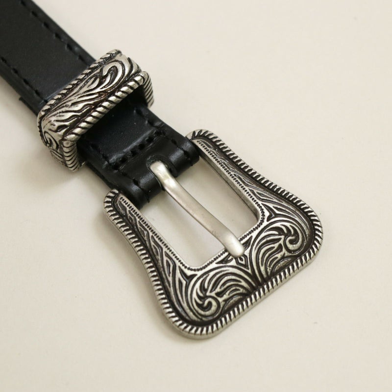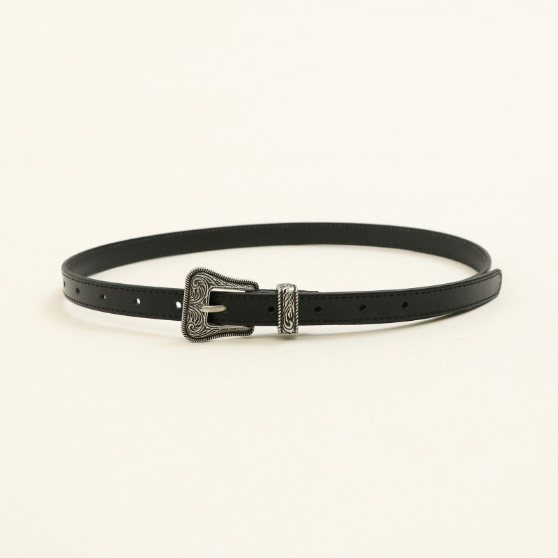 本革を使用したウエスタンベルト。 バックルと定革のデザインが特徴的で、シンプルなコーデにも映える1本。 ベルト本体はステッチが施されており、細めの幅ですっきりとした印象に◎