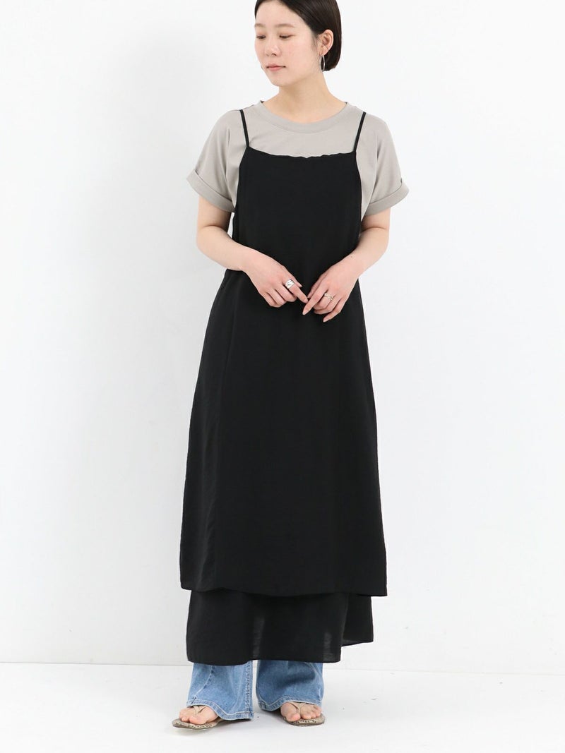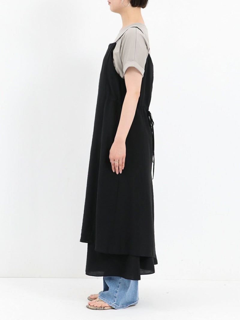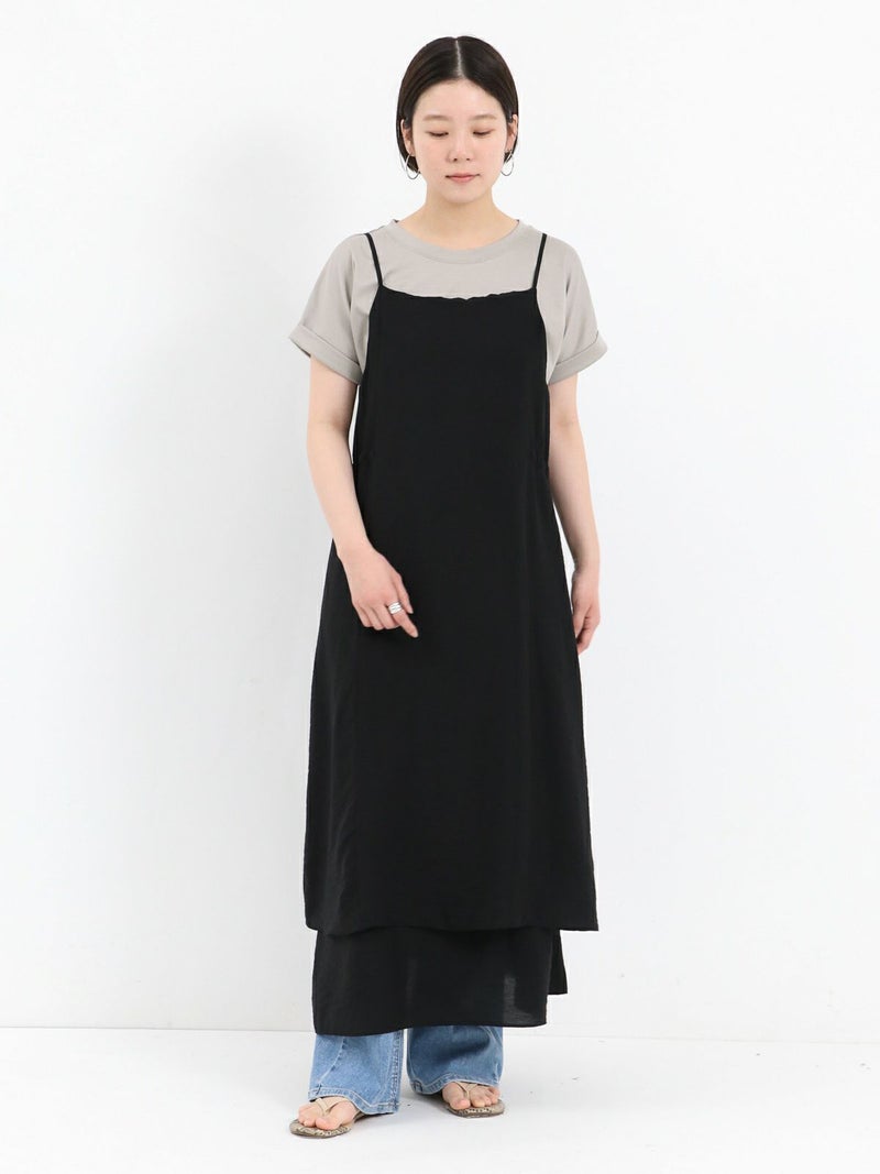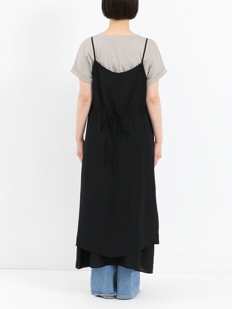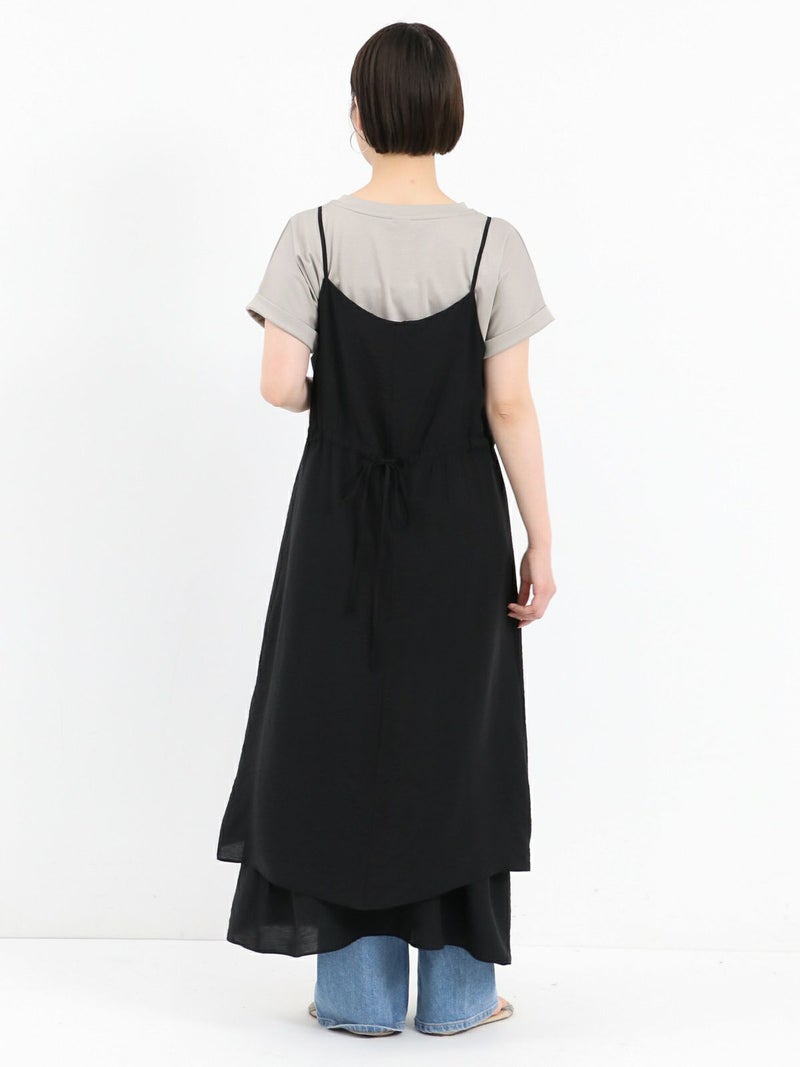 後ろリボンのシンプルなキャミワンピース。 わき腹から後ろまで入った紐を絞ることでウエストマークされ、スタイルアップして見えるワンピース。 シワ感のある生地で、カジュアルなコーデにも使いやすいアイテムです。 裾がティアードデザインになっているのもポイント。 パンツと合わせたレイヤードスタイルもオススメです。
