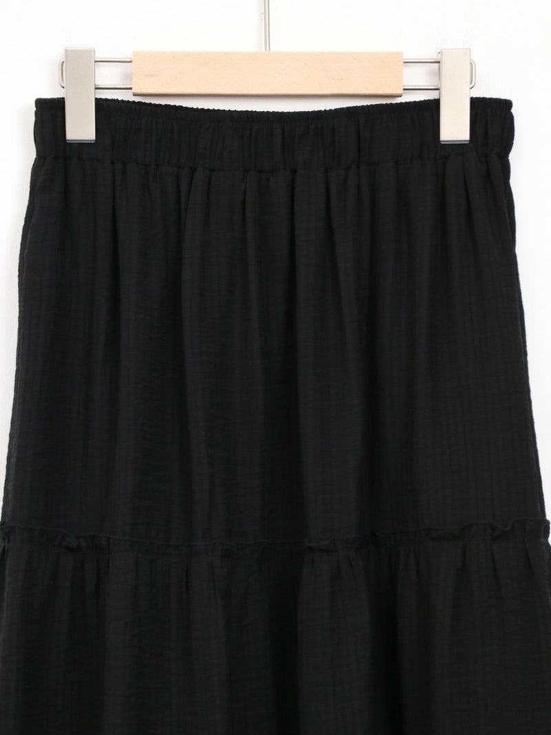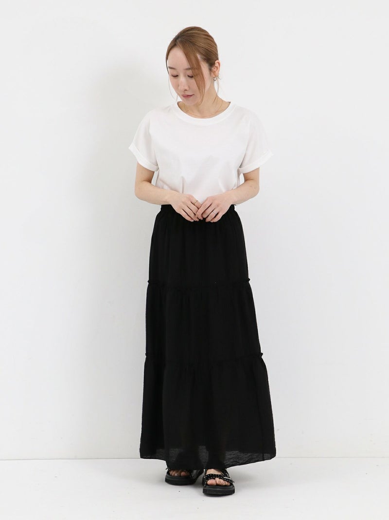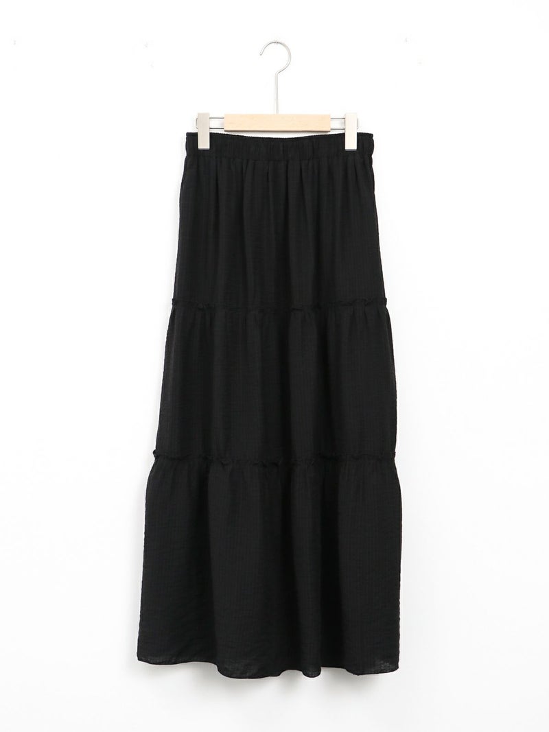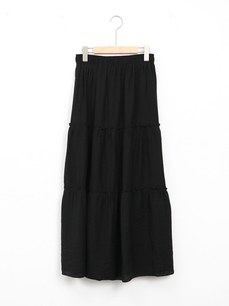 切替のフリルがアクセントのティアードロングスカート。 控えめなフリルデザインで甘くなりすぎず、使いやすいデザイン。 短めの丈感なので、低身長の方でもぴったりなサイズ感◎ パンツとのレイヤードスタイルもオススメです。 同色の裏地付きです。