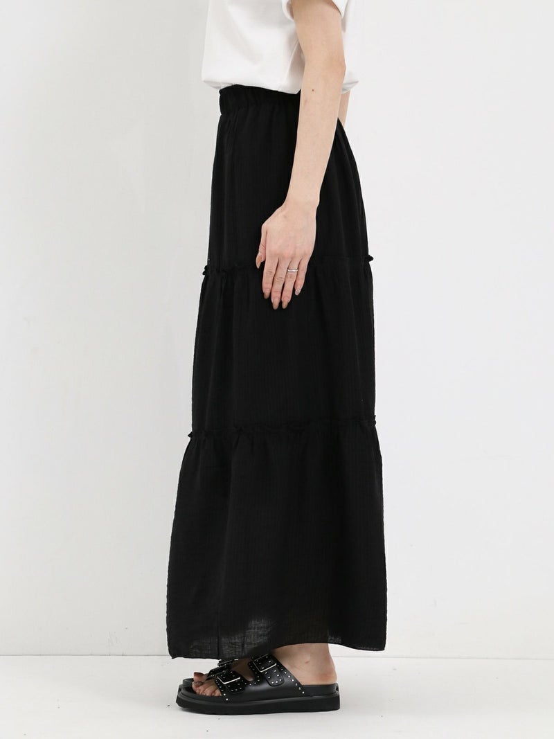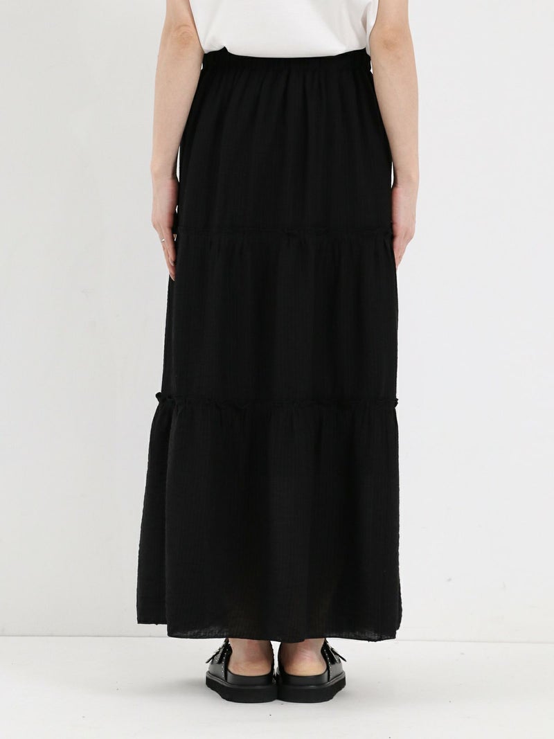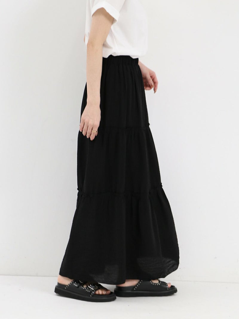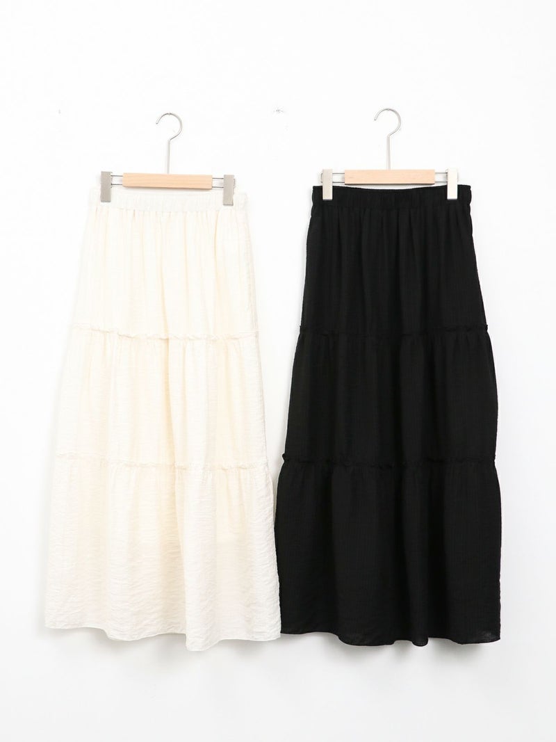 切替のフリルがアクセントのティアードロングスカート。 控えめなフリルデザインで甘くなりすぎず、使いやすいデザイン。 短めの丈感なので、低身長の方でもぴったりなサイズ感◎ パンツとのレイヤードスタイルもオススメです。 同色の裏地付きです。